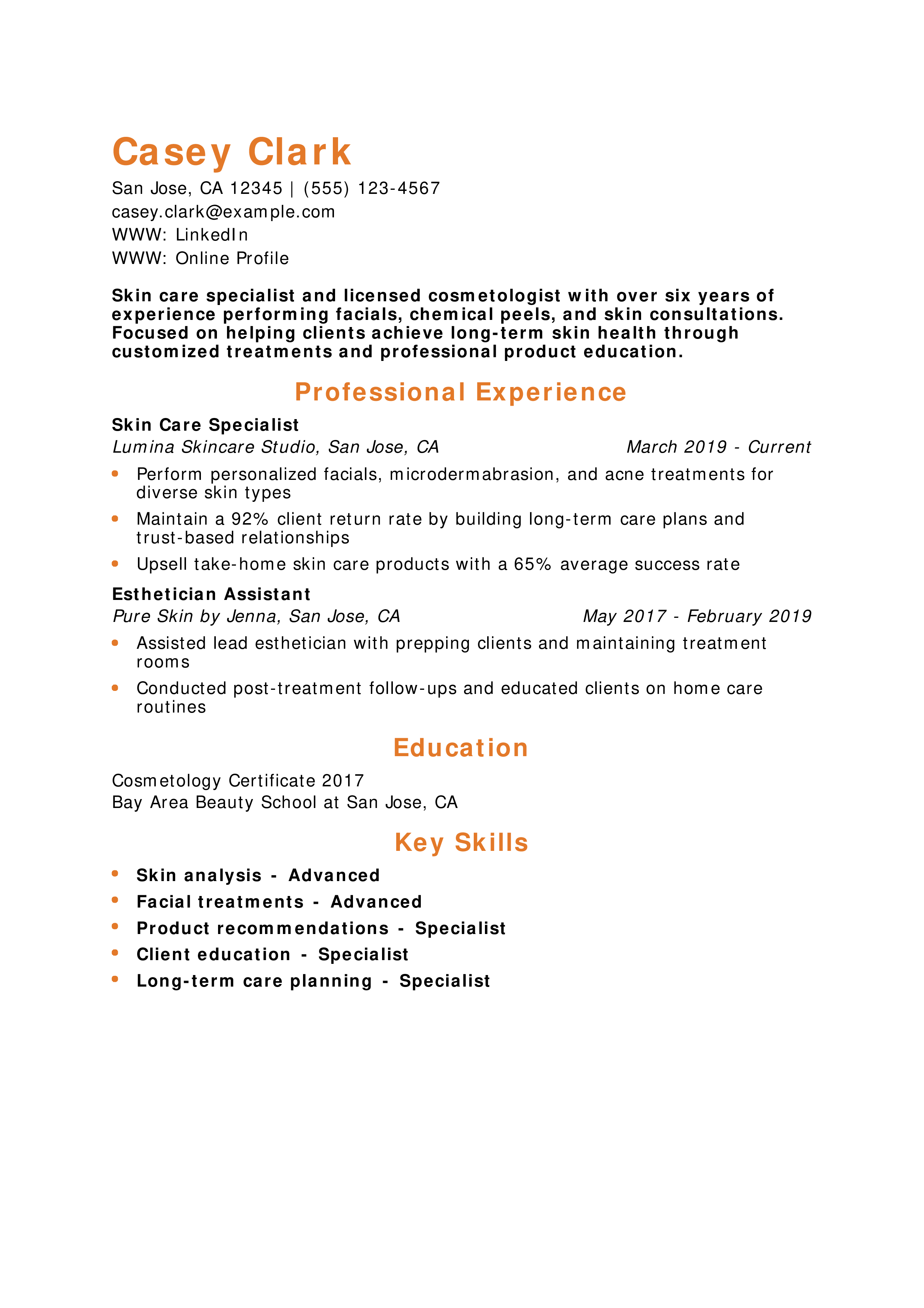 This resume emphasizes client care and measurable success in building loyalty and product sales. It shows how consistent, personalized treatments lead to lasting results. For more on showcasing specialty experience, explore how to list certifications on a resume.