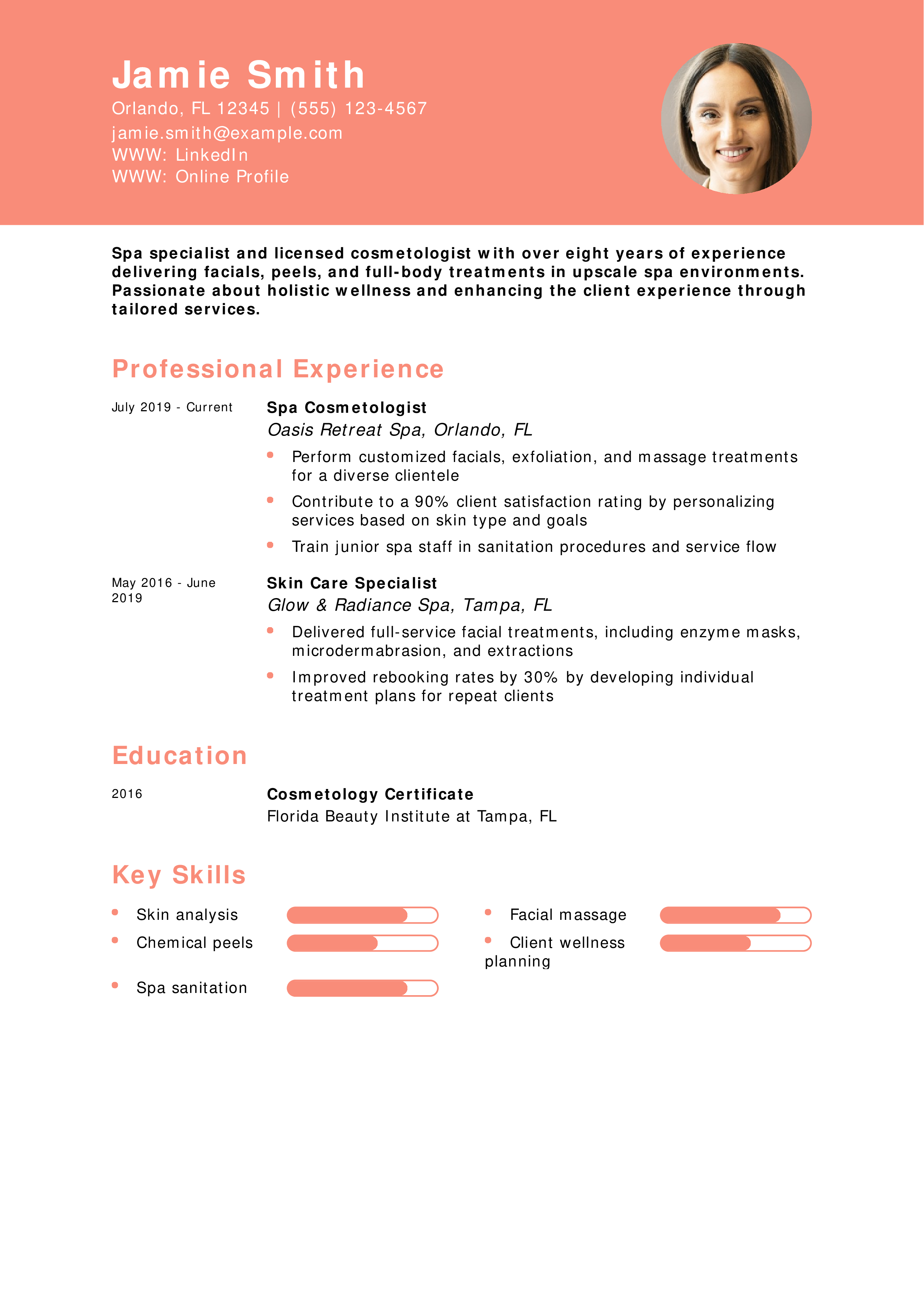 This resume shows the ability to deliver high-touch services in a spa setting while driving results like rebooking rates. It blends technical knowledge with a focus on client well-being. To learn how to format similar content, check out best font for a resume.