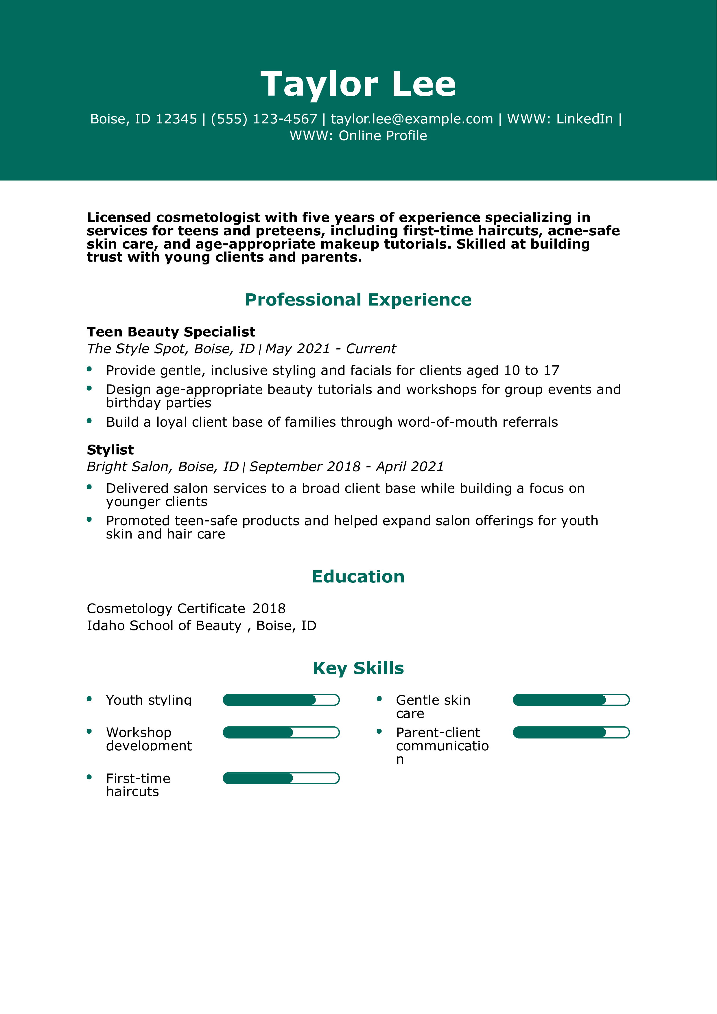 This resume reflects a clear niche: youth-focused cosmetology. It combines service detail with emotional intelligence and audience-specific language. Learn how to write for specialized roles by reviewing resume examples for teens.