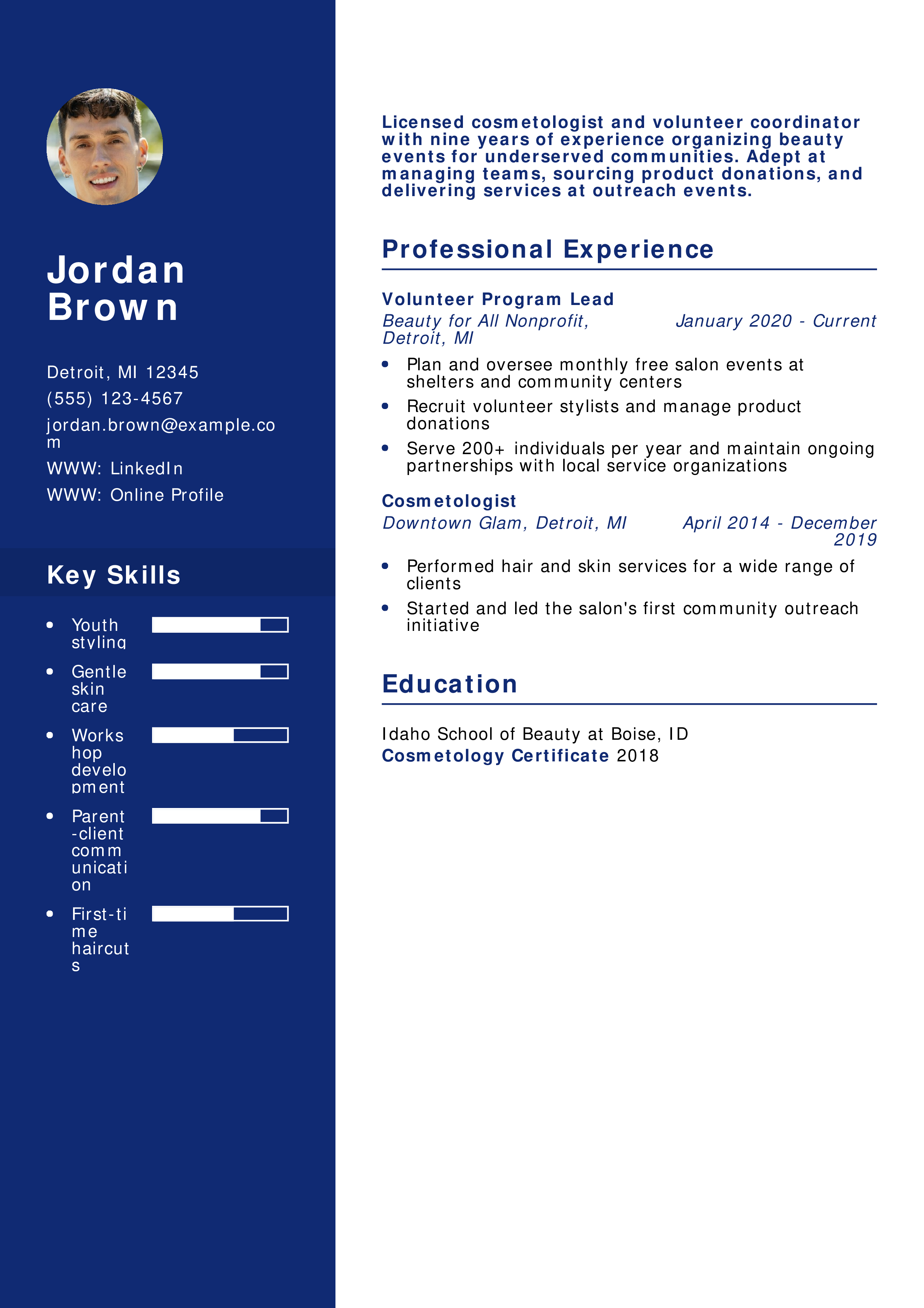 This resume shines by highlighting community impact and leadership through volunteer work. It shows how beauty services can empower others. To include your service, read how to put volunteer work on a resume.