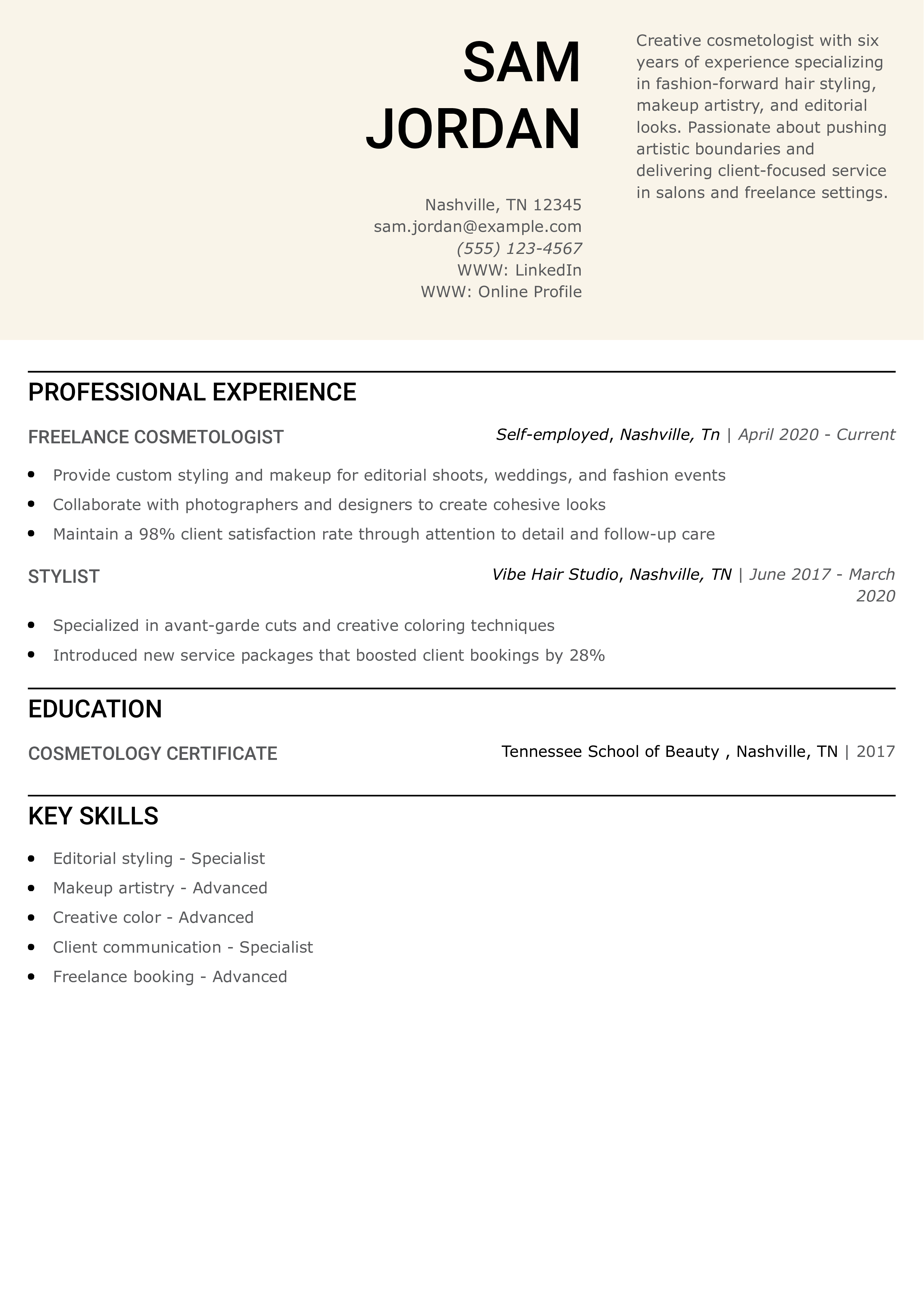 Selecting the right template for your professional needs can be challenging for job seekers. With such a variety of options available, finding the ideal fit for your personal brand can be difficult. The most important thing to consider when choosing a template is whether or not your industry experience and cosmetology skills are well-organized and easy to read. Avoid overuse of flashy colors and graphics, as these elements risk distracting prospective employers from your most relevant qualifications.