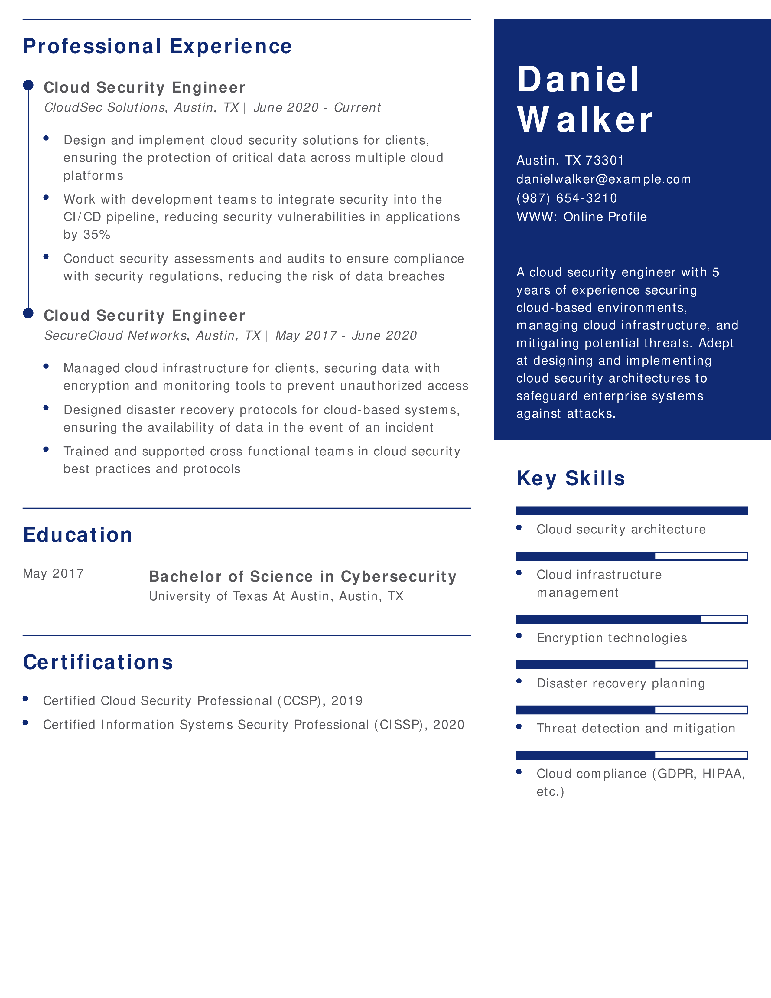 An accomplished cybersecurity engineer with seven years of experience specializing in cloud security, vulnerability assessments, and disaster recovery. A proven track record of collaborating with cross-functional teams to enhance security protocols and improve incident response for enterprise financial companies.