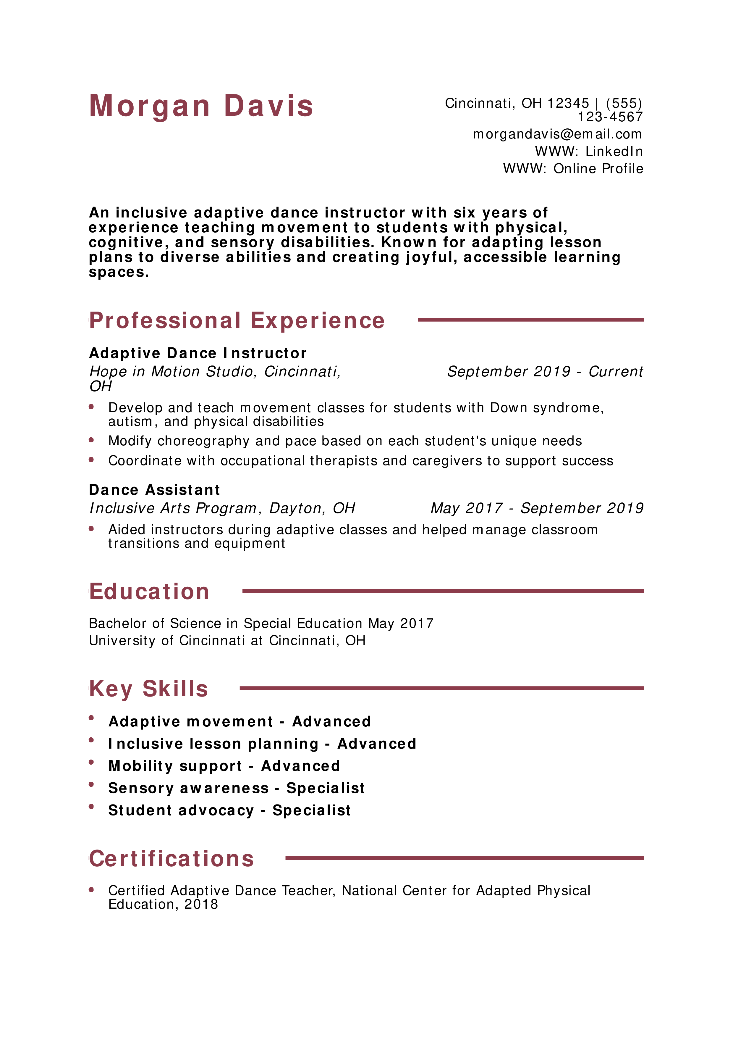 This resume focuses on a niche dance discipline with sensitivity and professionalism. It highlights inclusivity, physical training, and student safety. For more help listing specialized training, read How To List Certifications on a Resume.