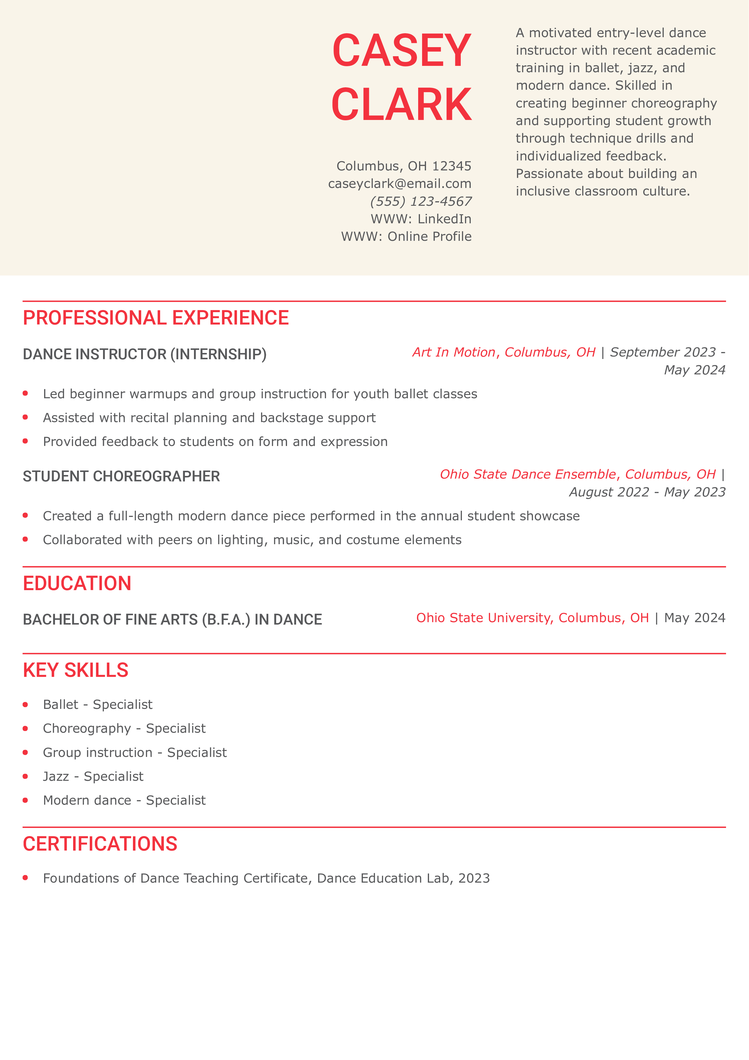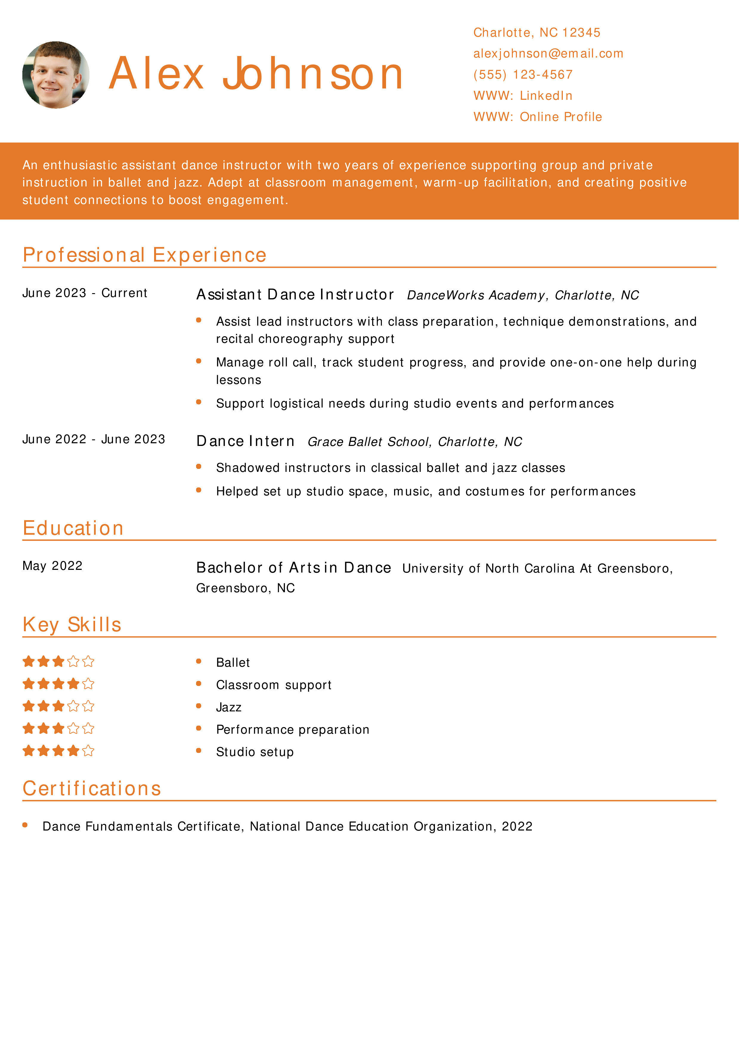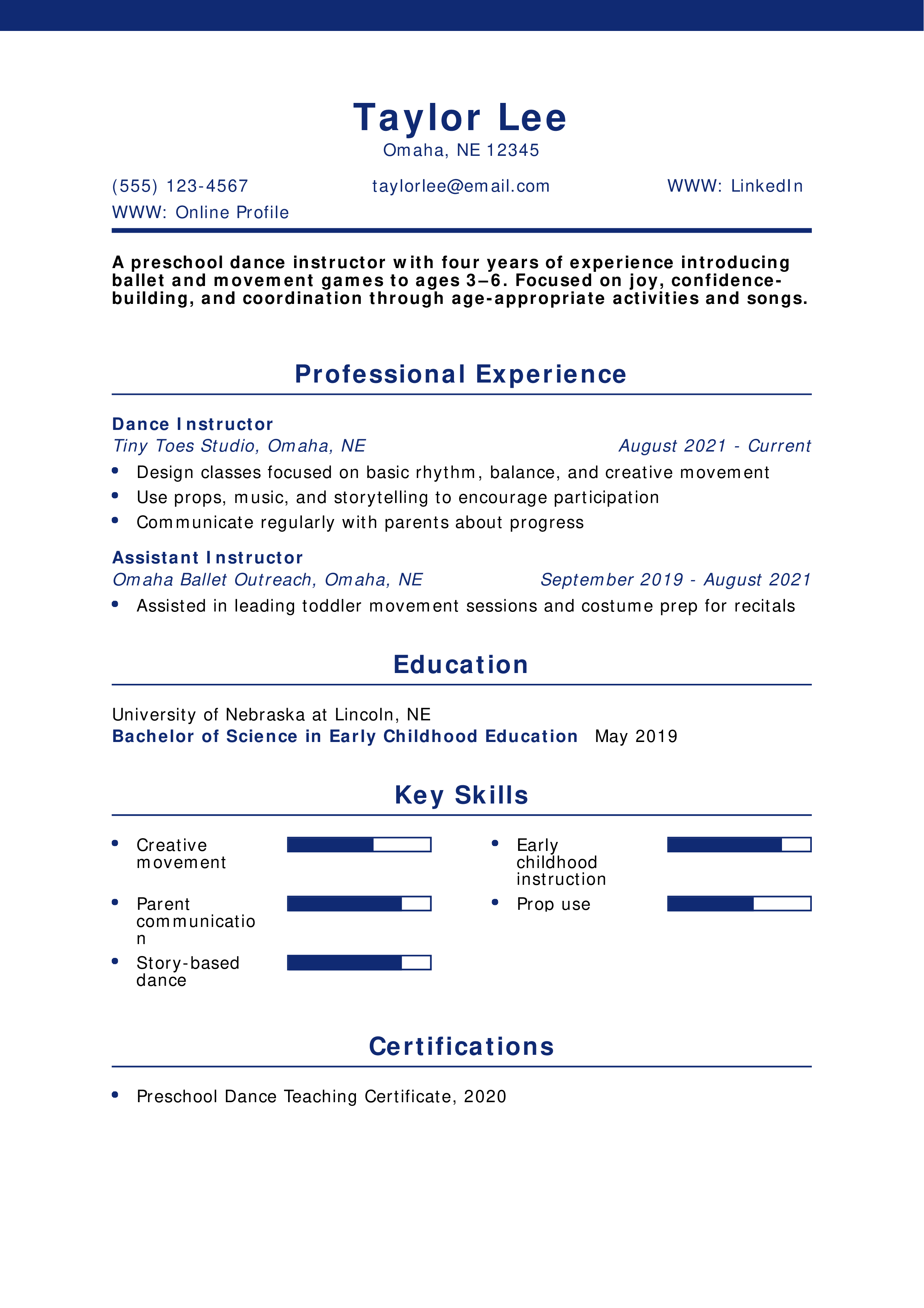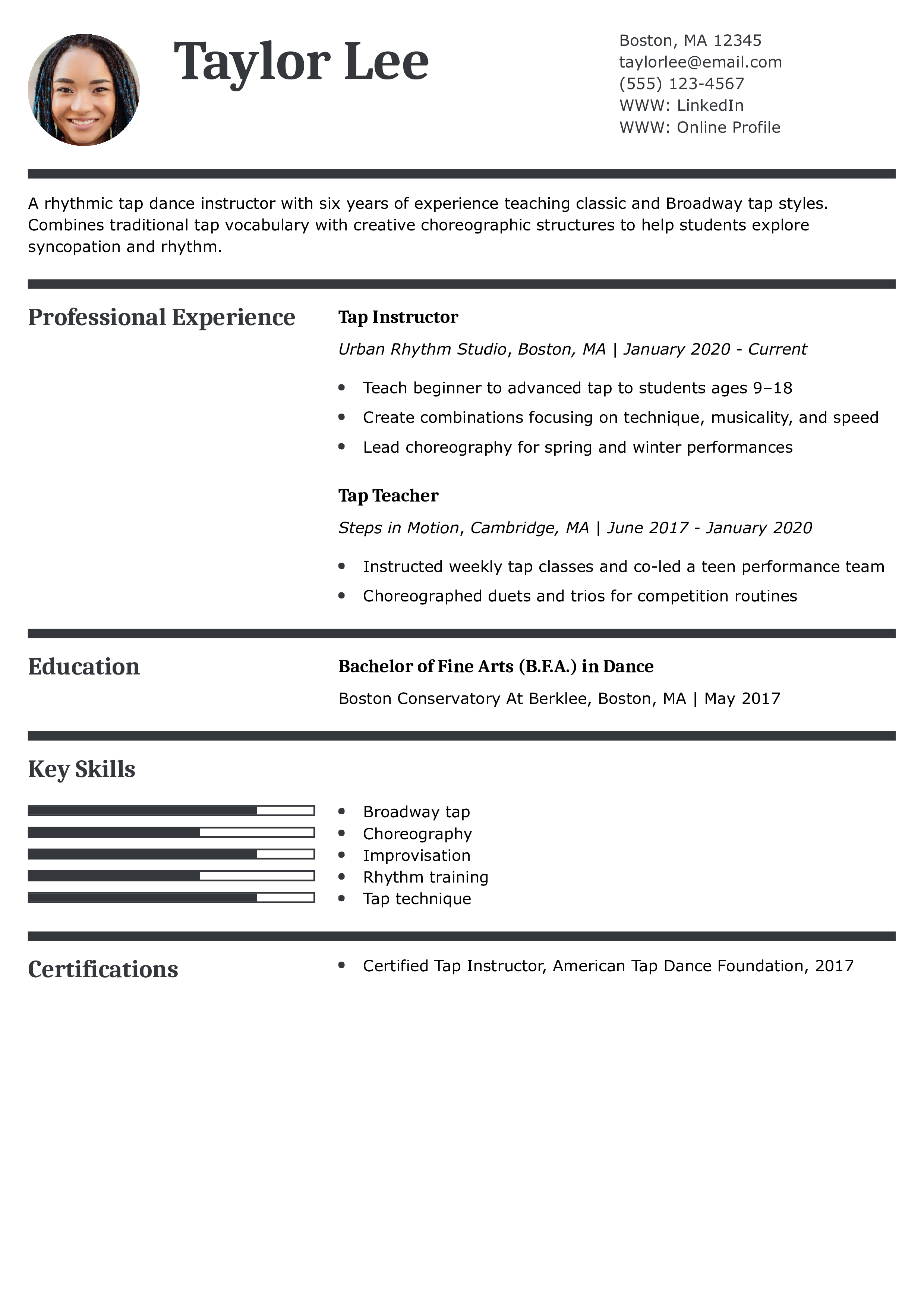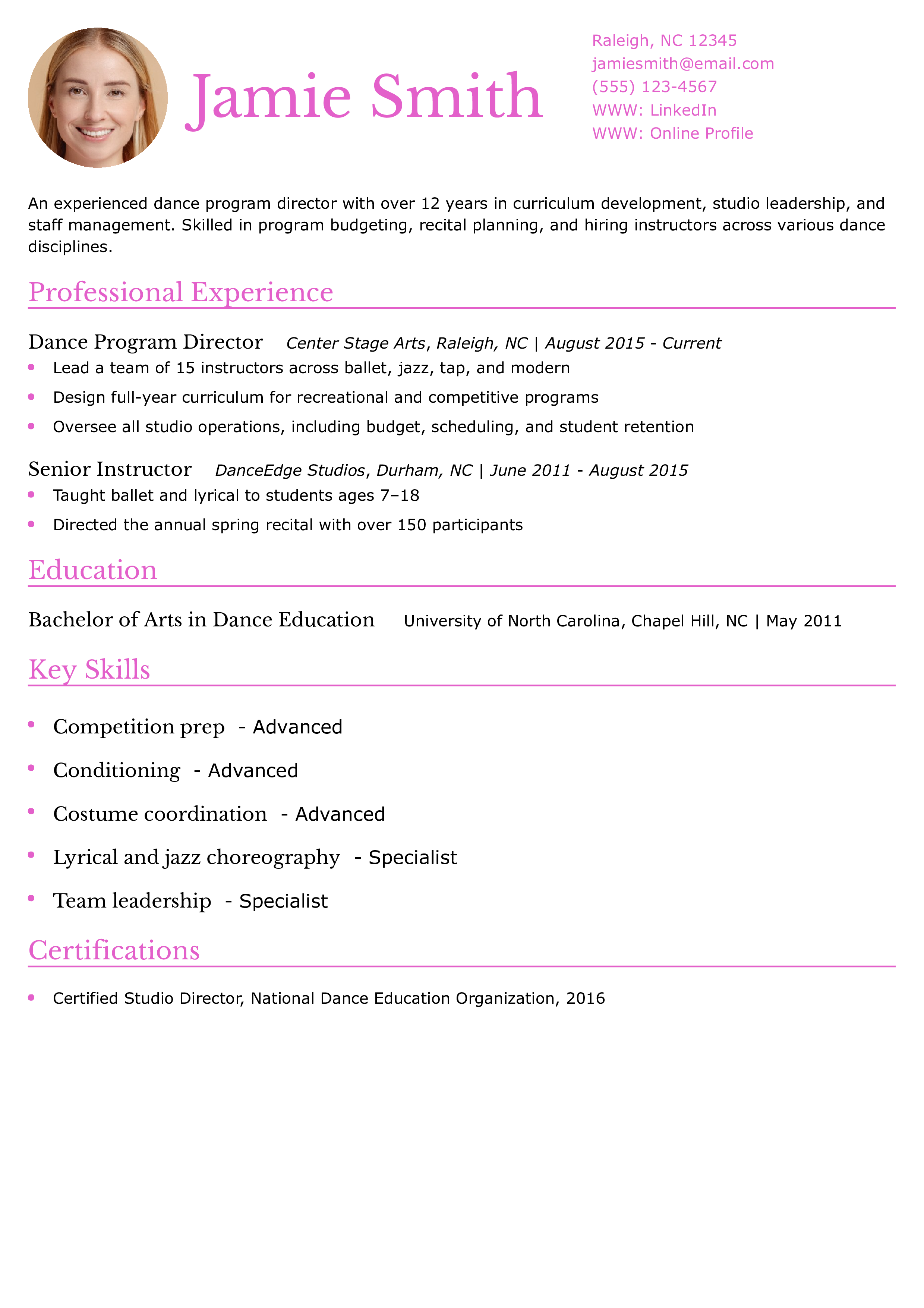 This resume emphasizes leadership and administrative skills alongside dance expertise. It's ideal for candidates managing entire programs or studios. Learn what to include for leadership roles with What To Put on a Resume.