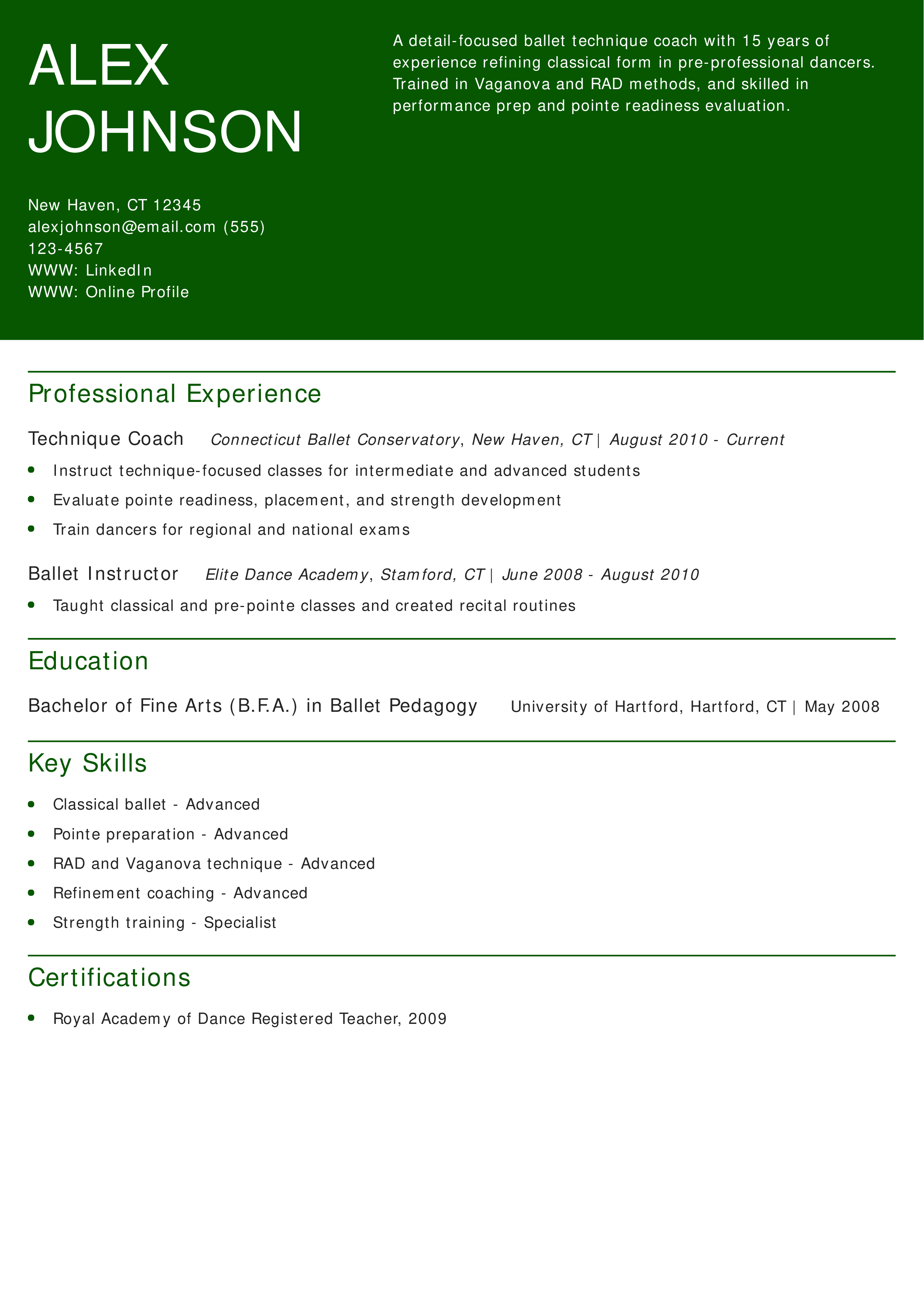 It’s specialized and technical, perfect for professional ballet settings. Methodology, student level, and coaching goals are all clear. Explore more resume content ideas with Best Resume Formats.