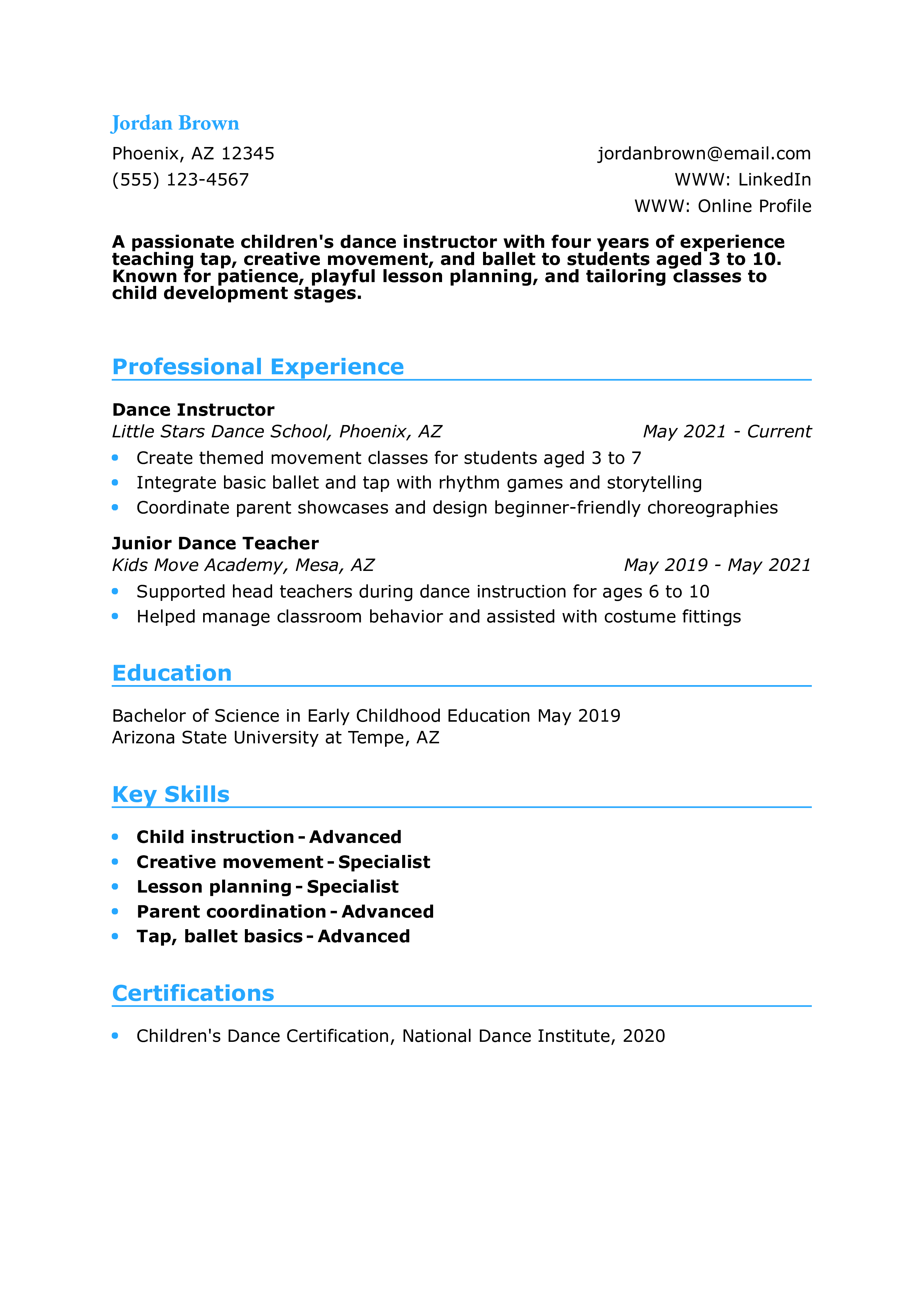 This resume is tailored specifically to working with young learners. It blends dance and child development experience, making it ideal for early childhood roles. To ensure every section aligns with your target role, read What To Put on a Resume.