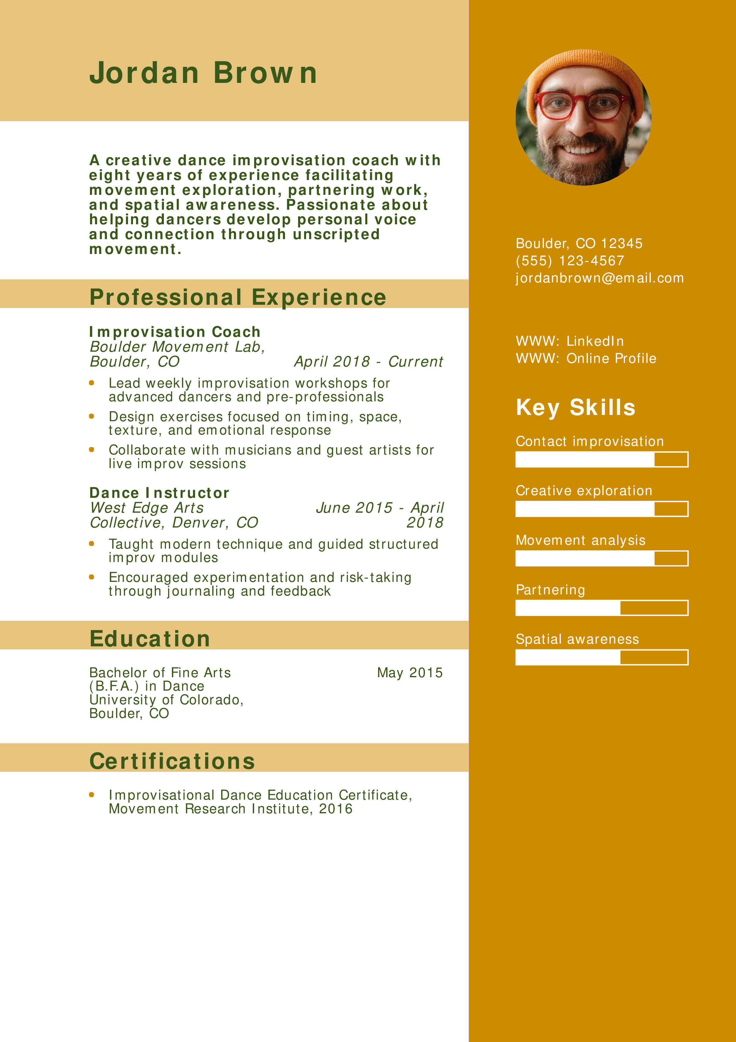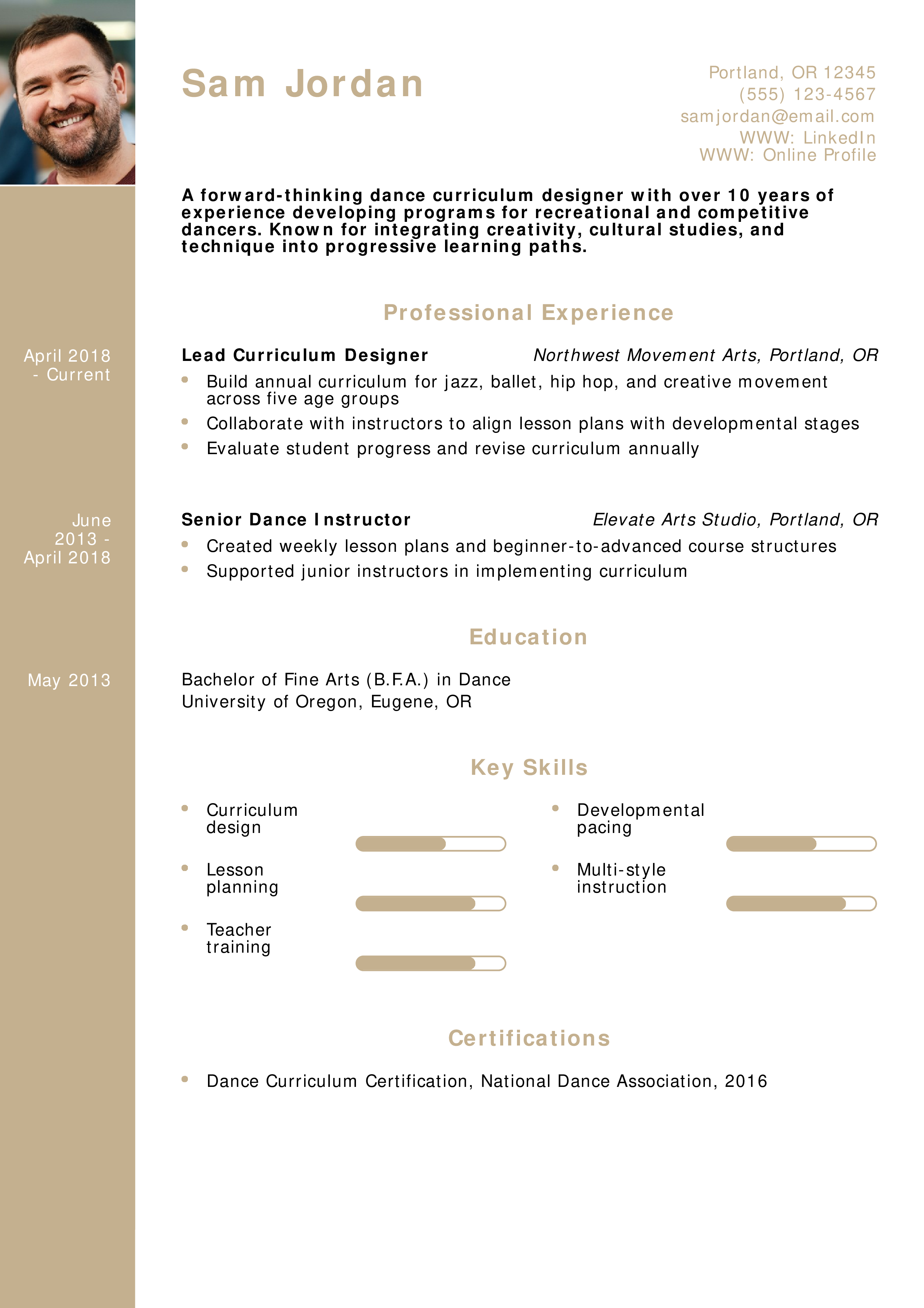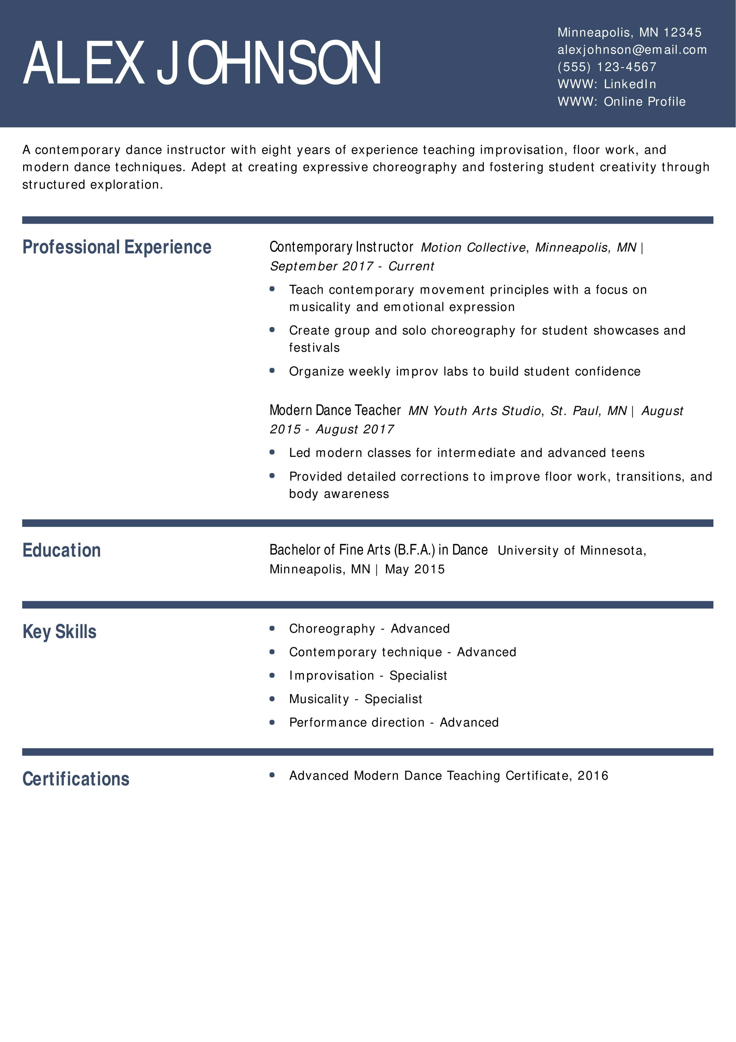 This resume demonstrates deep expertise in educational planning. It clearly emphasizes the ability to align dance training with learning goals. To better tailor your experience to teaching, read the Resume Interests Section.