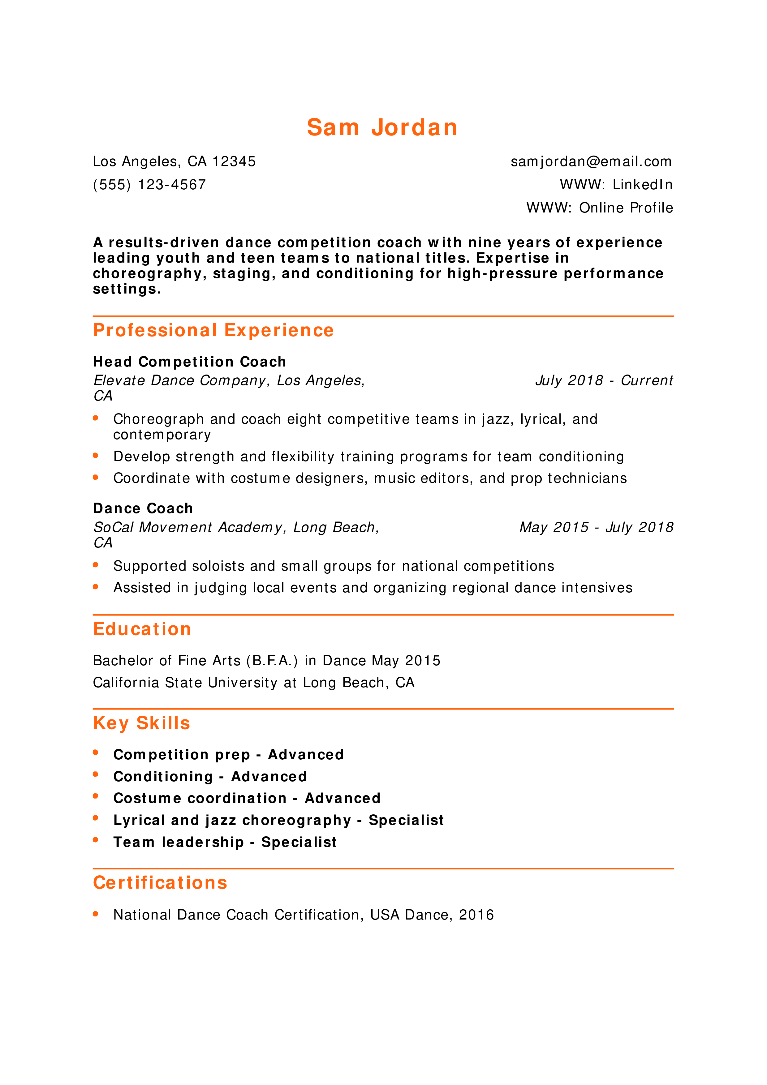 The resume clearly shows both instructional and competitive coaching experience. Including dance styles and levels taught helps show breadth. Adding competitive achievements could strengthen it further. Learn how to build on strong sections with Best Resume Formats.