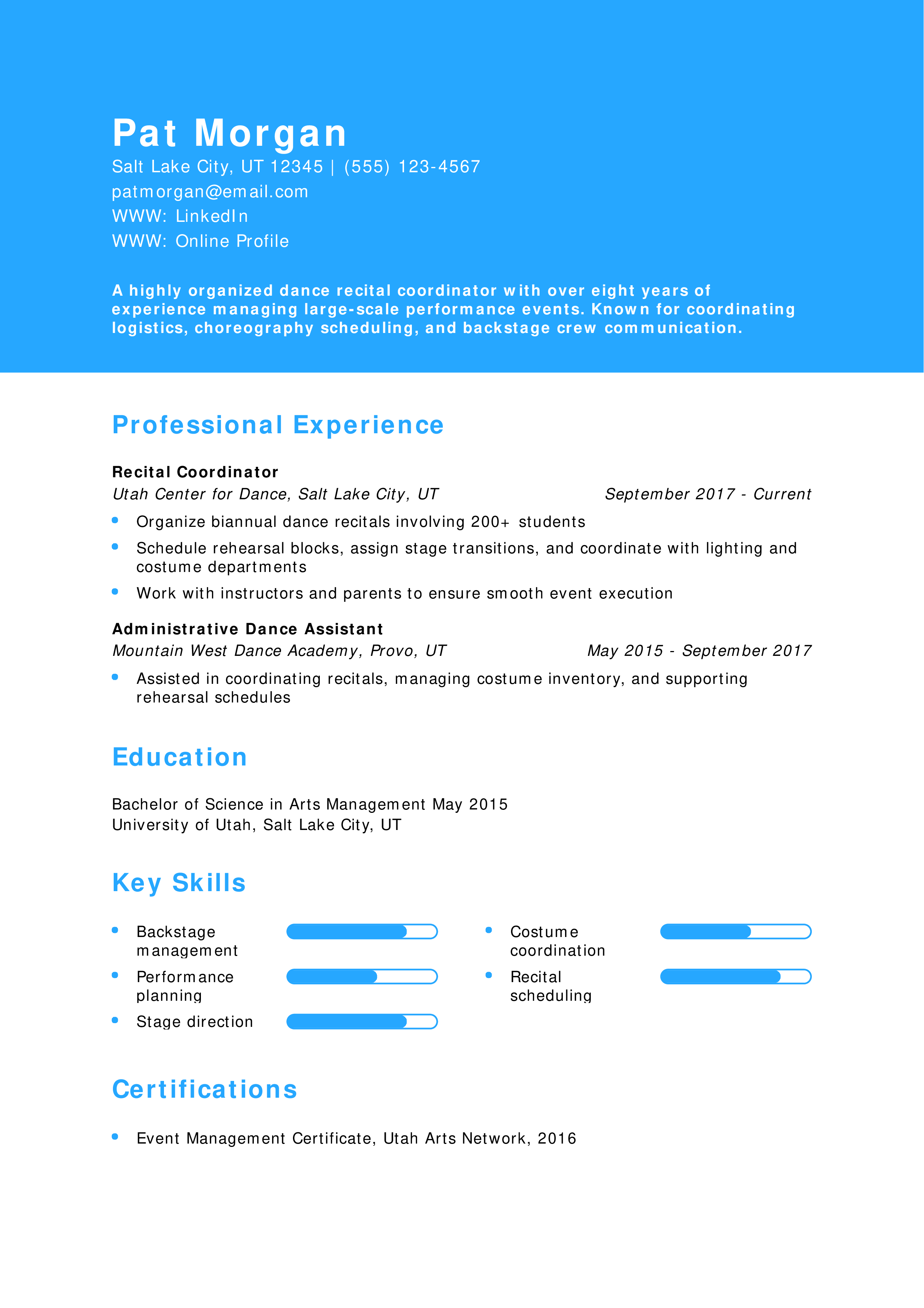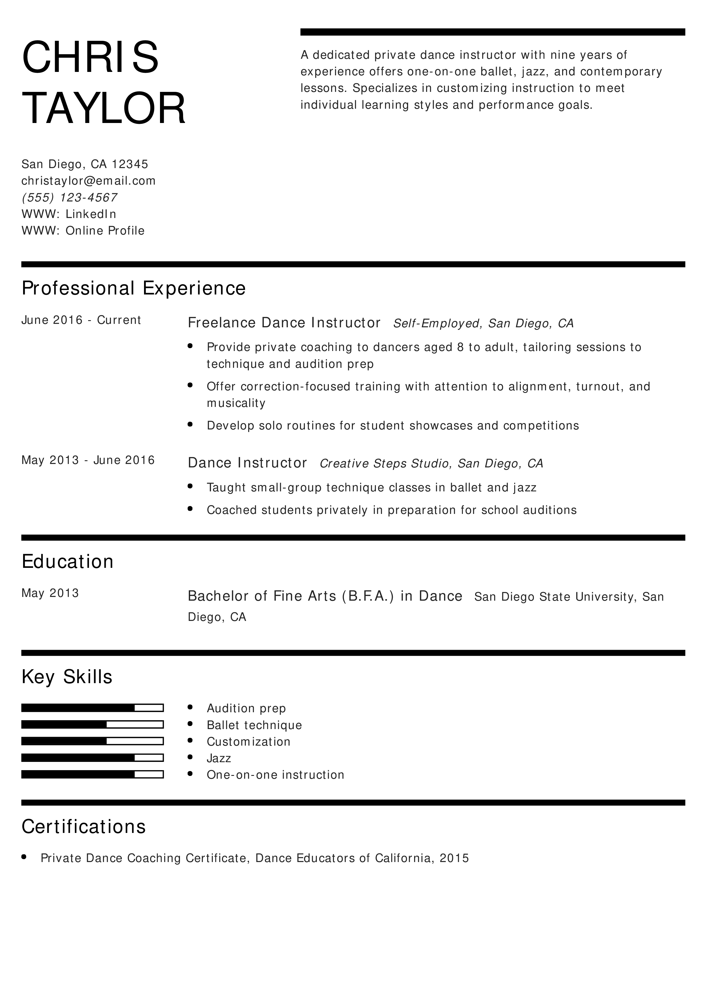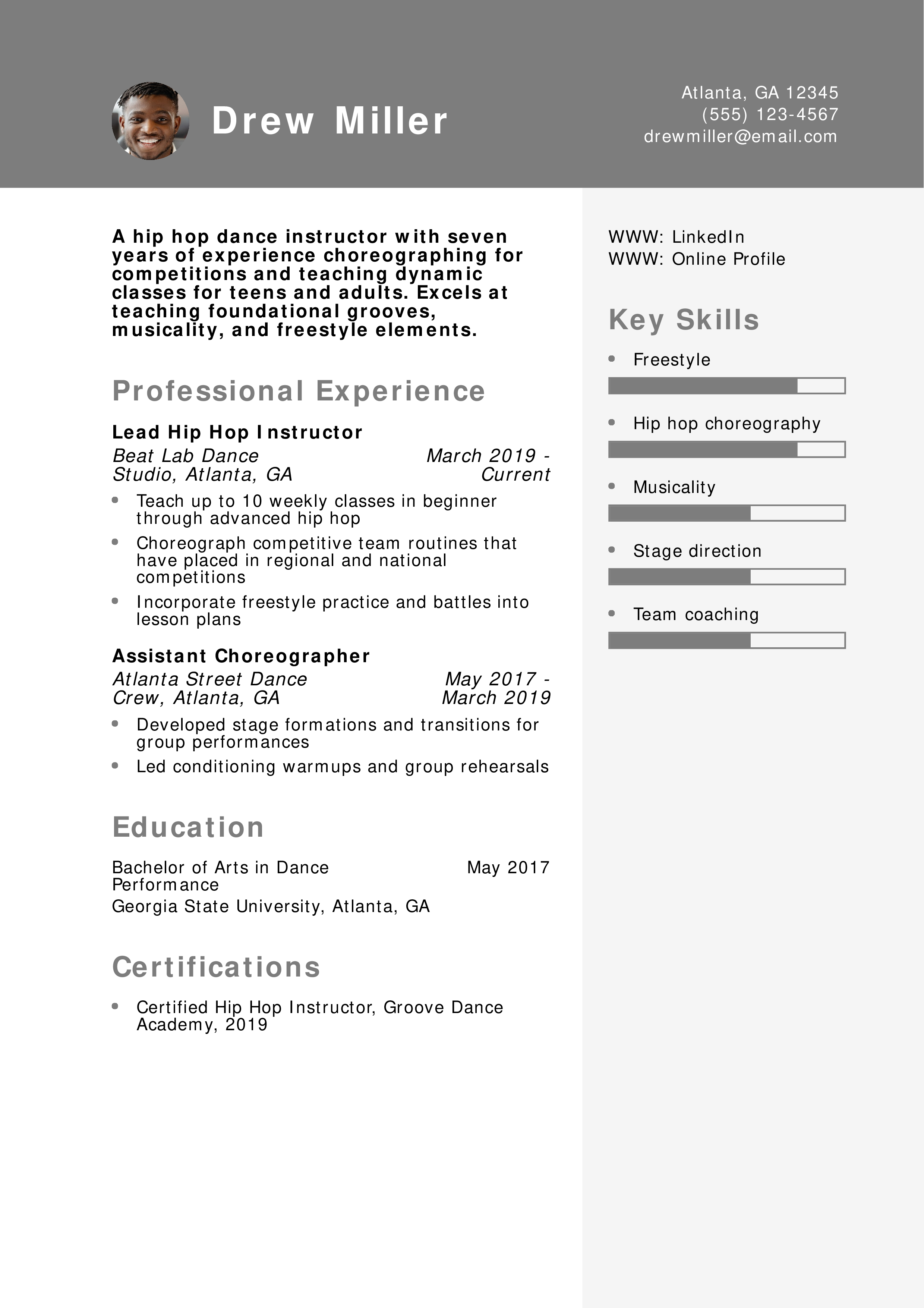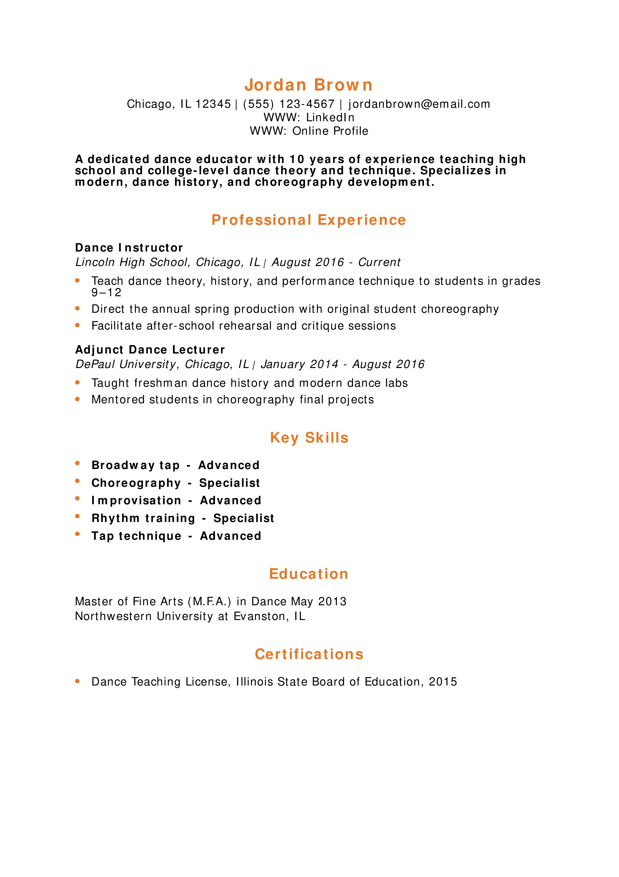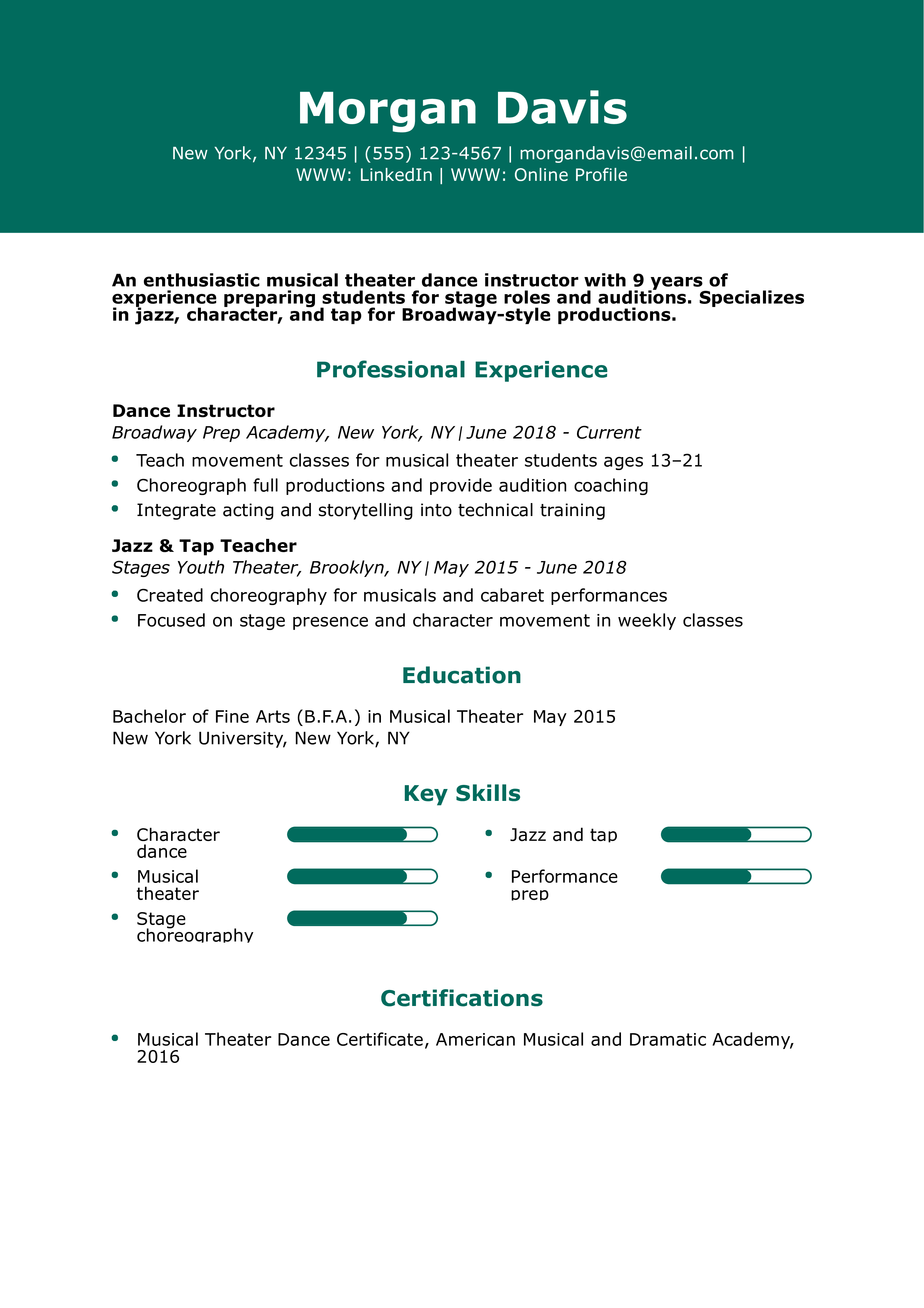 Reverse chronological is the optimal format for dance instructor resumes. This approach allows you to place your most recent and relevant experience at the forefront of your document while illustrating a clear career progression. If you lack hands-on teaching experience, you can place your skills and dance history below the summary, but provide detailed bullet points rather than only listing your knowledge of dance styles.