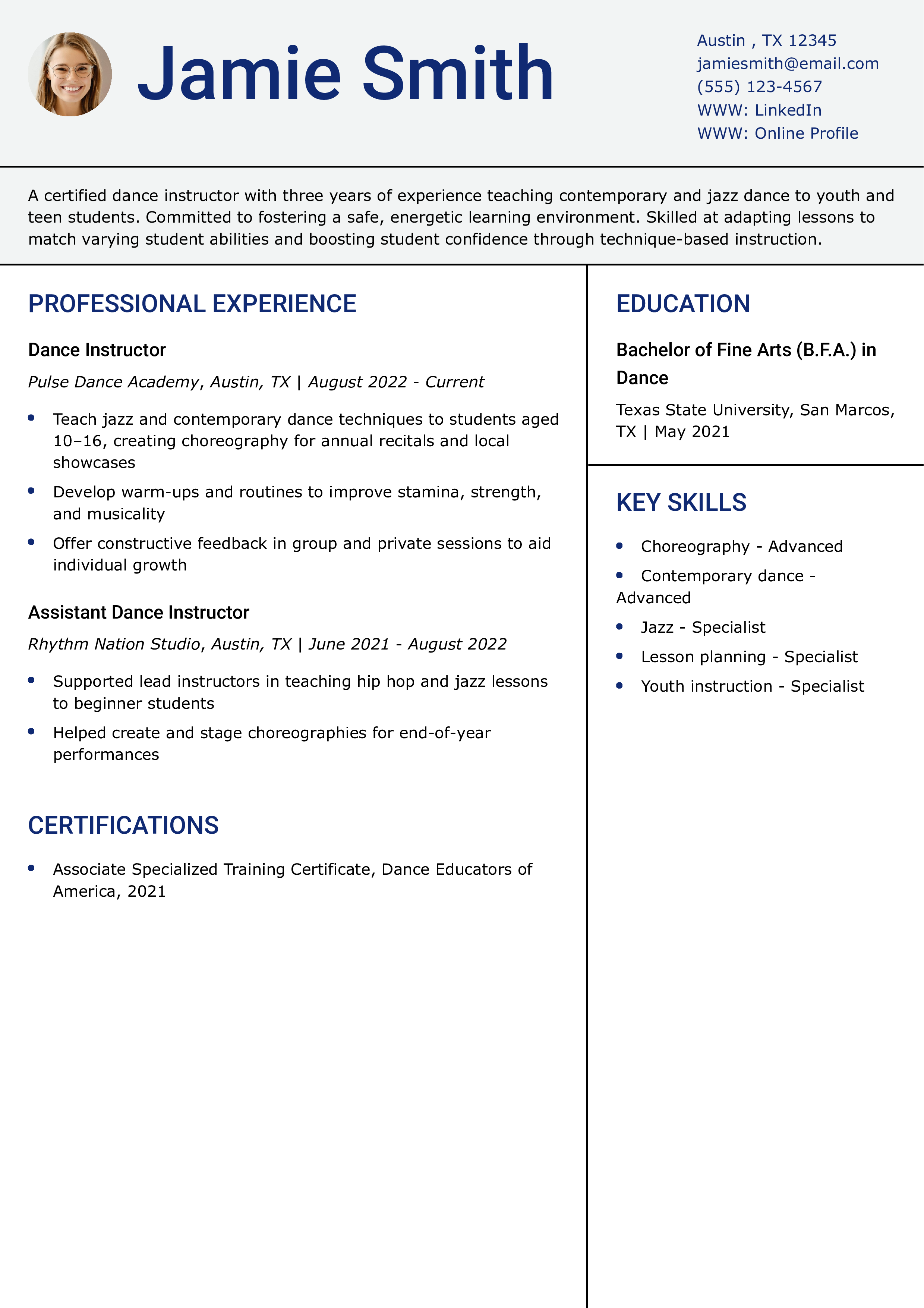 Craft a concise, dynamic profile that encapsulates the strongest aspects of your experience. Start with an opening sentence that includes your job title, years of industry experience, and three to four skills that align with the dance studio you’re applying to. Highlight your ability to provide constructive feedback and identify individualized teaching methods to help students improve.