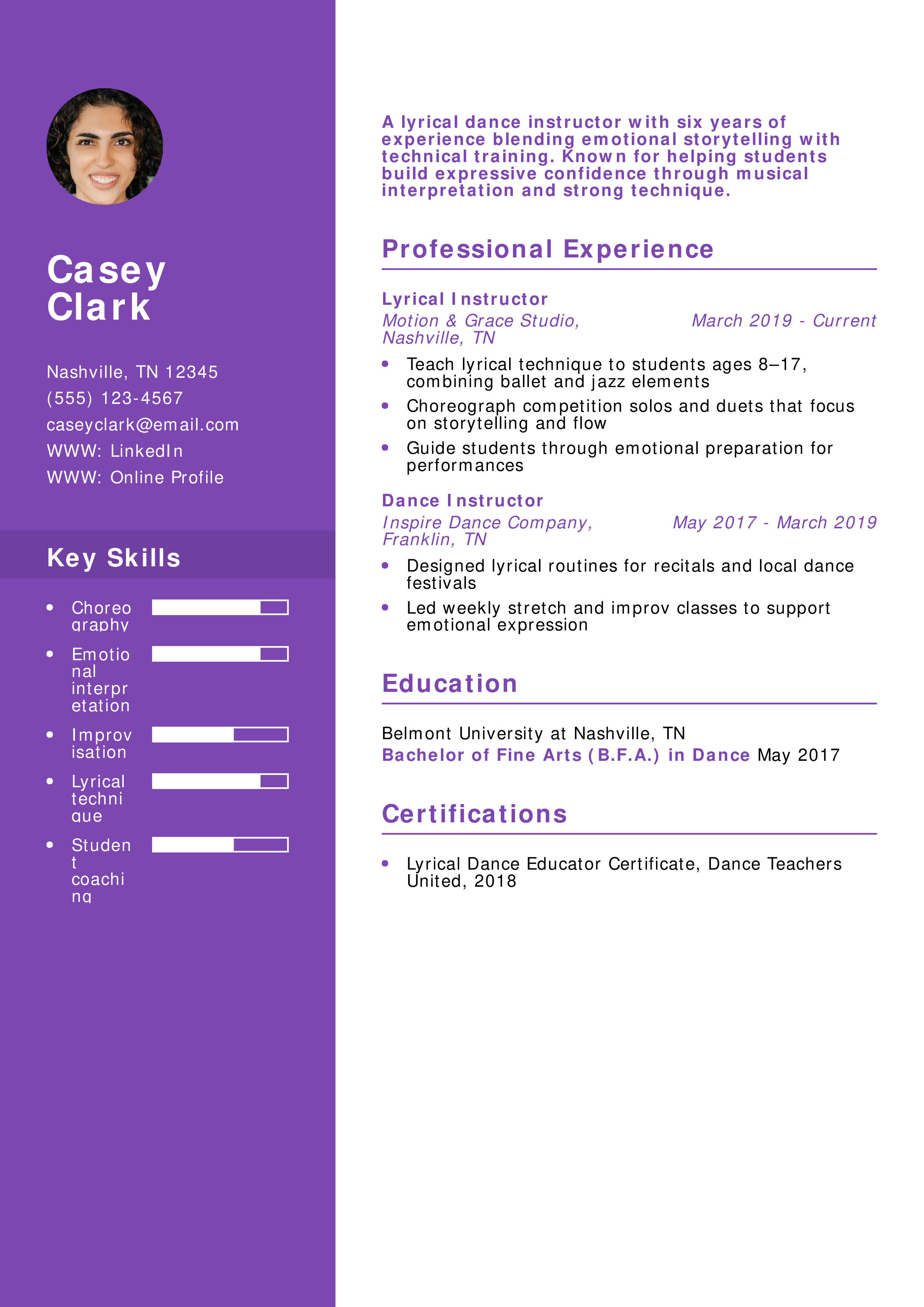 This resume shows how lyrical instructors merge movement and emotion. It highlights how emotional depth is taught and supported. For more on presenting specialized dance skills, visit Resume Skills.