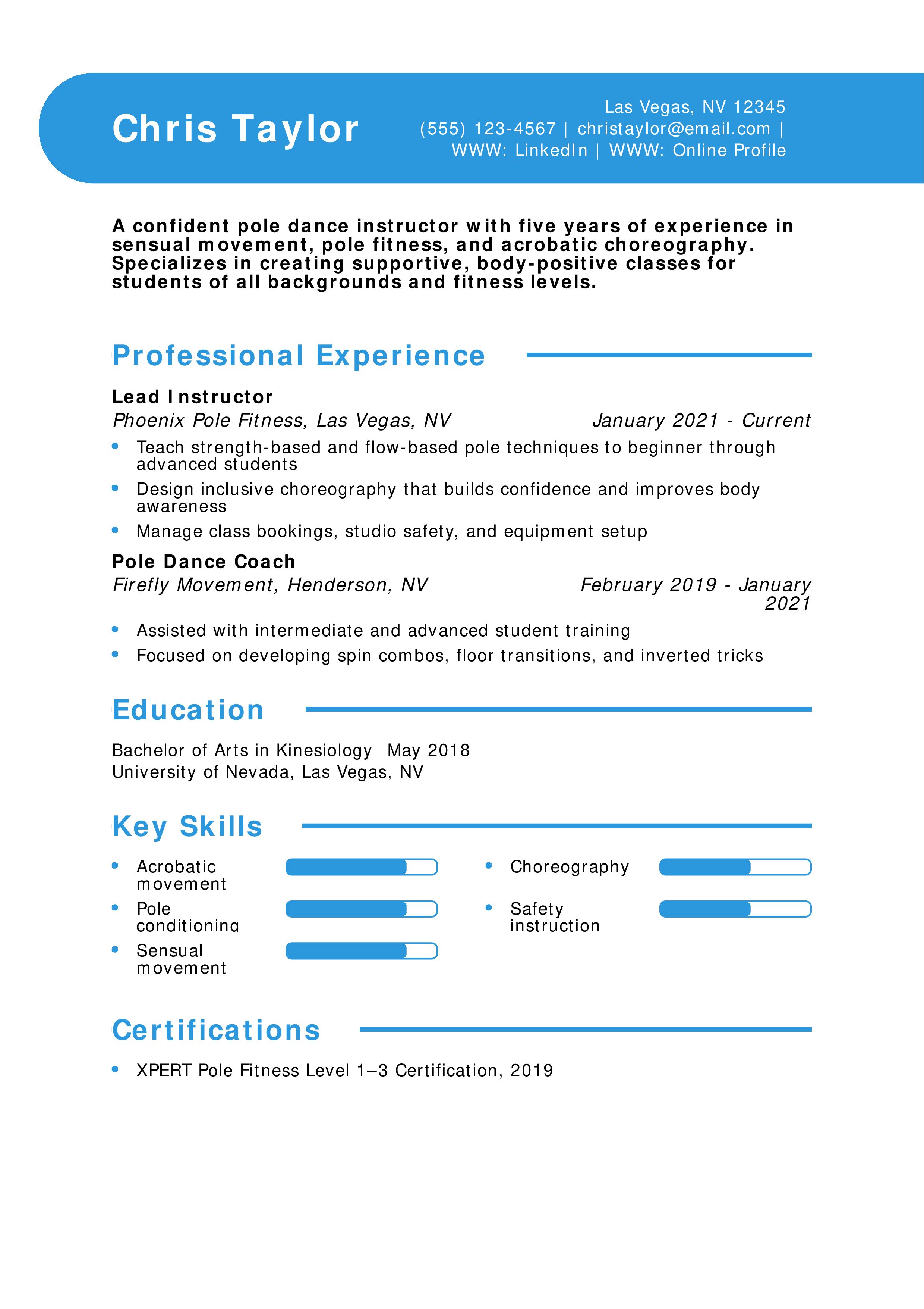 This resume combines dance, fitness, and coaching. It demonstrates an ability to motivate and lead large classes while showcasing technical fitness knowledge. Learn how to balance physical instruction and teaching on your resume with Resume Skills.