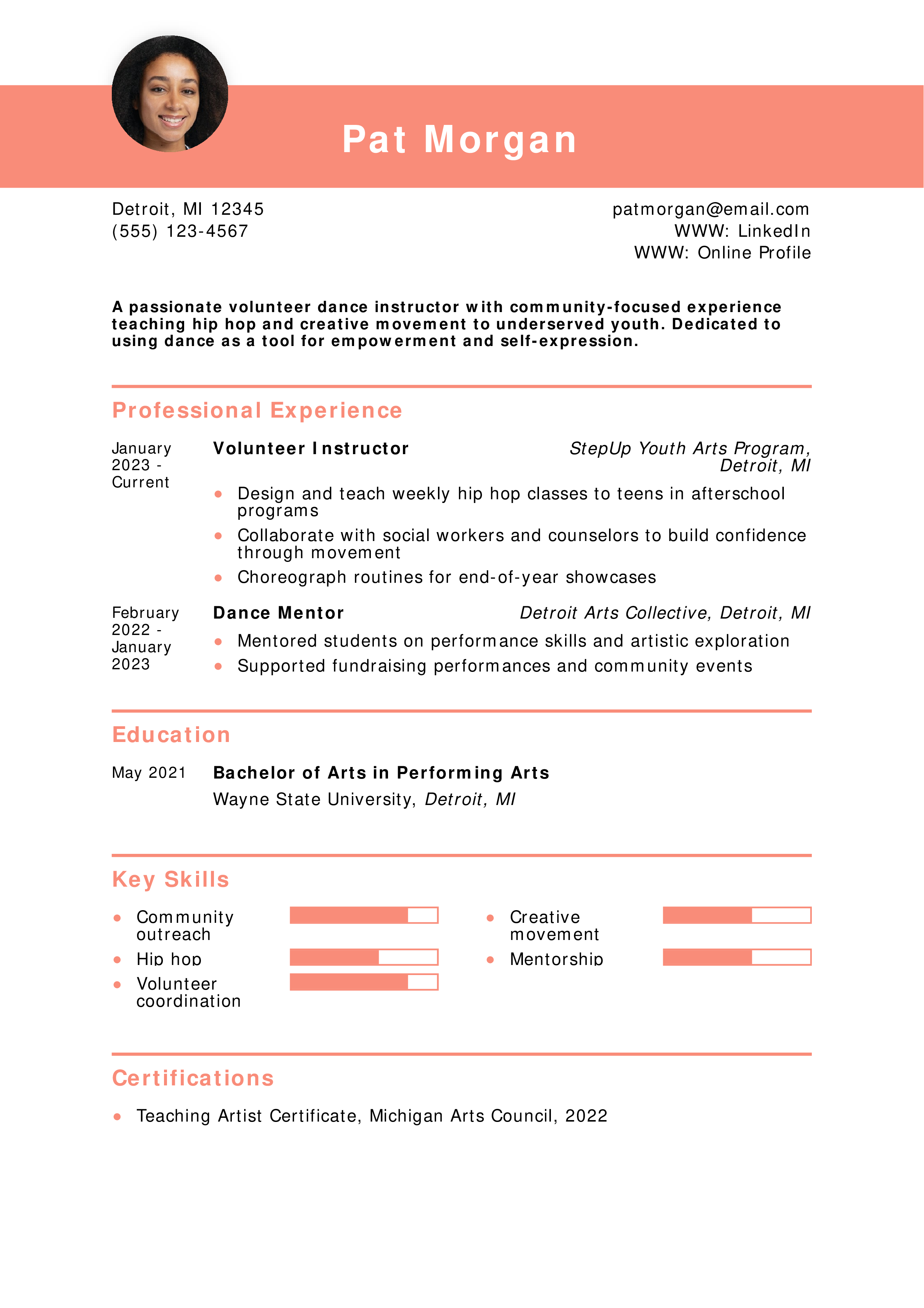 According to the Bureau of Labor Statistics, dance instructor jobs are expected to grow by 27% between 2021 and 2031. However, due to the industry's size, this only equates to 2,700 new openings each year. To maximize your chances of landing the interview and differentiate yourself from the competition, align your resume with the job description.
