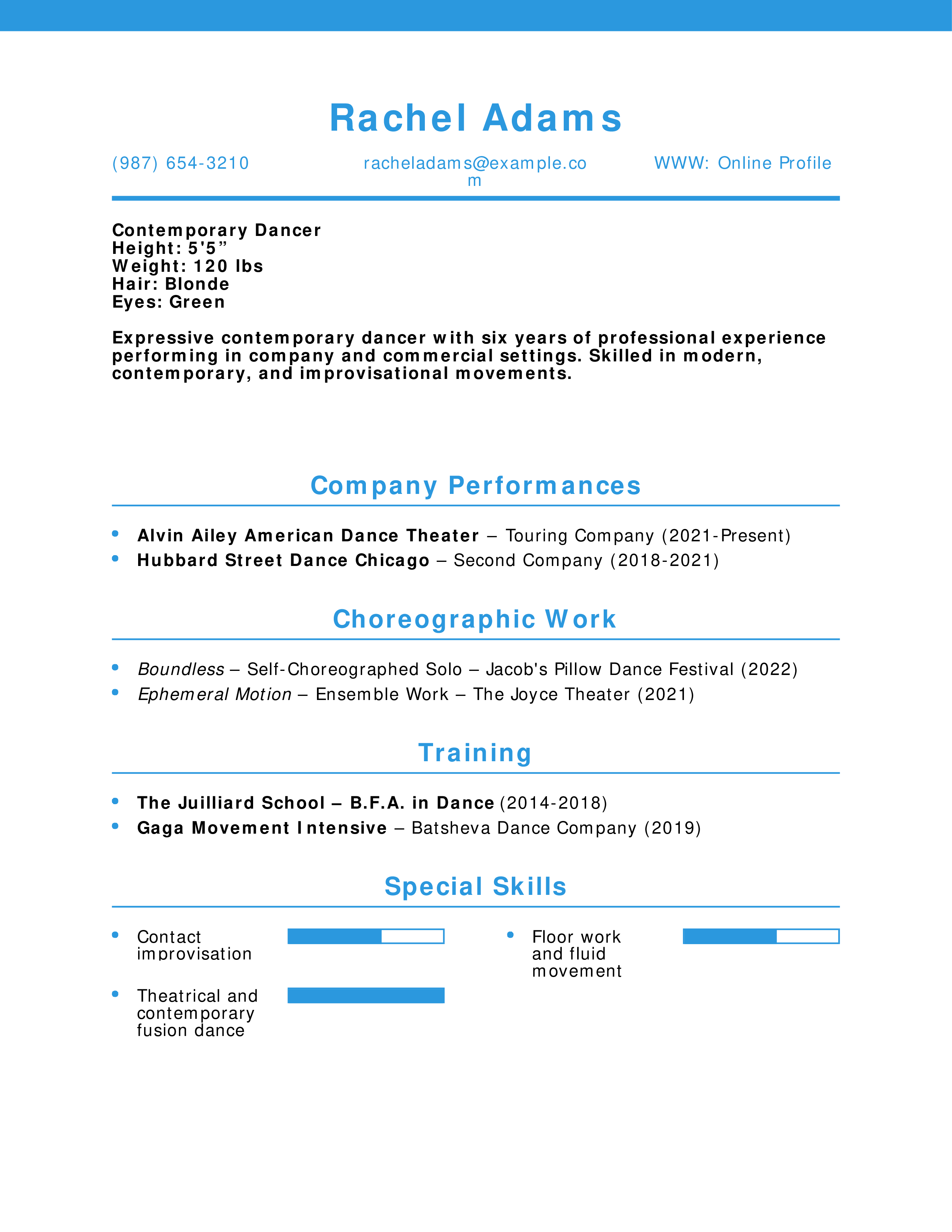 Key Tips: Emphasize versatility across theater and commercial dance. Include specialized training programs like Ailey and Broadway intensives.
