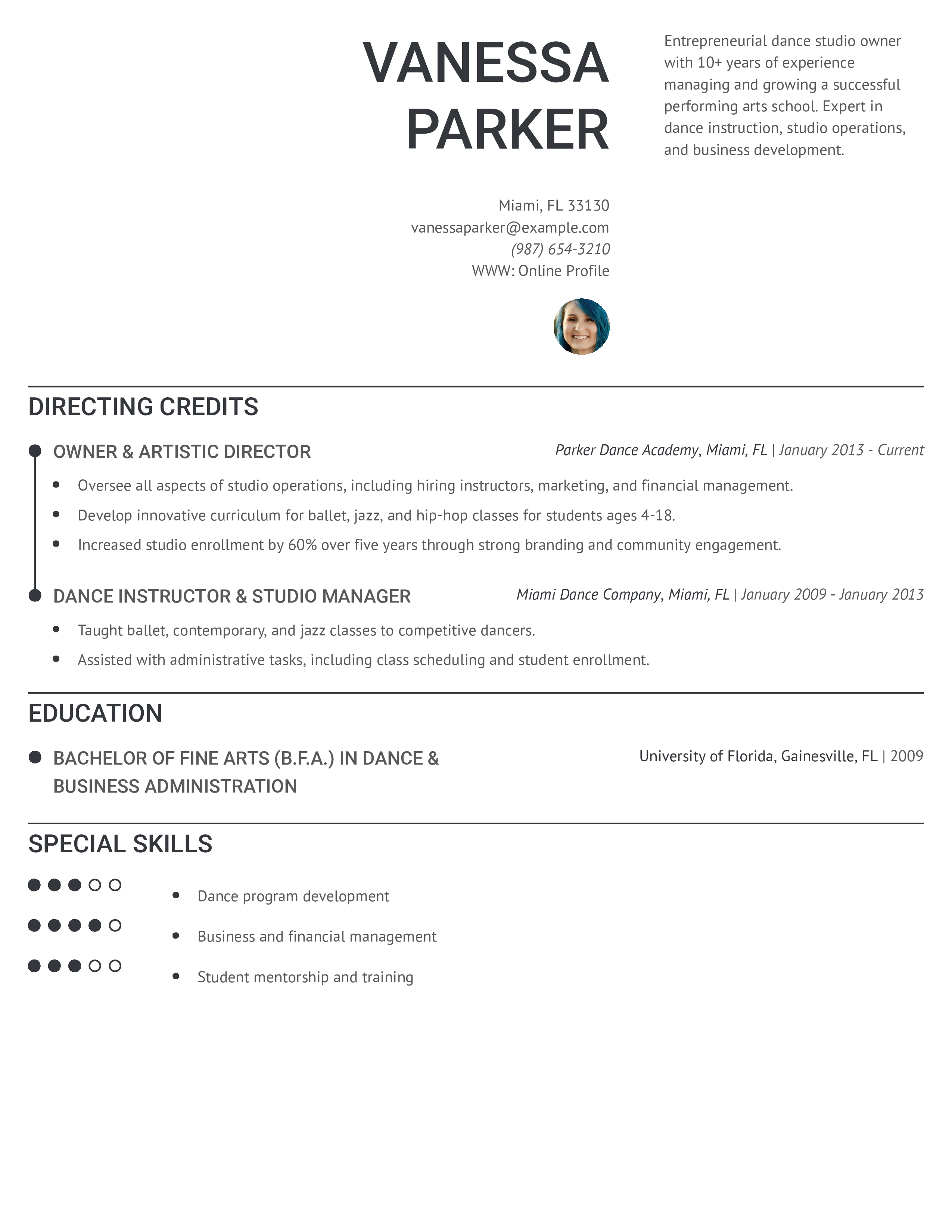 A combination resume works well if you're applying for a nonperformance role because you can group your dance skills and still have room for a professional experience section.