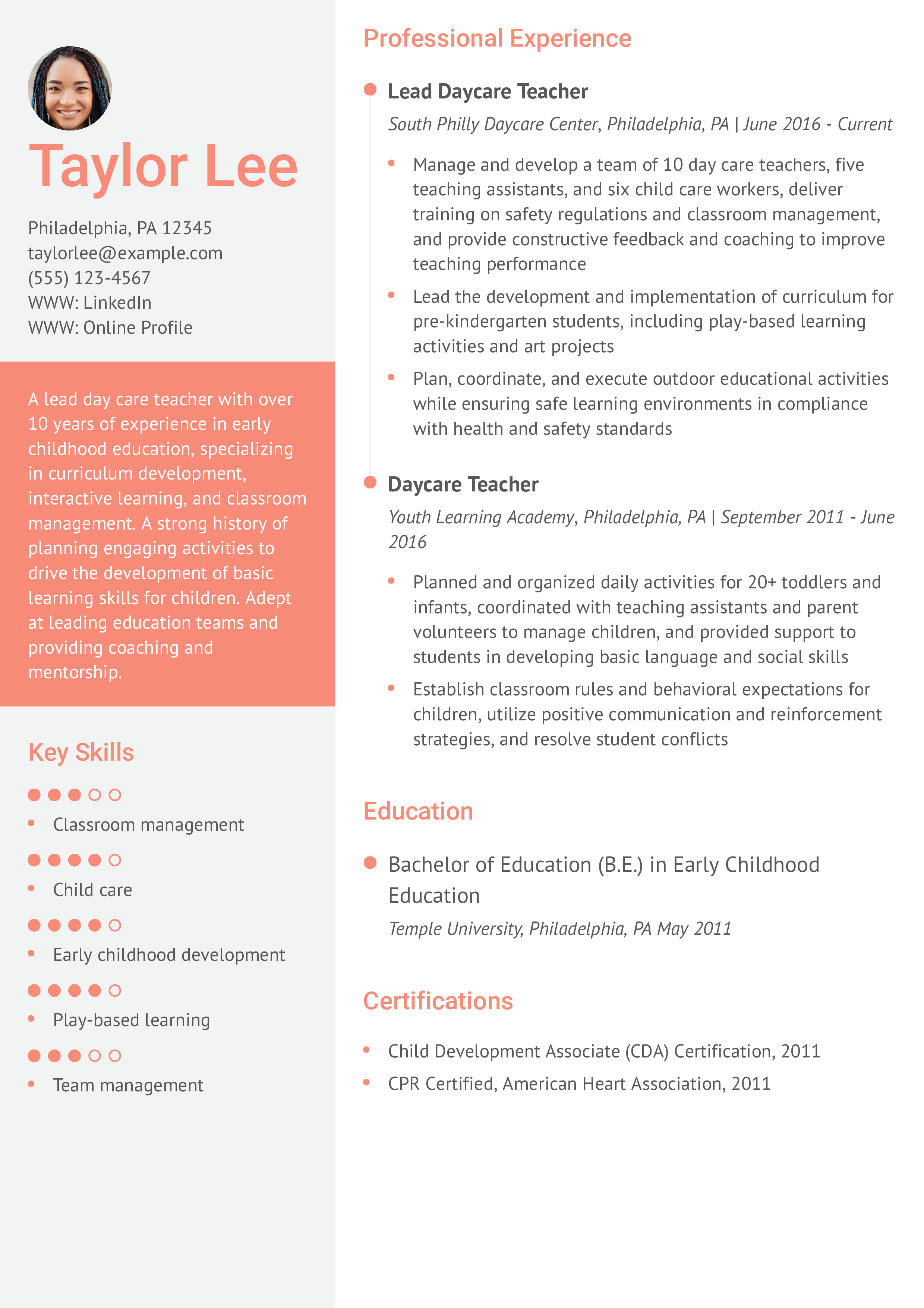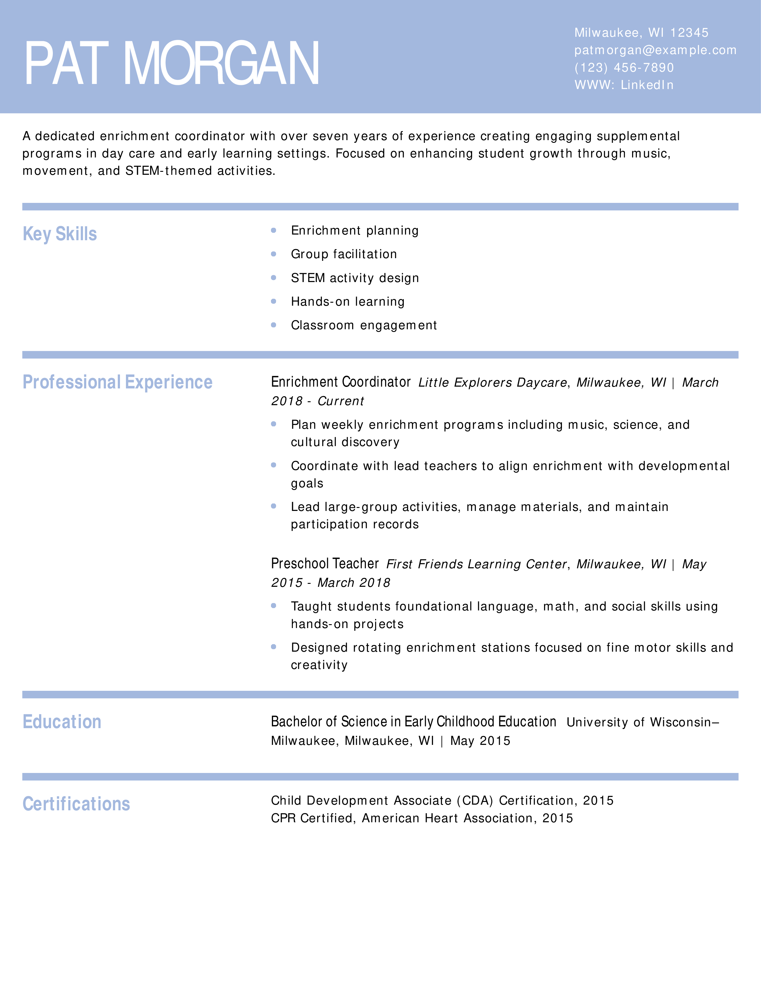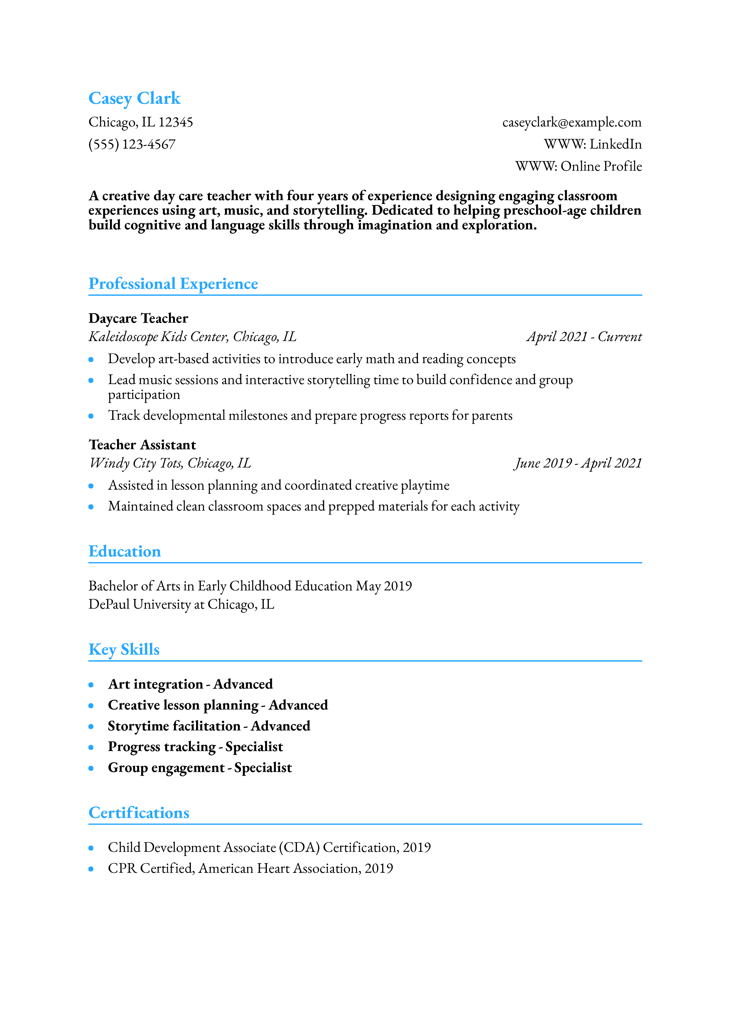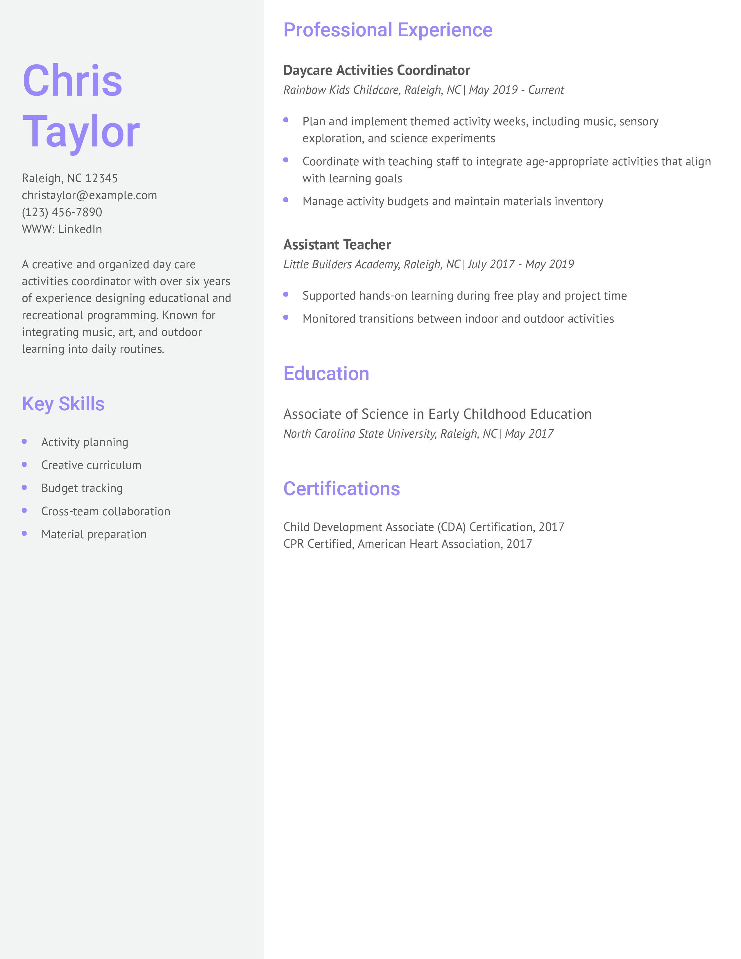 Choose a template that can ideally work for both by looking for an option with clean lines, easy-to-read fonts, and plenty of room for different sections. A daycare teacher’s resume should generally be two pages or fewer, and a single-column layout can help make the most of that space.