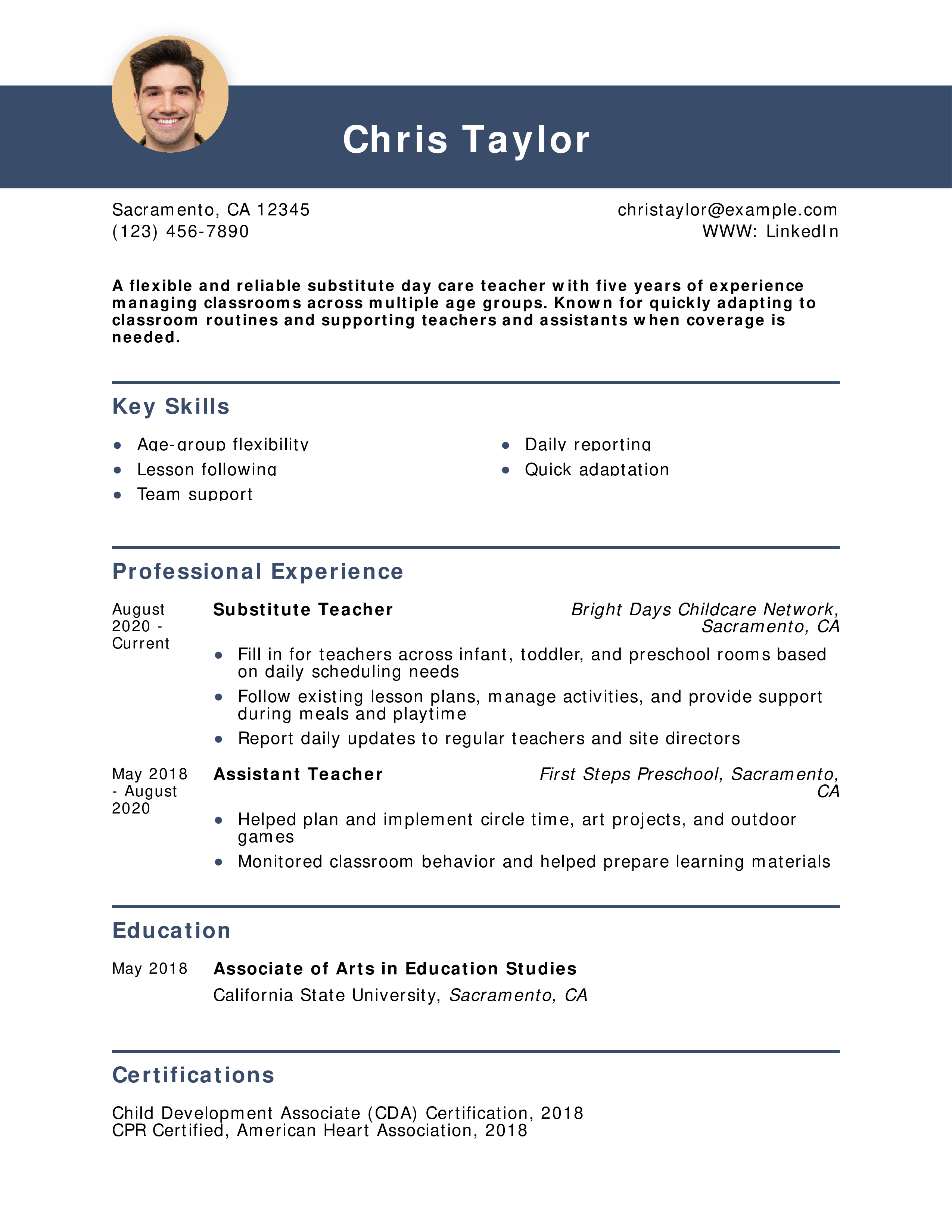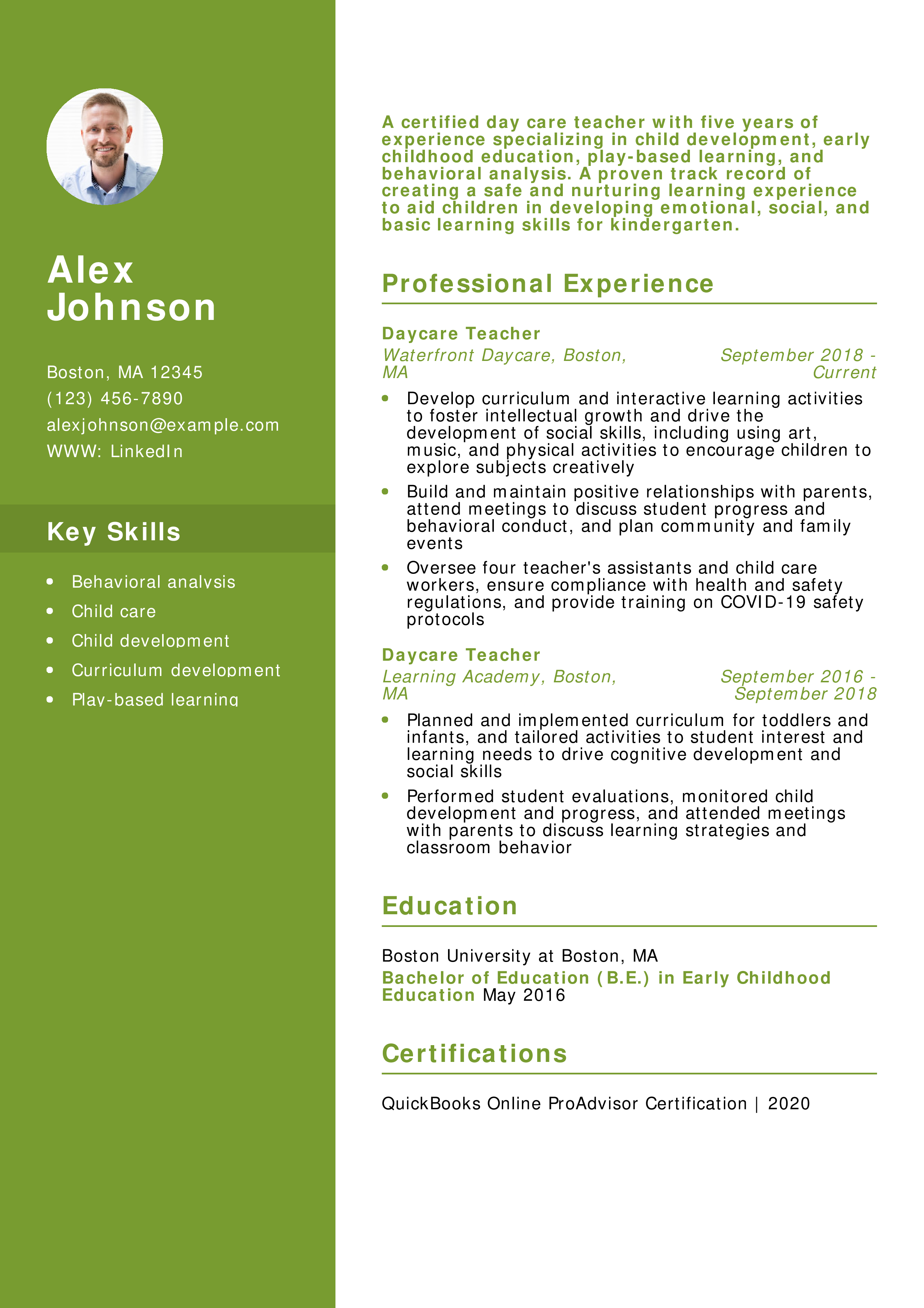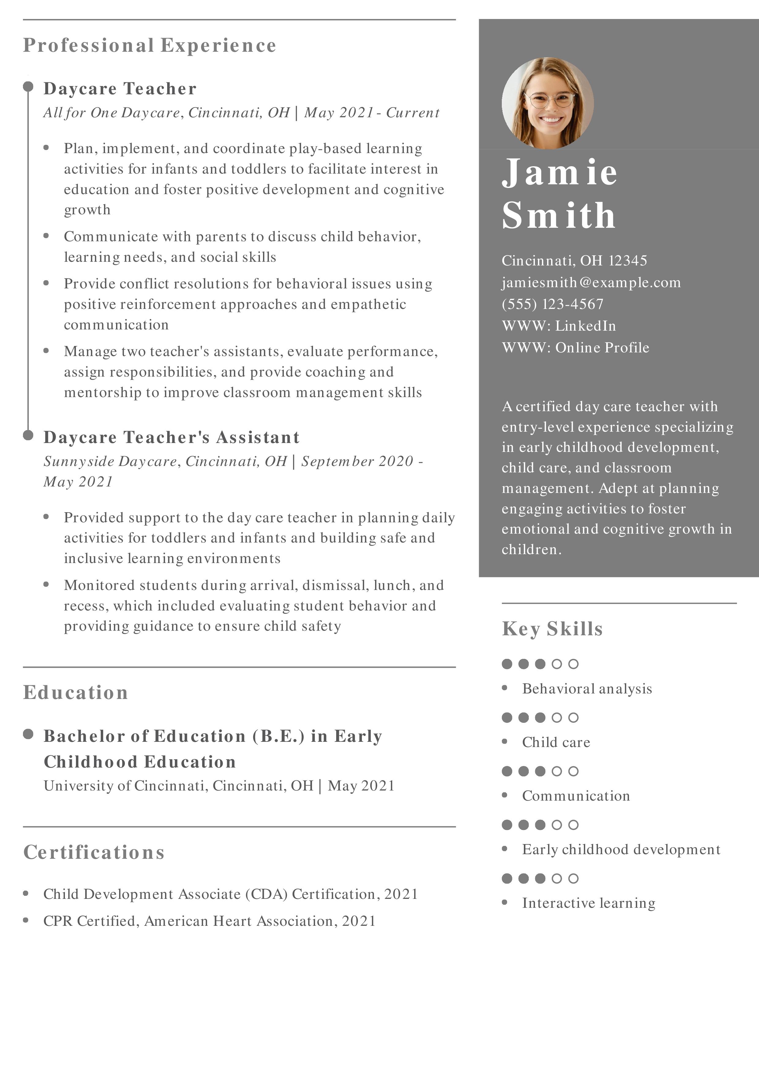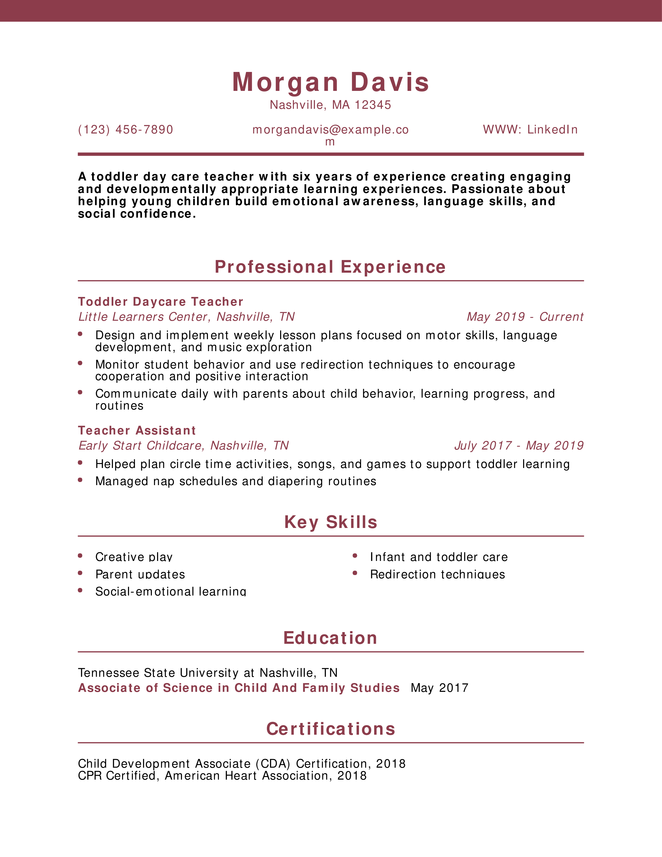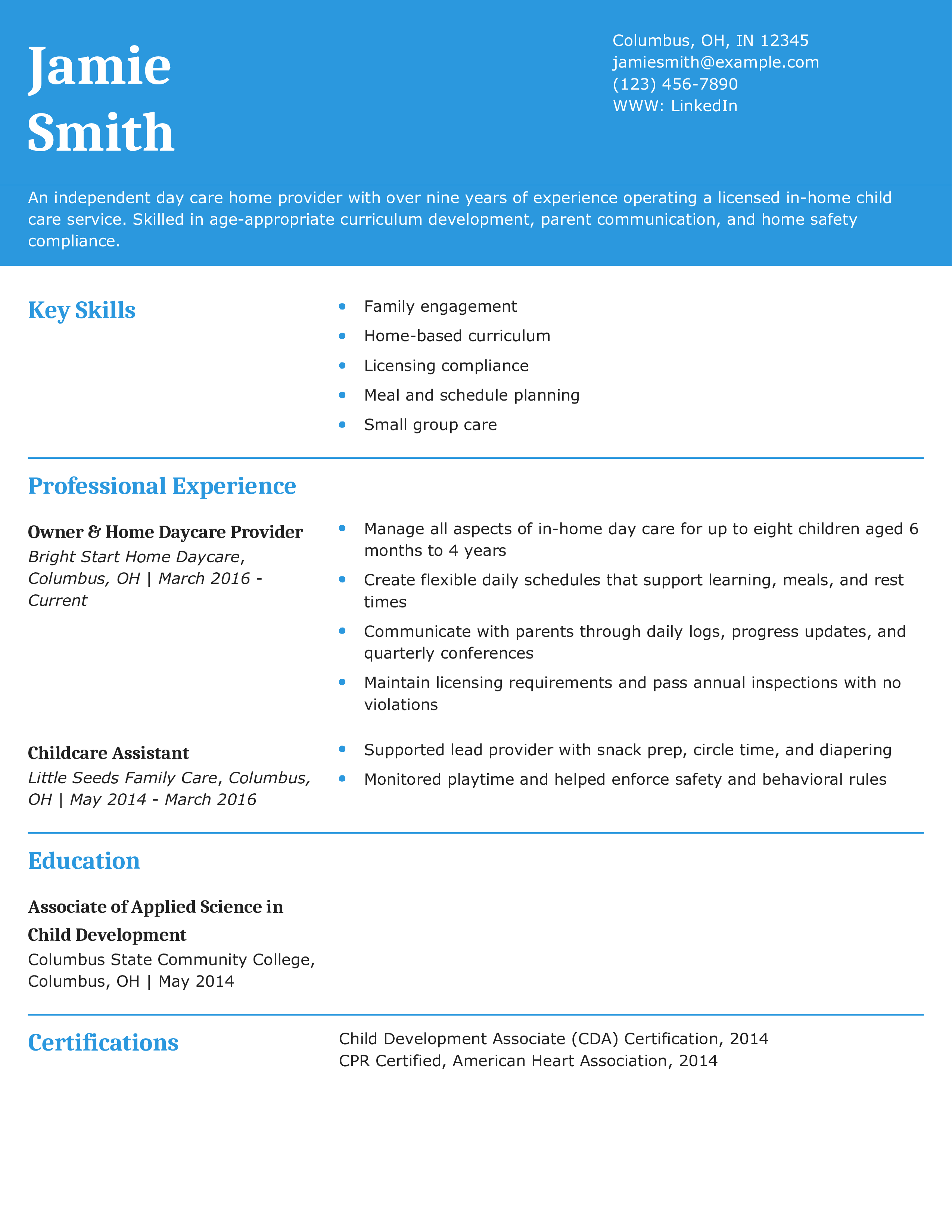 Choose a template that can ideally work for both by looking for an option with clean lines, easy-to-read fonts, and plenty of room for different sections. A daycare teacher’s resume should generally be two pages or fewer, and a single-column layout can help make the most of that space.