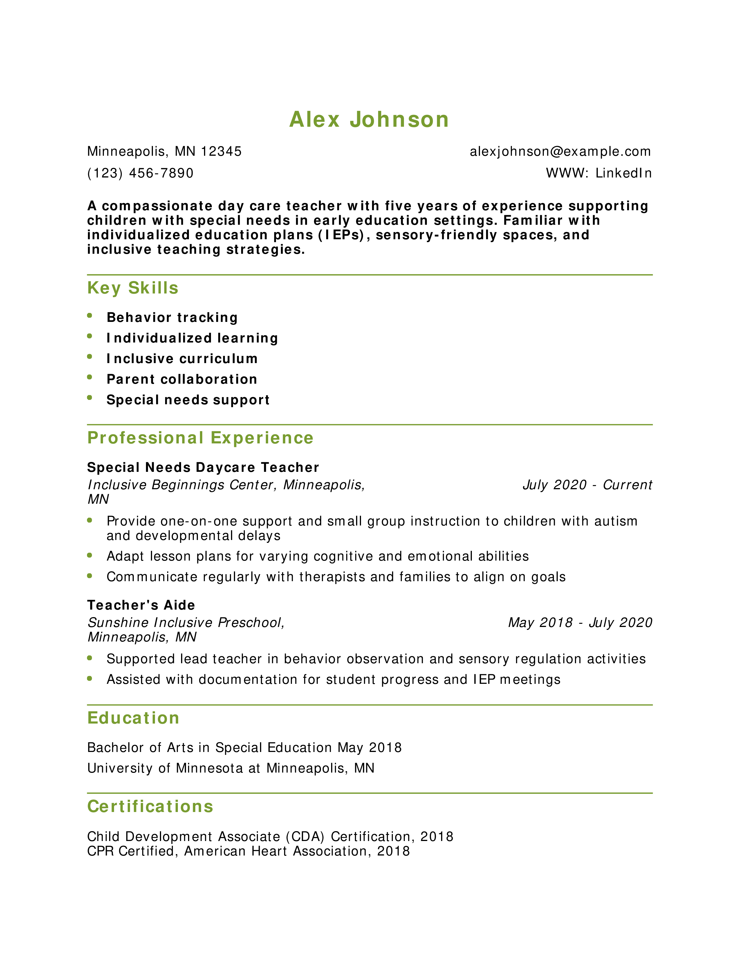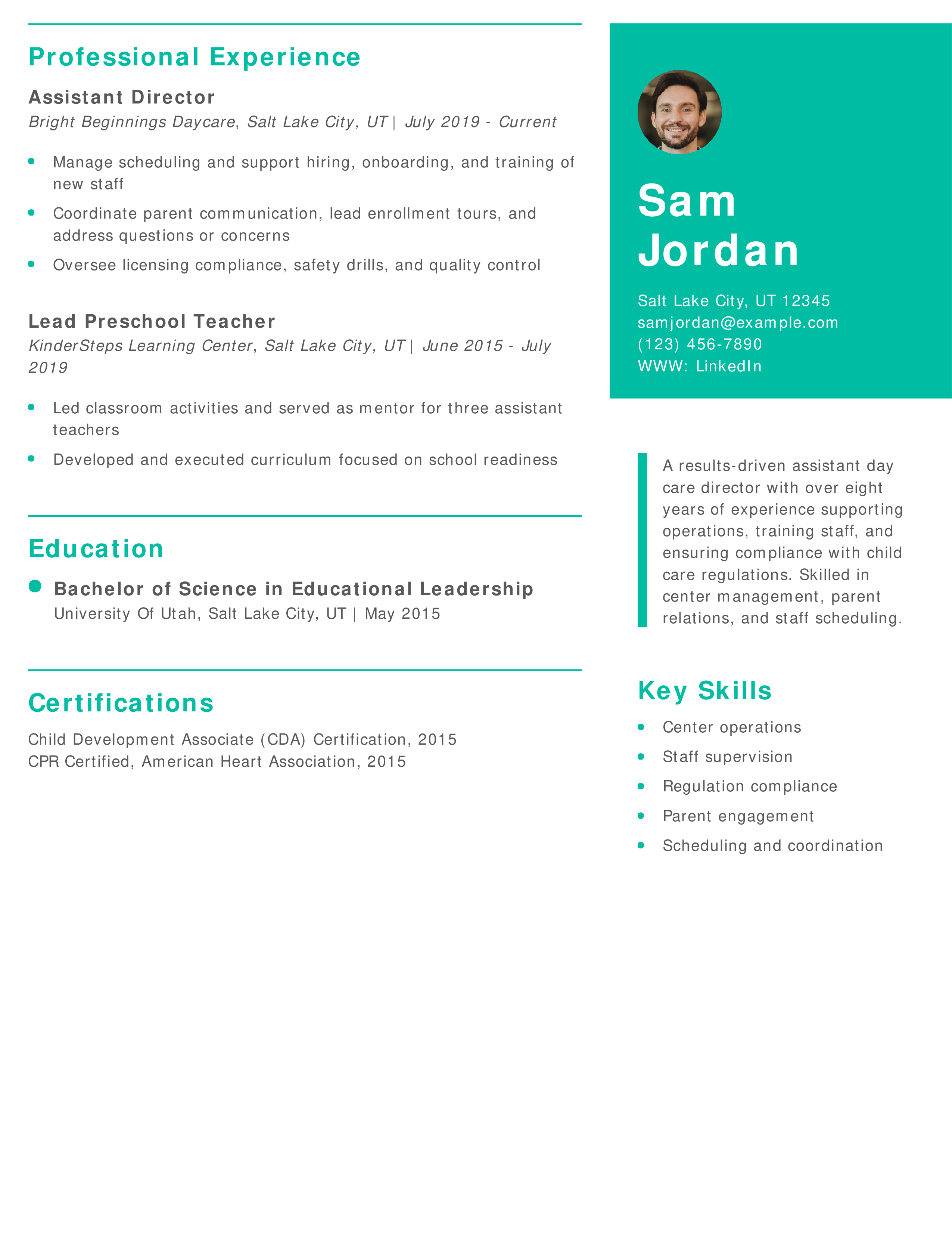This resume is good because it highlights leadership, mentorship, and curriculum strategy, making it ideal for senior-level day care positions. The resume uses consistent formatting and strong action verbs. To improve your own resume writing, start with How To Make a Resume.