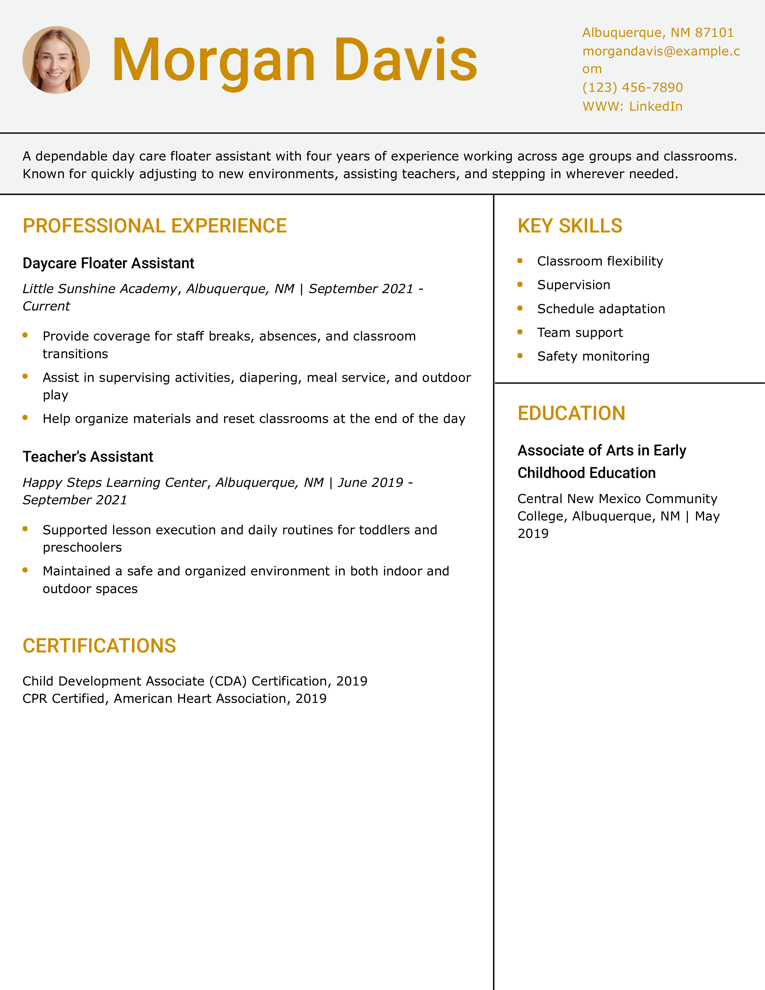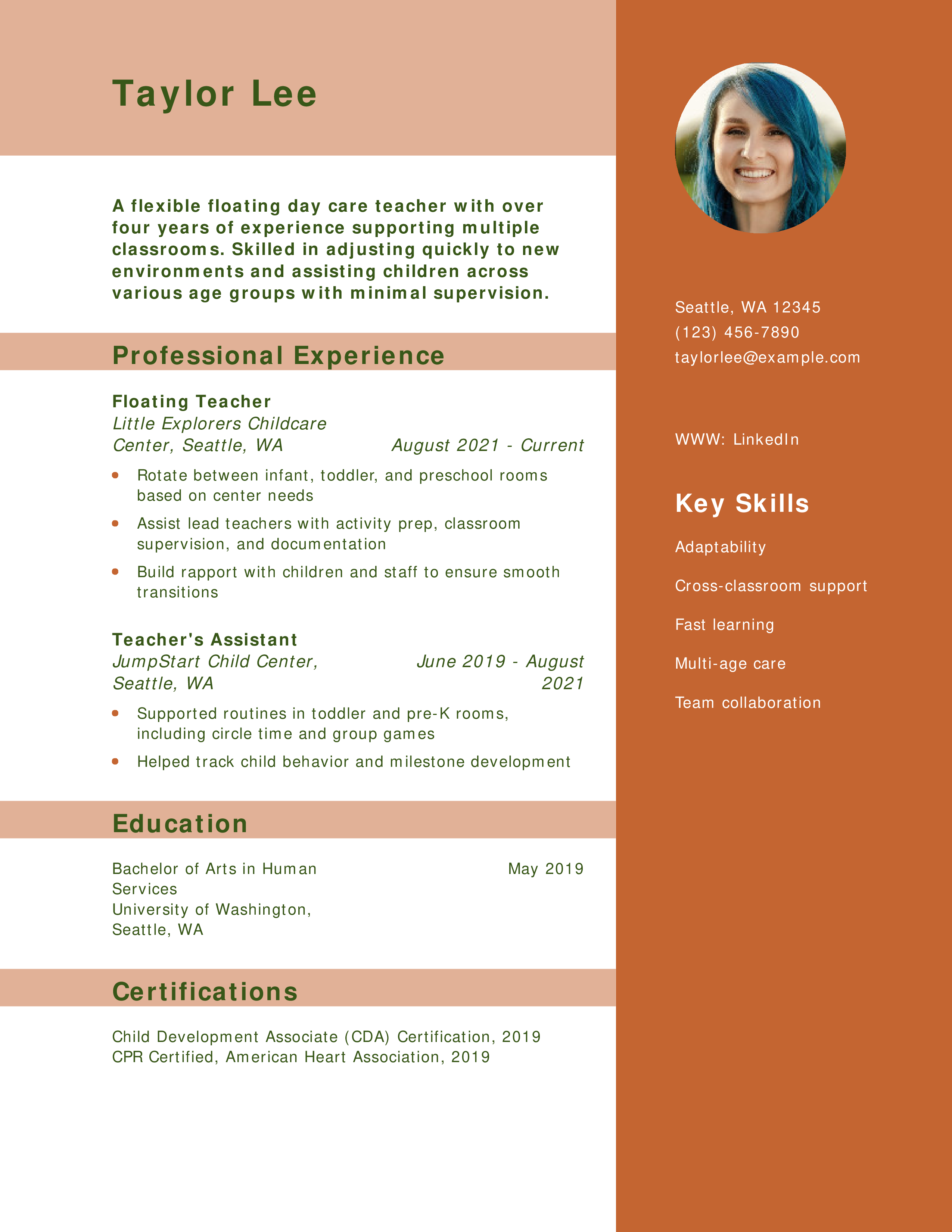 This resume is good because it highlights adaptability and the ability to work with multiple age groups — ideal for floating positions. It also shows long-term commitment to child care roles. To see how to format work history effectively, visit How Far Back Should a Resume Go.