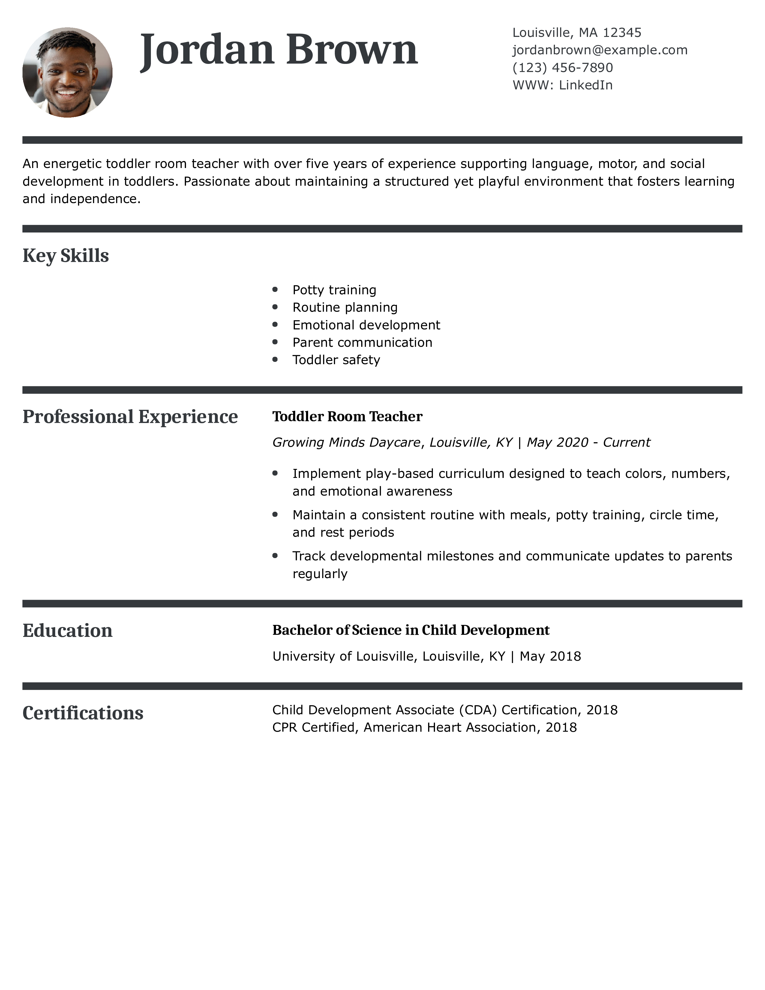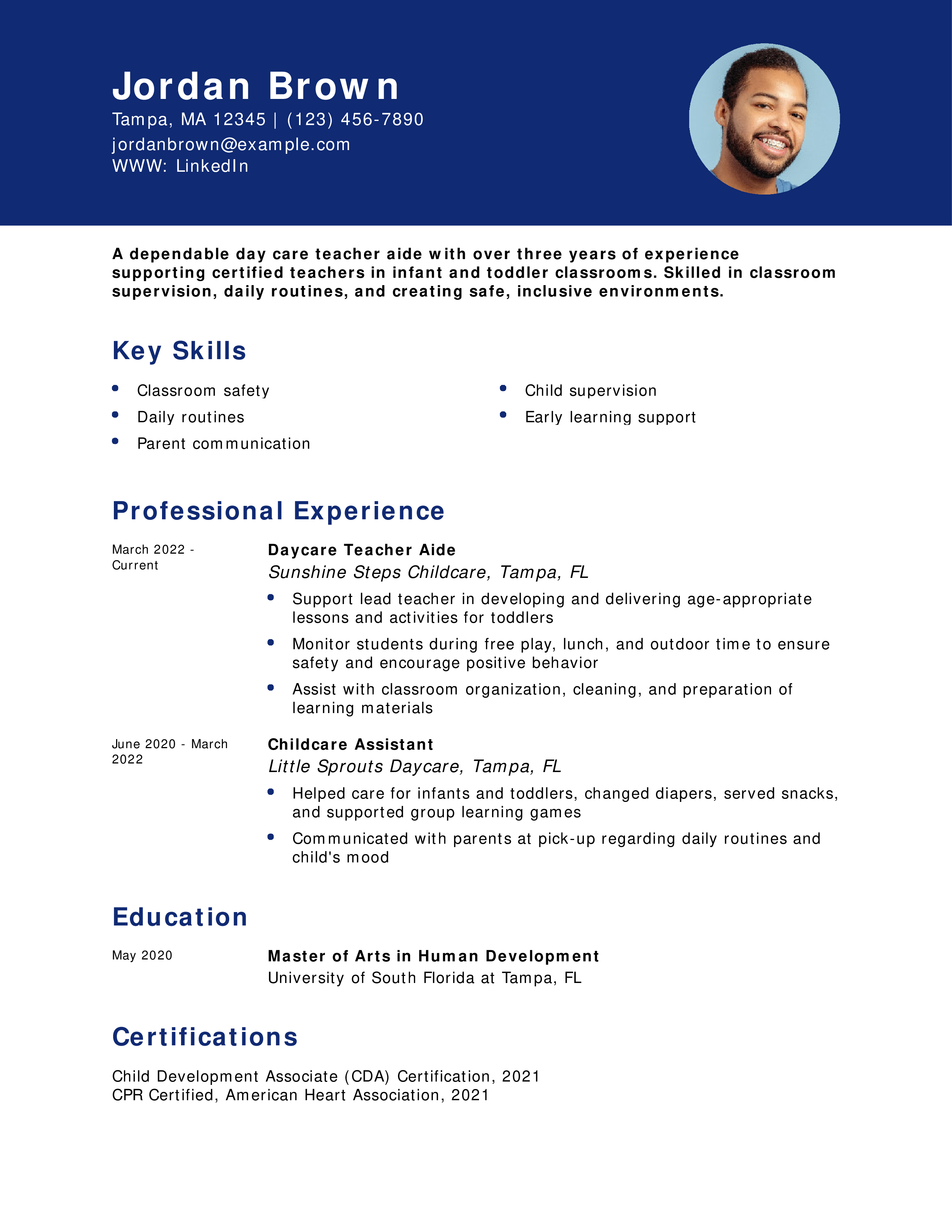 Hiring managers in daycares are looking for candidates with demonstrated early childhood education experience, adaptability, and classroom management skills. Highlighting these in your profile shows you understand the job’s requirements and have the necessary experience.