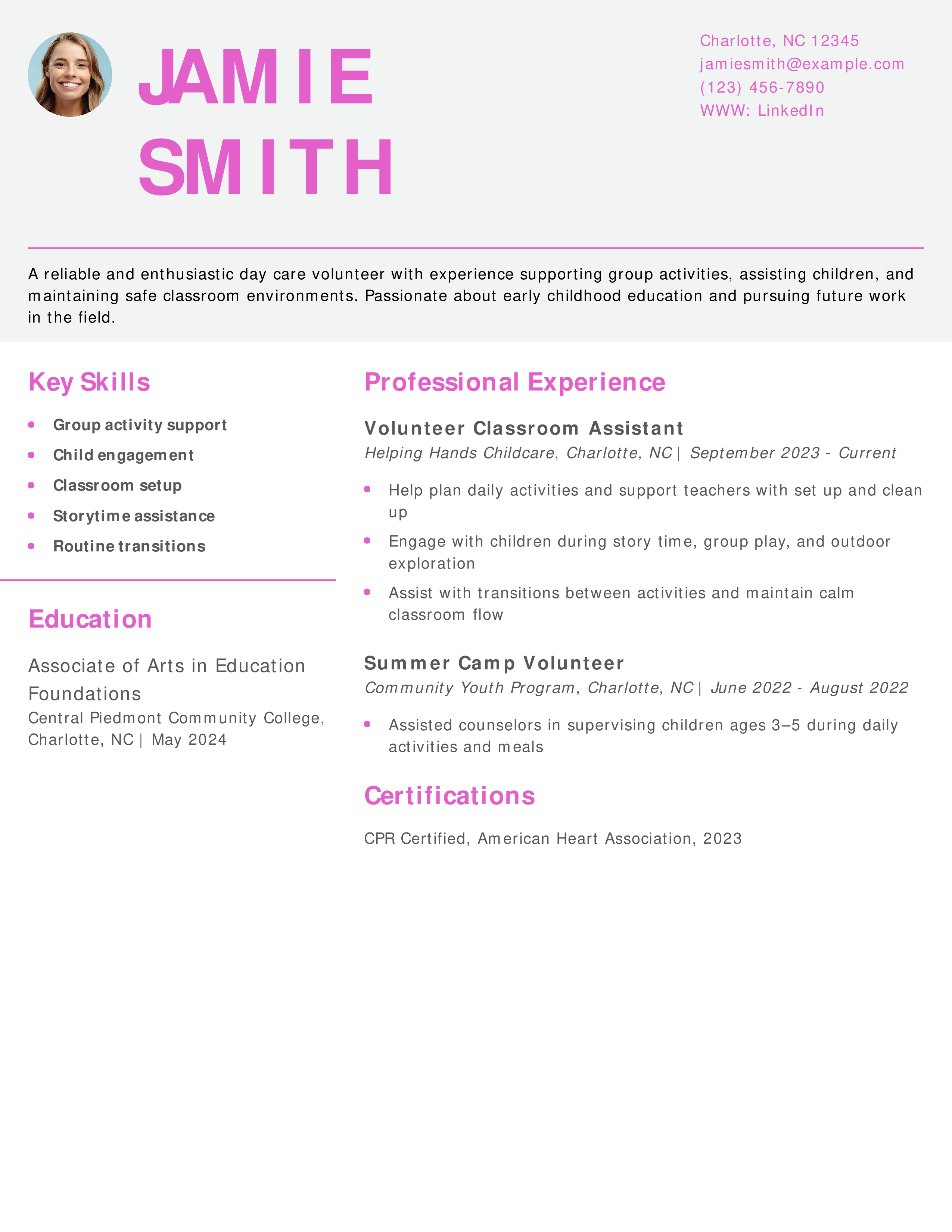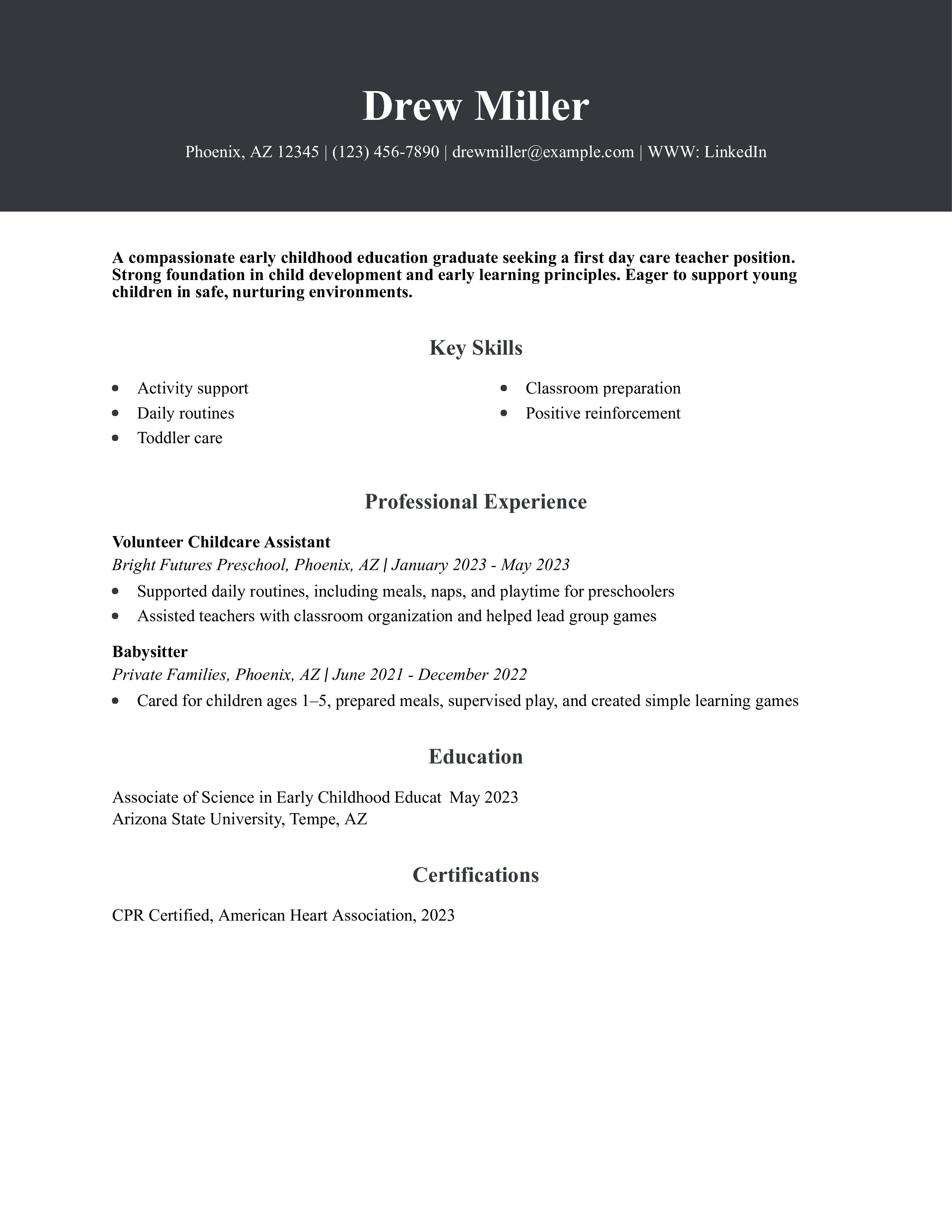 This resume is good because it shows how volunteer and babysitting experience can support a transition into a professional day care role. It’s focused and realistic for an entry-level applicant. For more guidance on resumes without work experience, check out Resume Examples for Teens and Students.