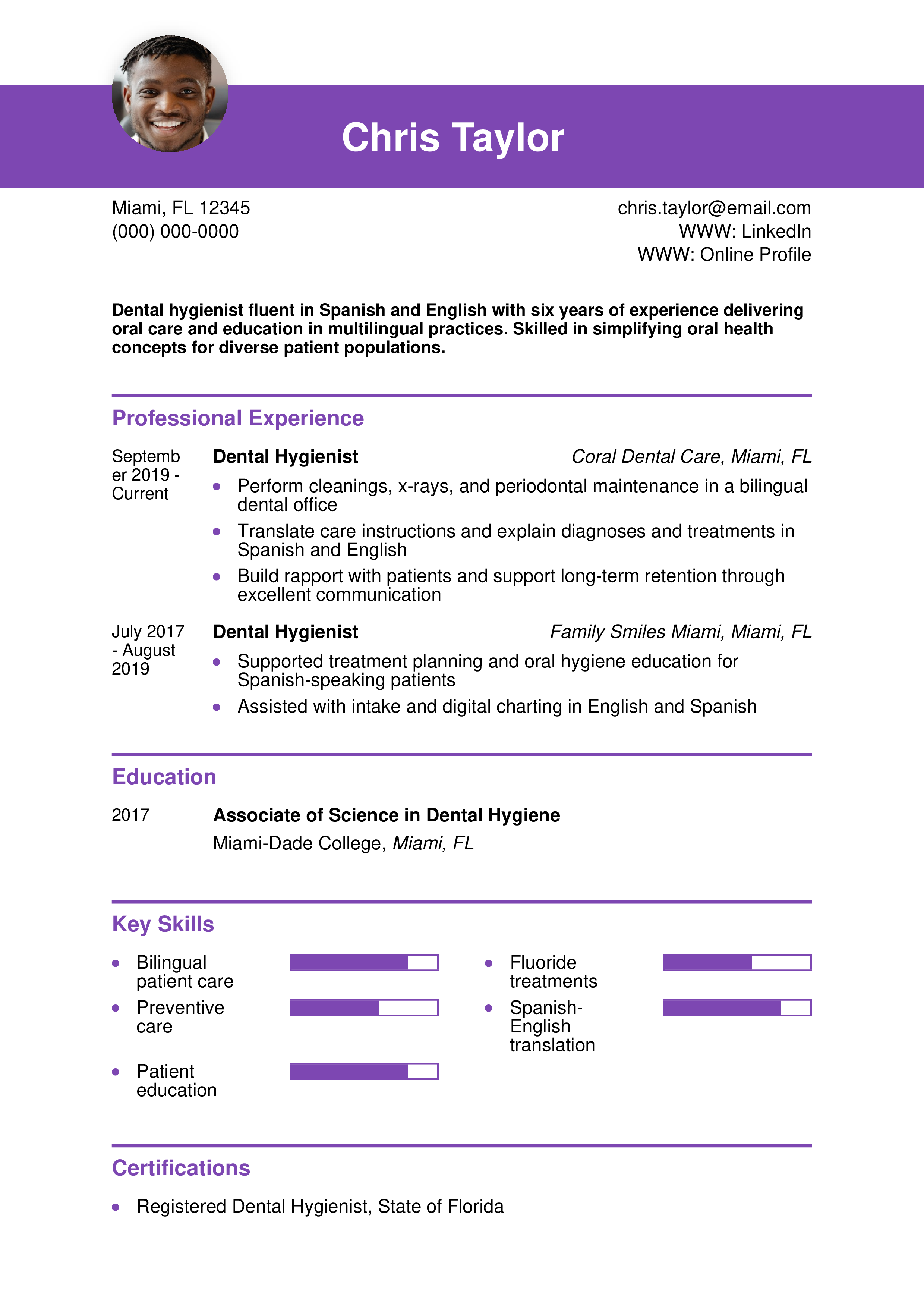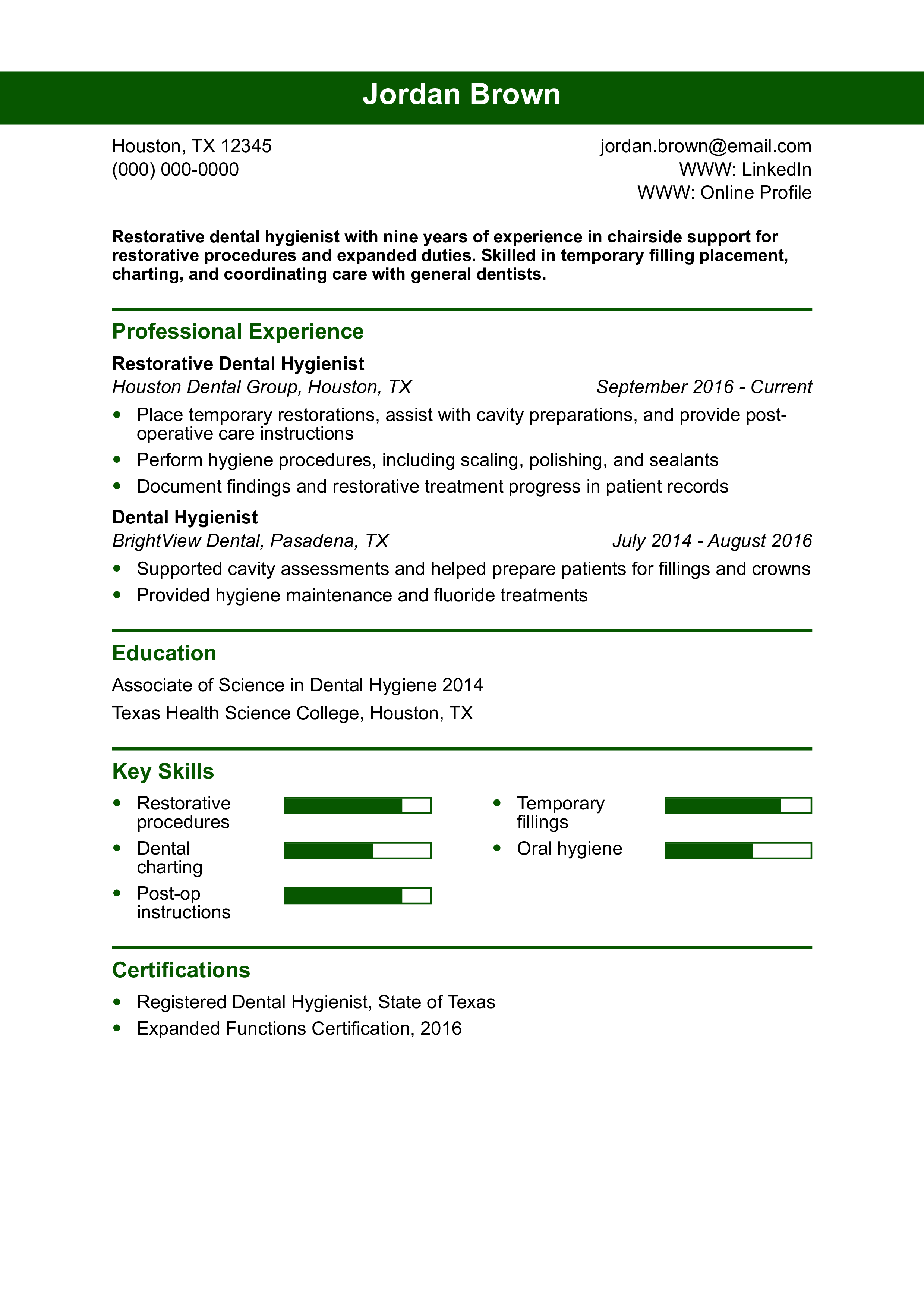 Typically, the reverse chronological format for dental hygienists is the best resume format. This format highlights your professional experience, showcasing your employment timeline and development in the field. It lets you emphasize your relevant clinical skills, patient interactions, and specialized knowledge. The chronological format works well for experienced dental hygienists with a consistent work history and notable achievements.
