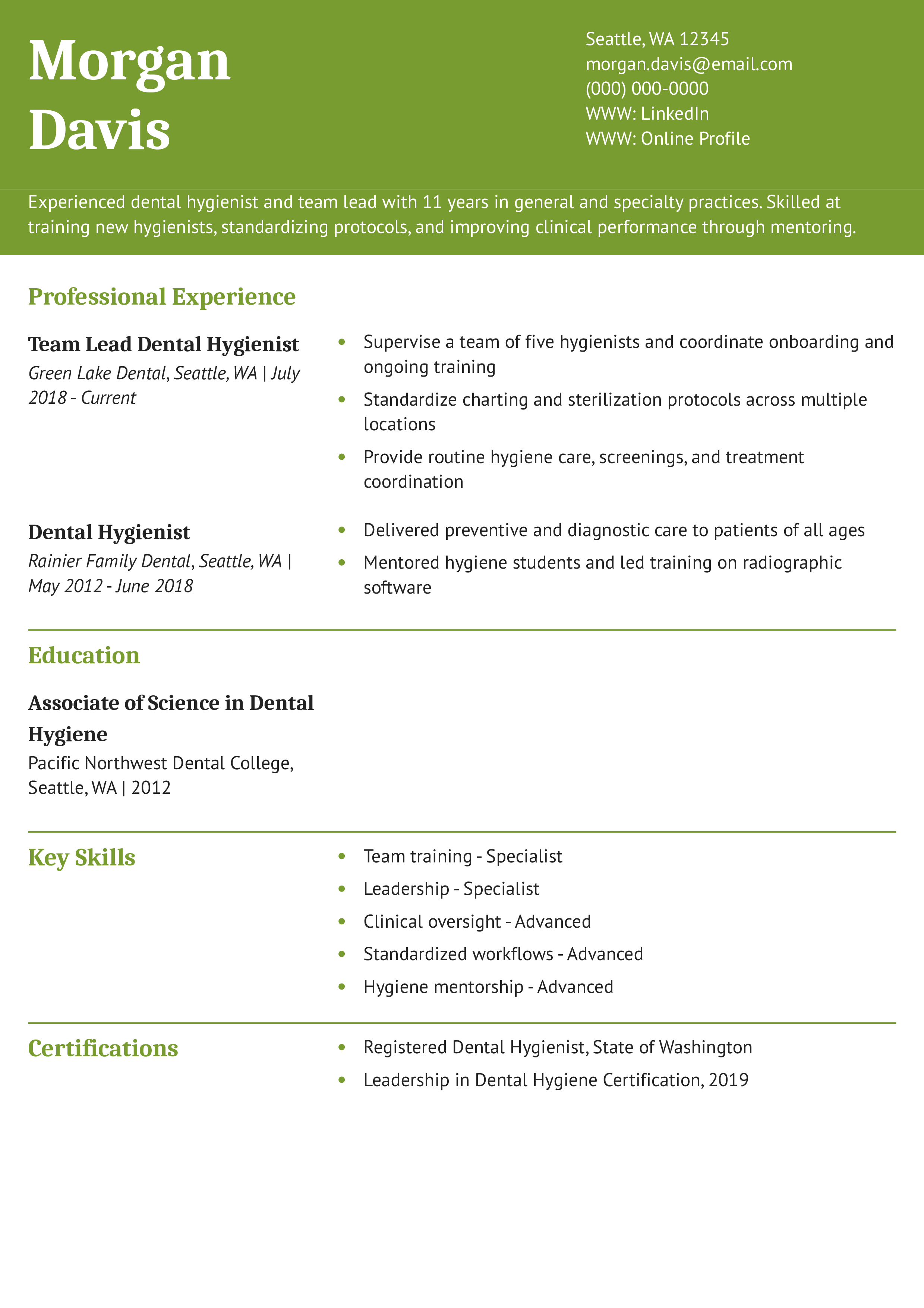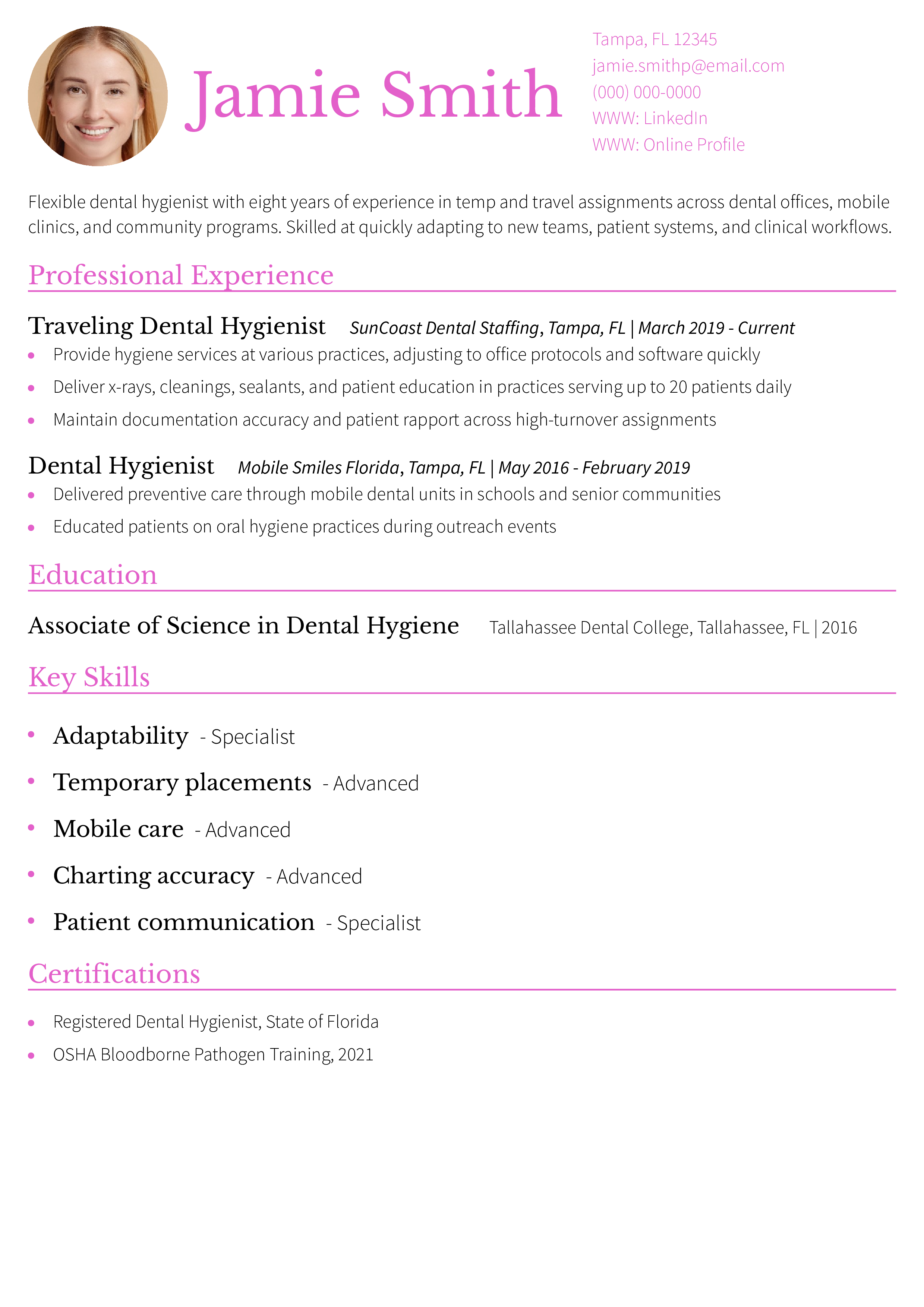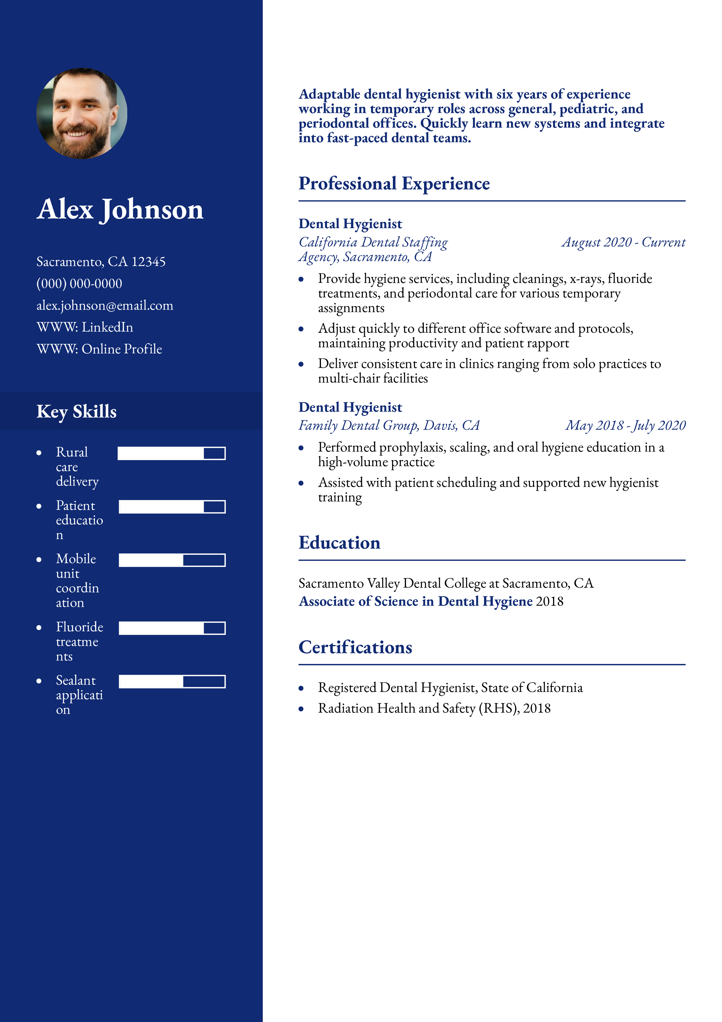 This resume demonstrates adaptability and the ability to deliver consistent care in various settings, a valuable trait for temp hygienist roles. To show similar versatility, visit how to list your education on a resume.