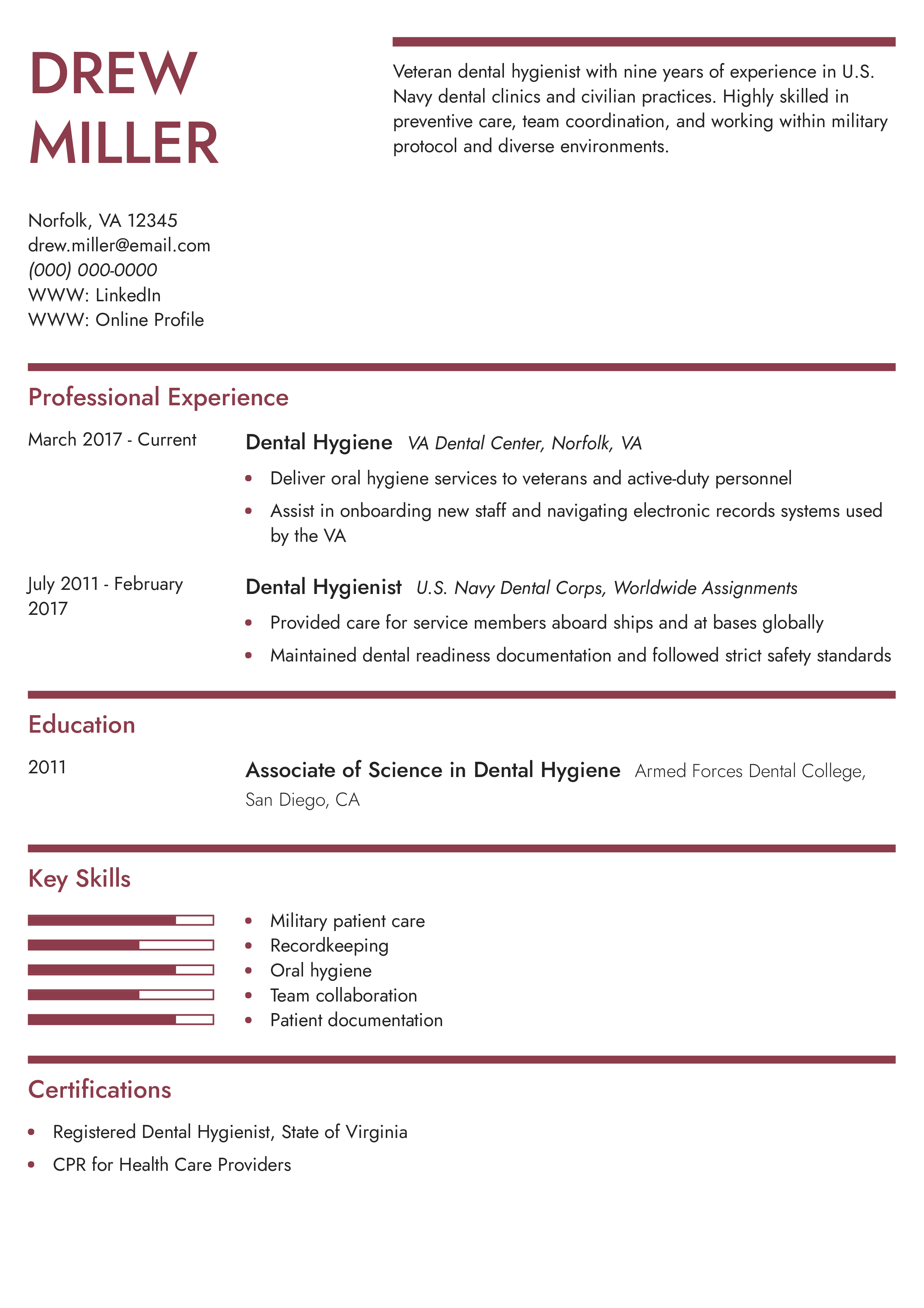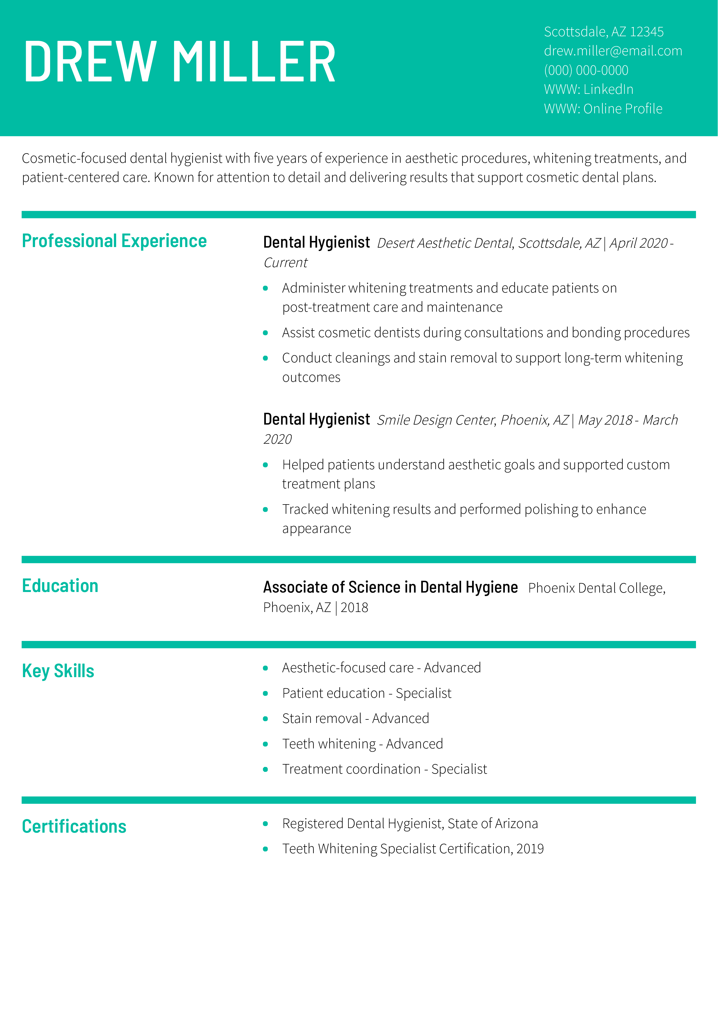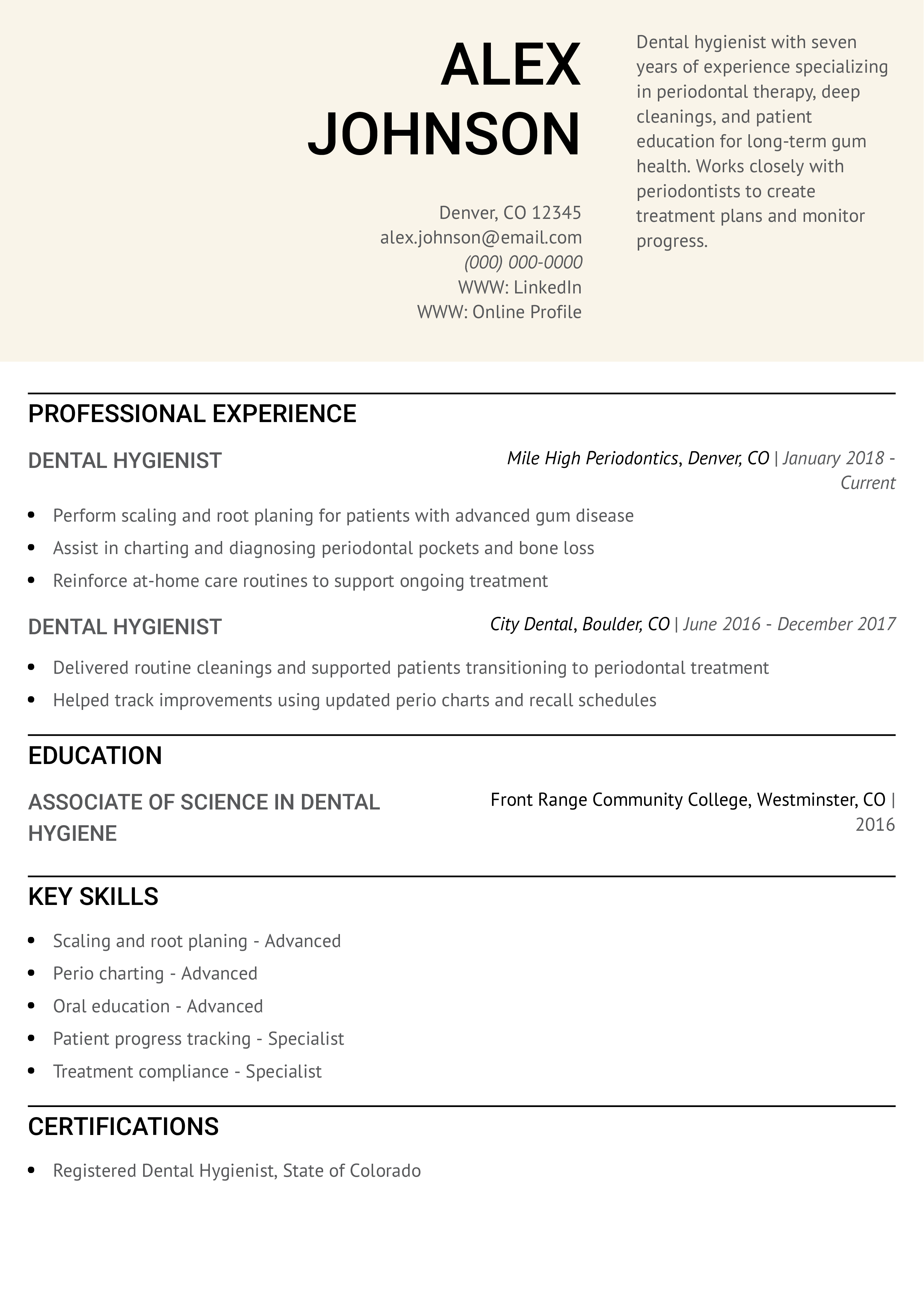 This resume demonstrates adaptability and the ability to deliver consistent care in various settings, a valuable trait for temp hygienist roles. To show similar versatility, visit how to list your education on a resume.