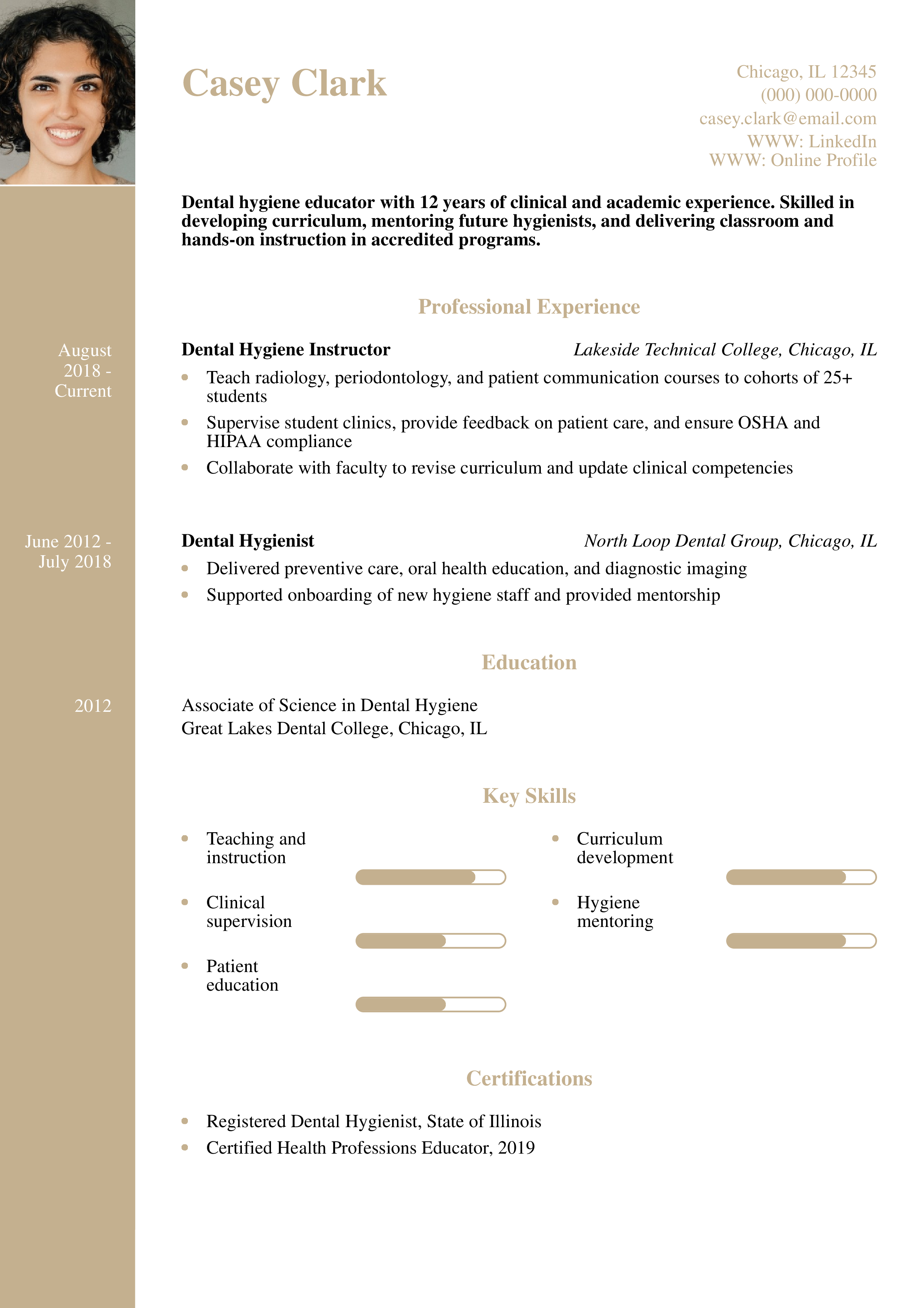 This resume shows a clear transition from clinical practice to education, a path many experienced hygienists pursue. If you're preparing for a similar shift, review resume objective examples to learn how to reframe your summary.
