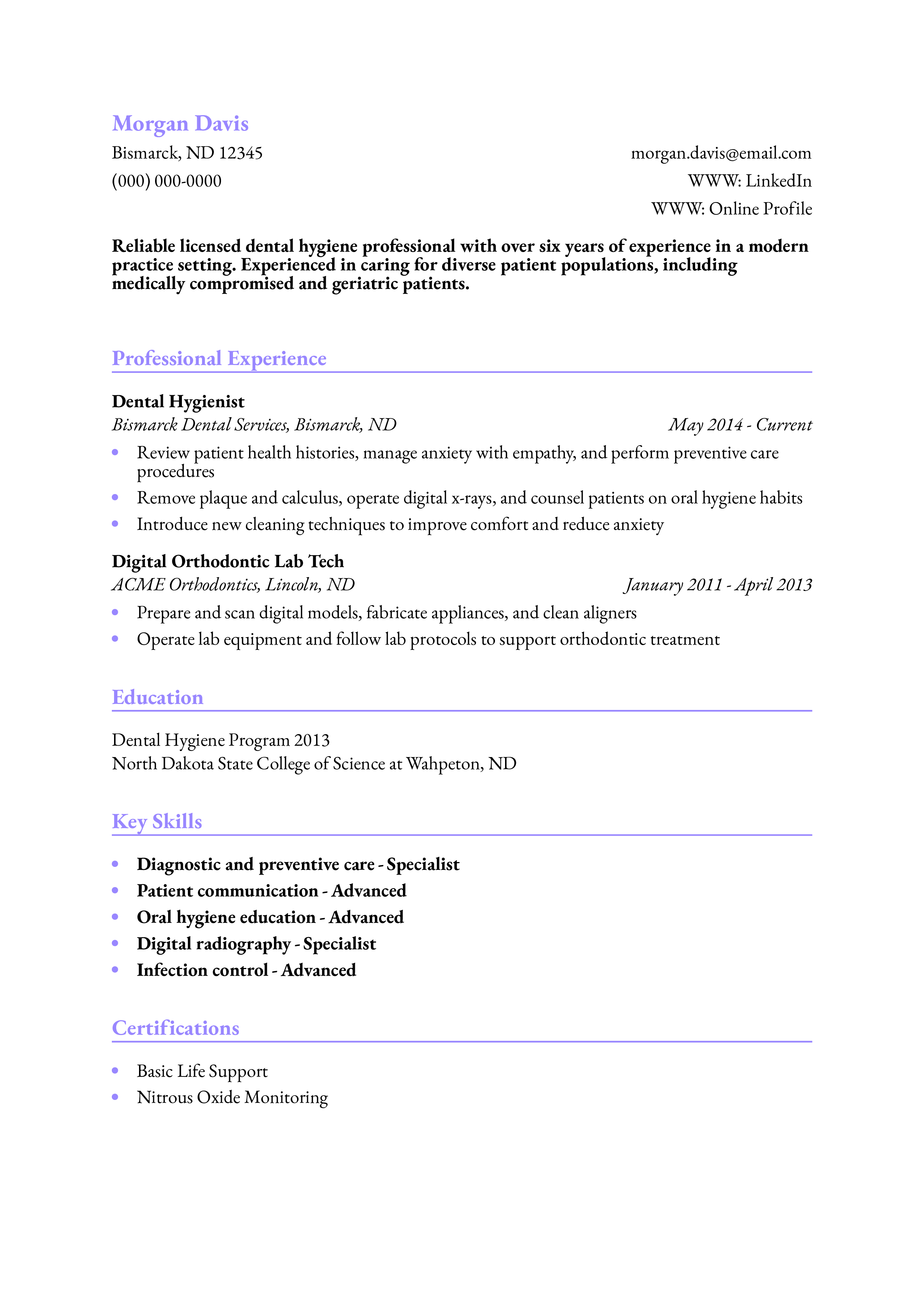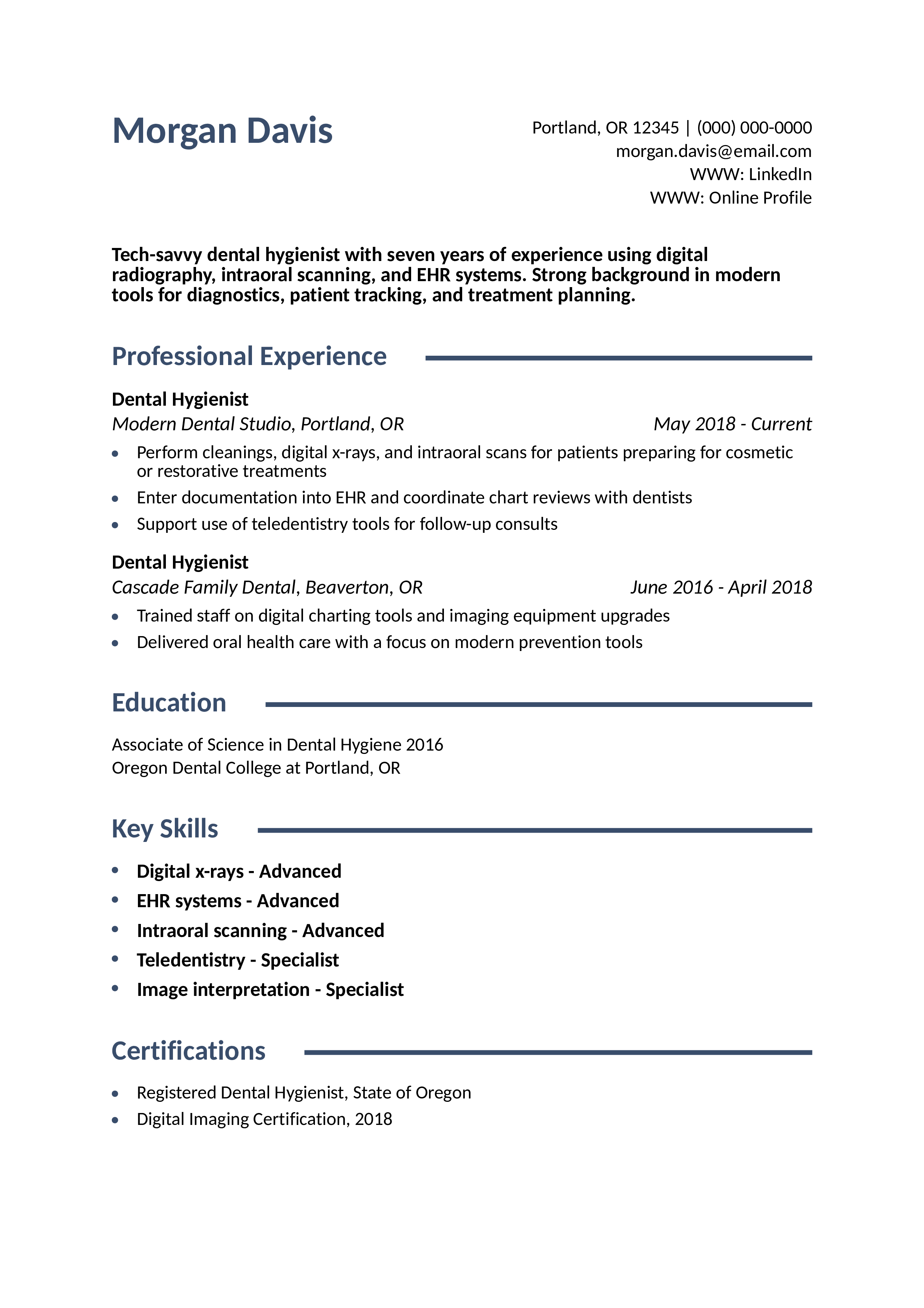 This resume provides a clear summary of advanced clinical knowledge, from radiography to orthodontic lab work. It’s especially effective in showing how experience with diverse patients translates to versatile care. See how to list certifications on a resume to learn how credentials can strengthen your application.