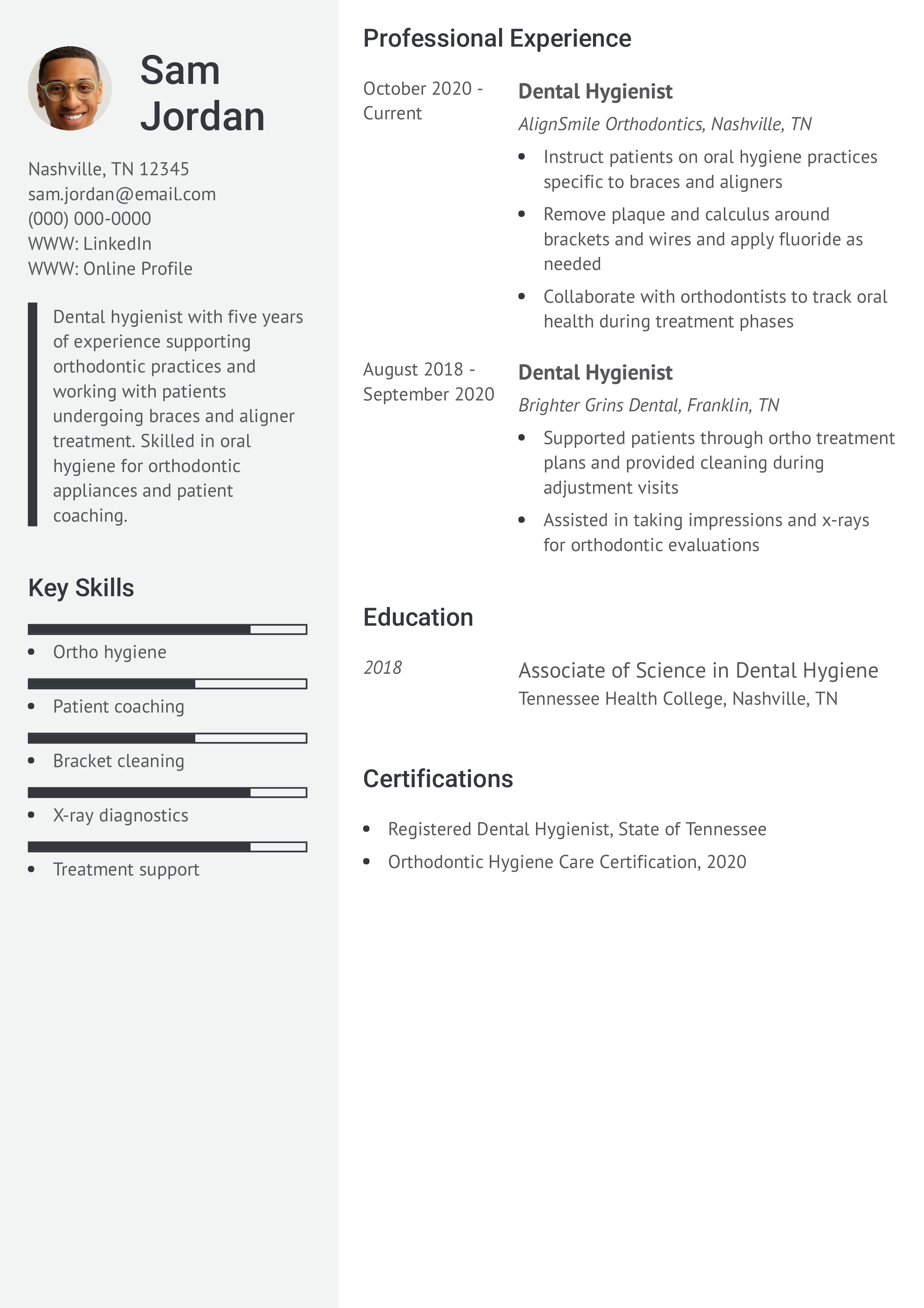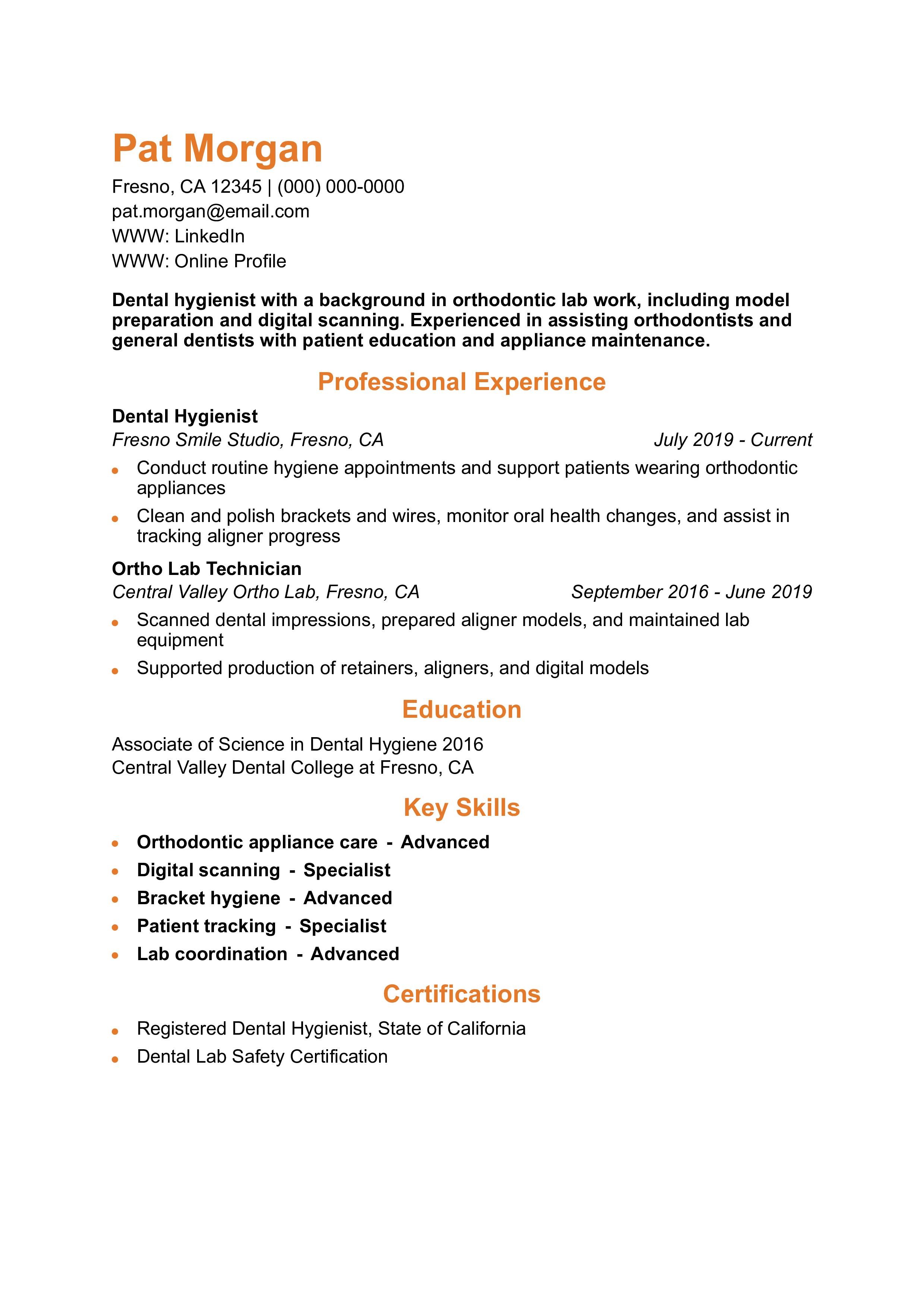 This resume is tailored for an orthodontic environment and emphasizes how hygiene care shifts with appliances. To better tailor your resume for specialized roles, review resume objective examples.