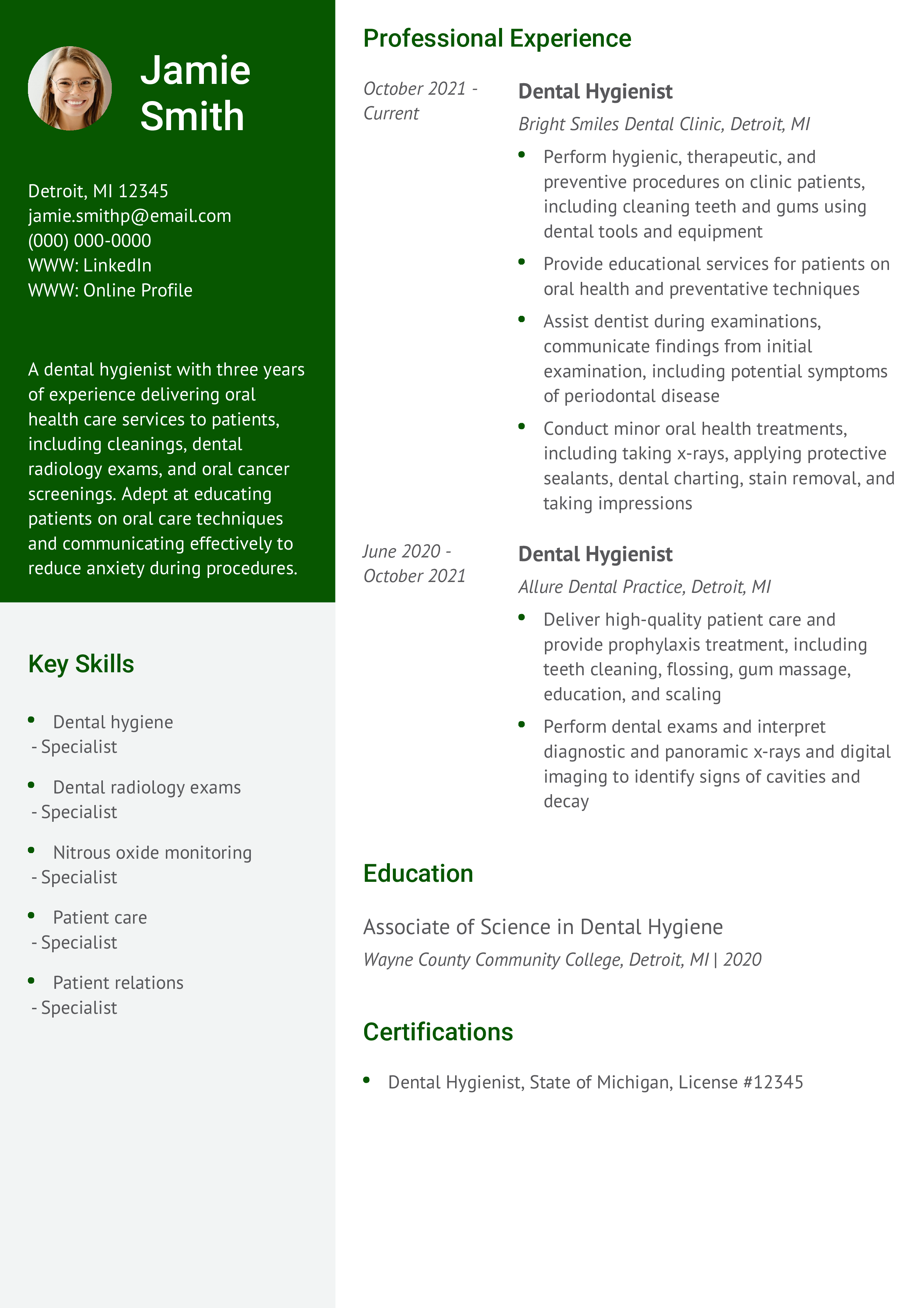 - Dental Hygienist, State of Michigan – 2016, License #12345