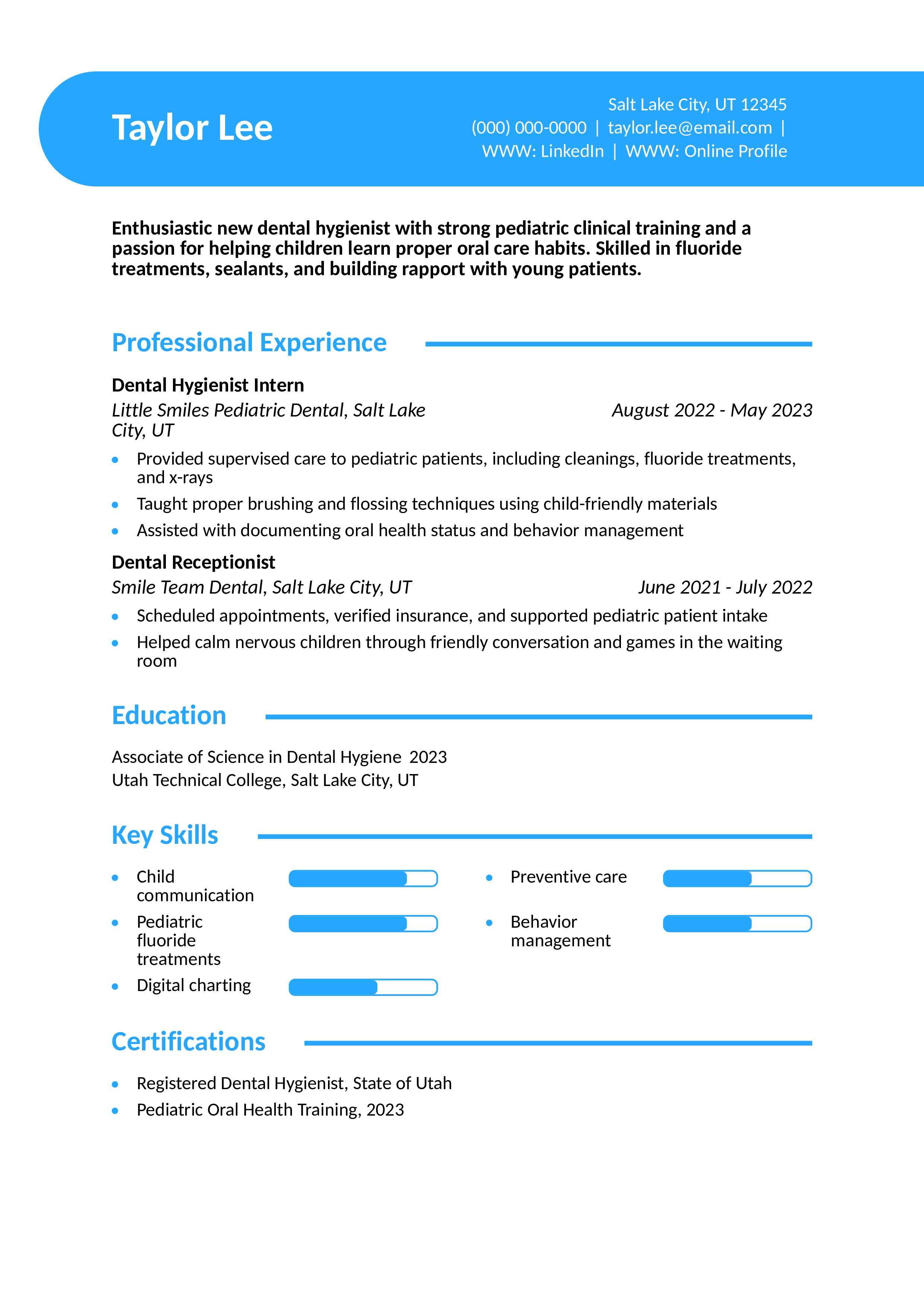 This resume effectively showcases early experience while displaying competence in procedures like x-rays, sealants, and patient education. The emphasis on supporting dentists during exams helps show versatility. For more on structuring a skills-based resume, check out how to make a resume.