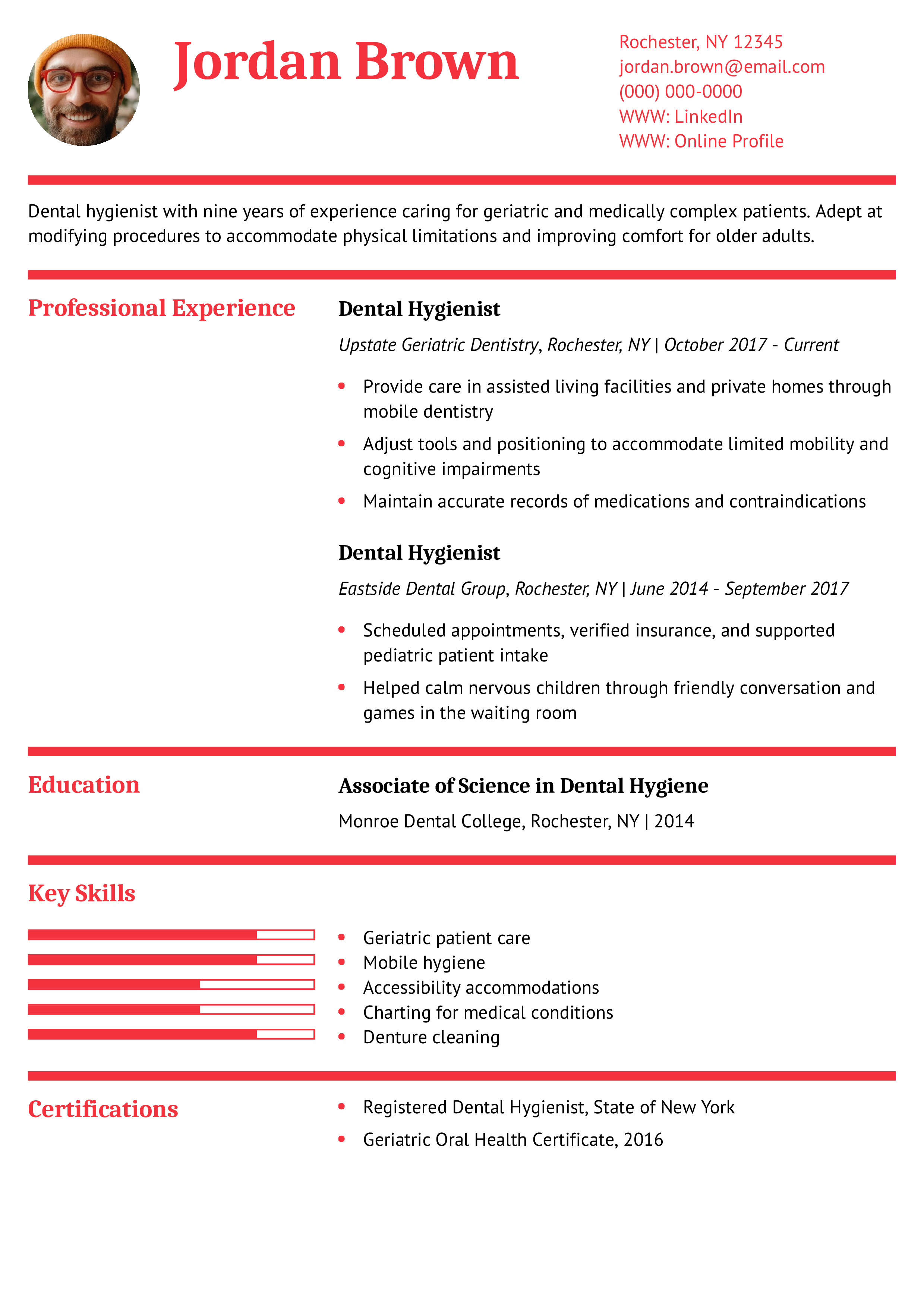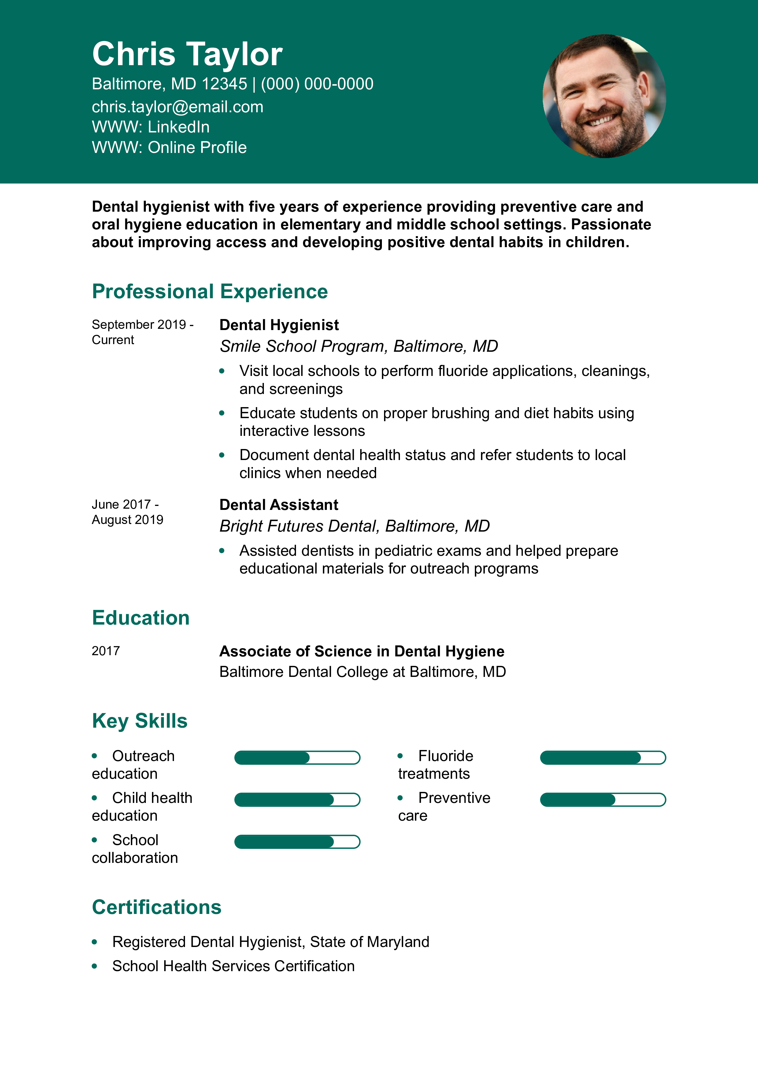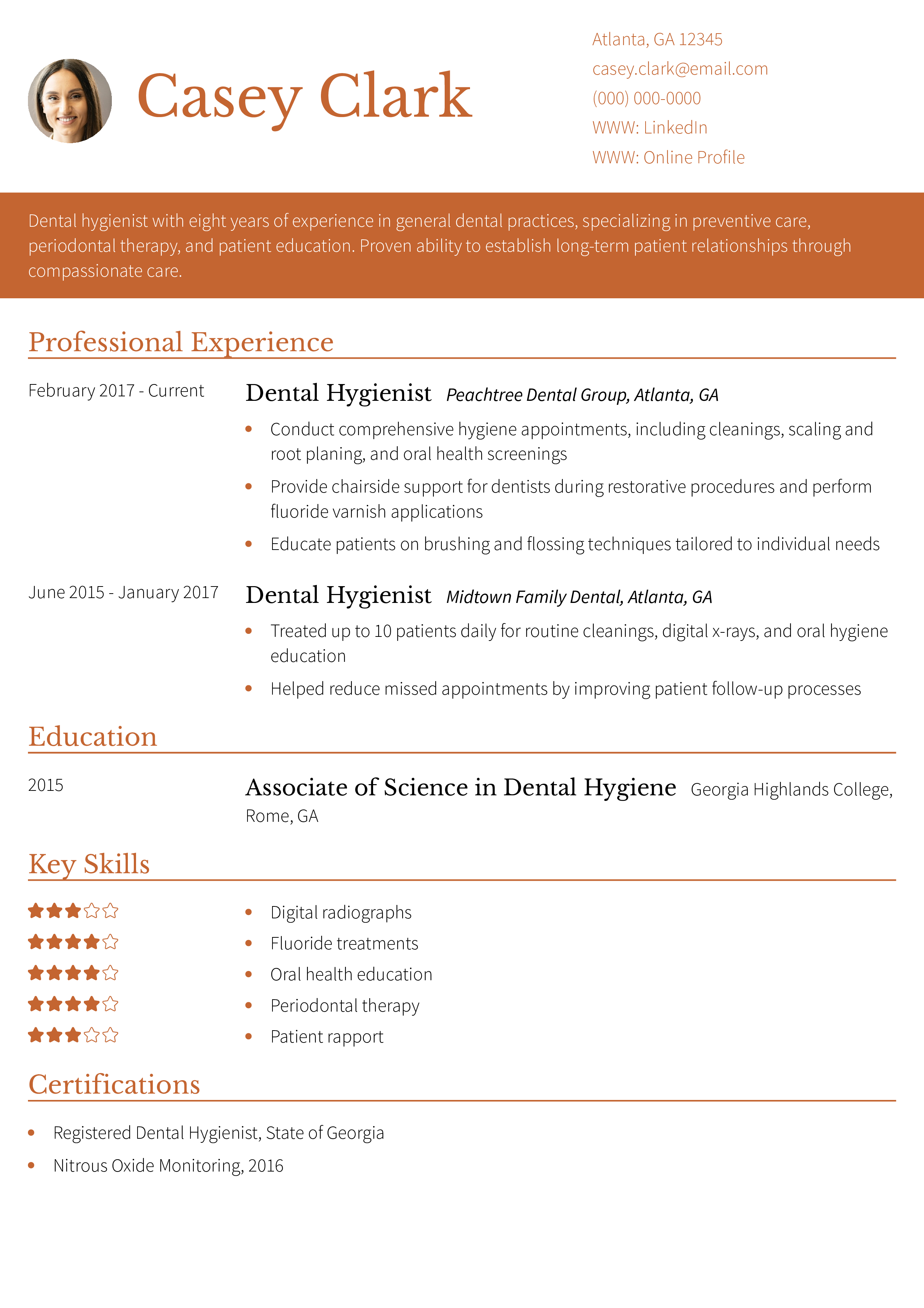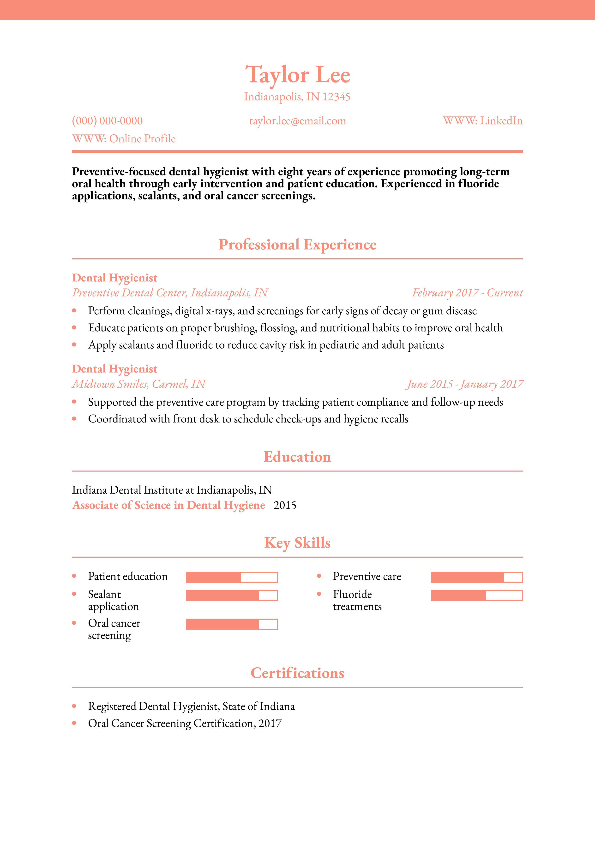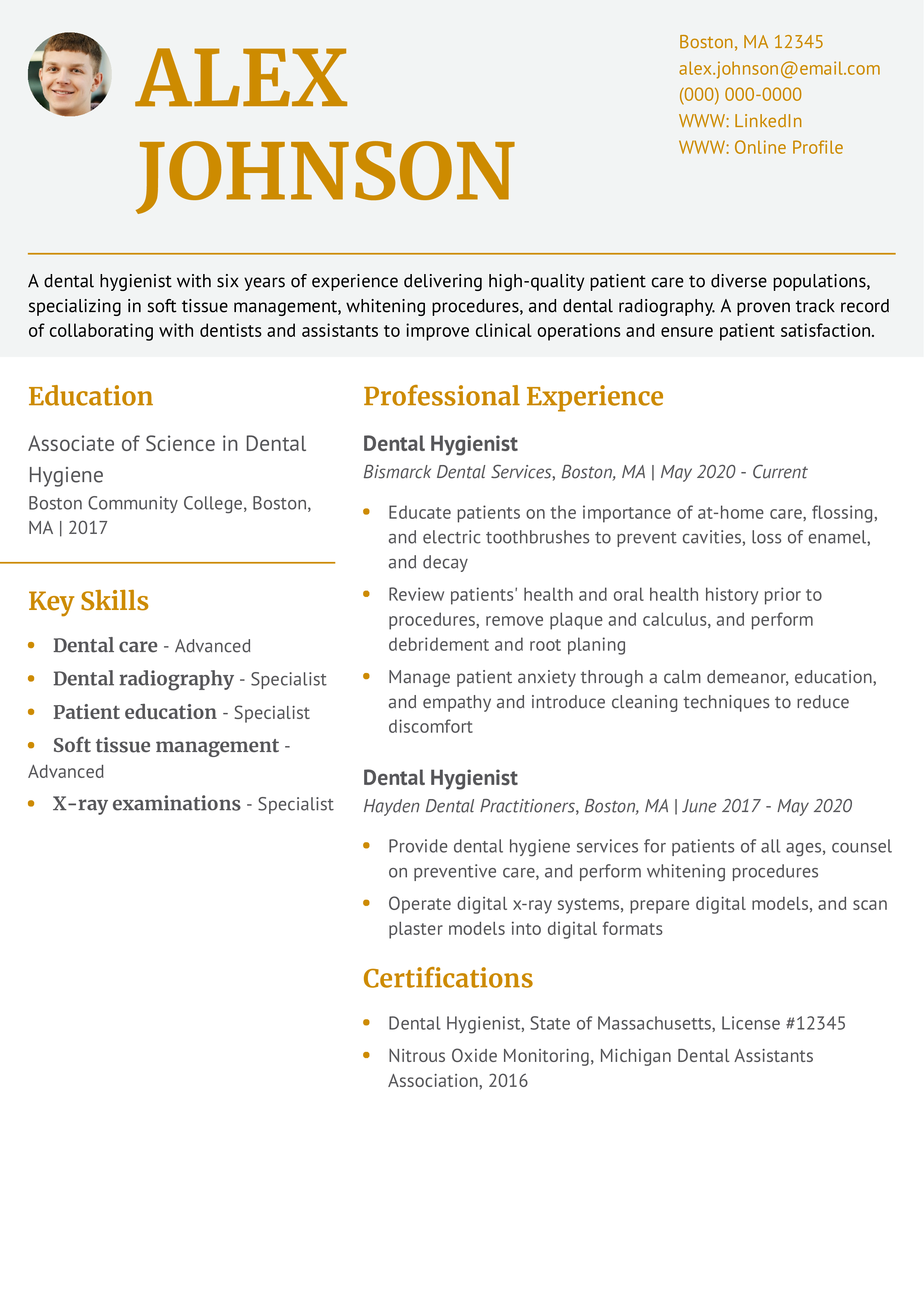 A skills section demonstrates your ability to perform dental hygiene duties and highlights your qualifications as a dental professional. Include these skills to showcase your ability to provide comprehensive dental care, educate patients on oral hygiene practices, and ensure a safe and sterile clinical environment. Be sure to match your skills with those required for the job you’re applying for.