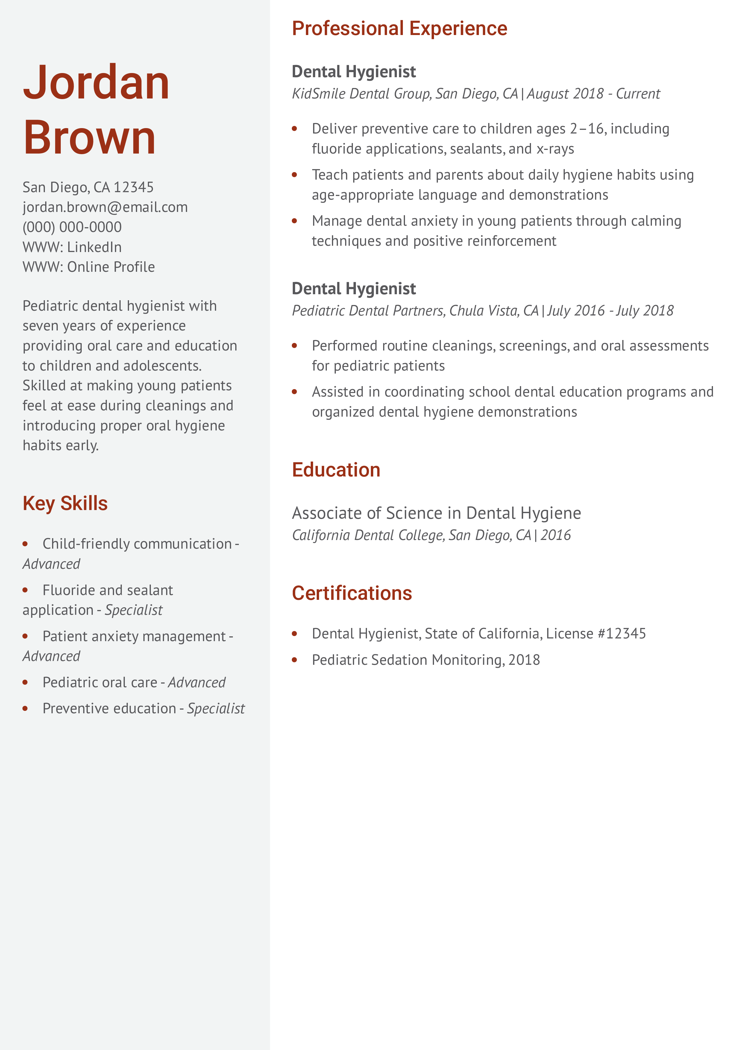 This resume showcases specialized skills in working with children, which requires empathy and patience. It emphasizes educational outreach and preventative care, both key in pediatric dentistry. Learn how to highlight specialized experience in soft skills for a resume.