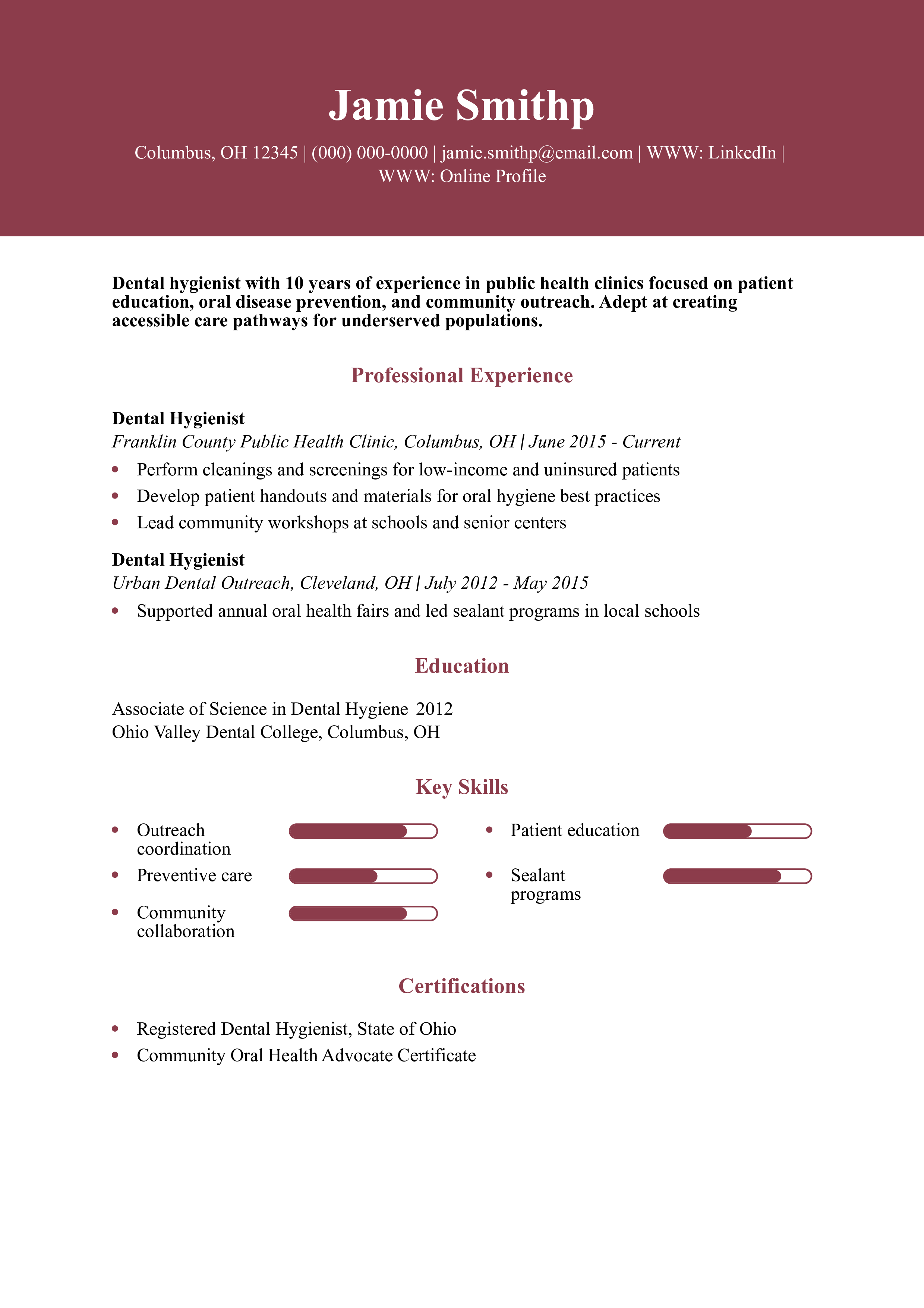 This resume works well by focusing on outreach and educational roles in youth programs. It shows how hygienists can make an impact outside traditional clinics. See how to put volunteer work on a resume to add similar experience.
