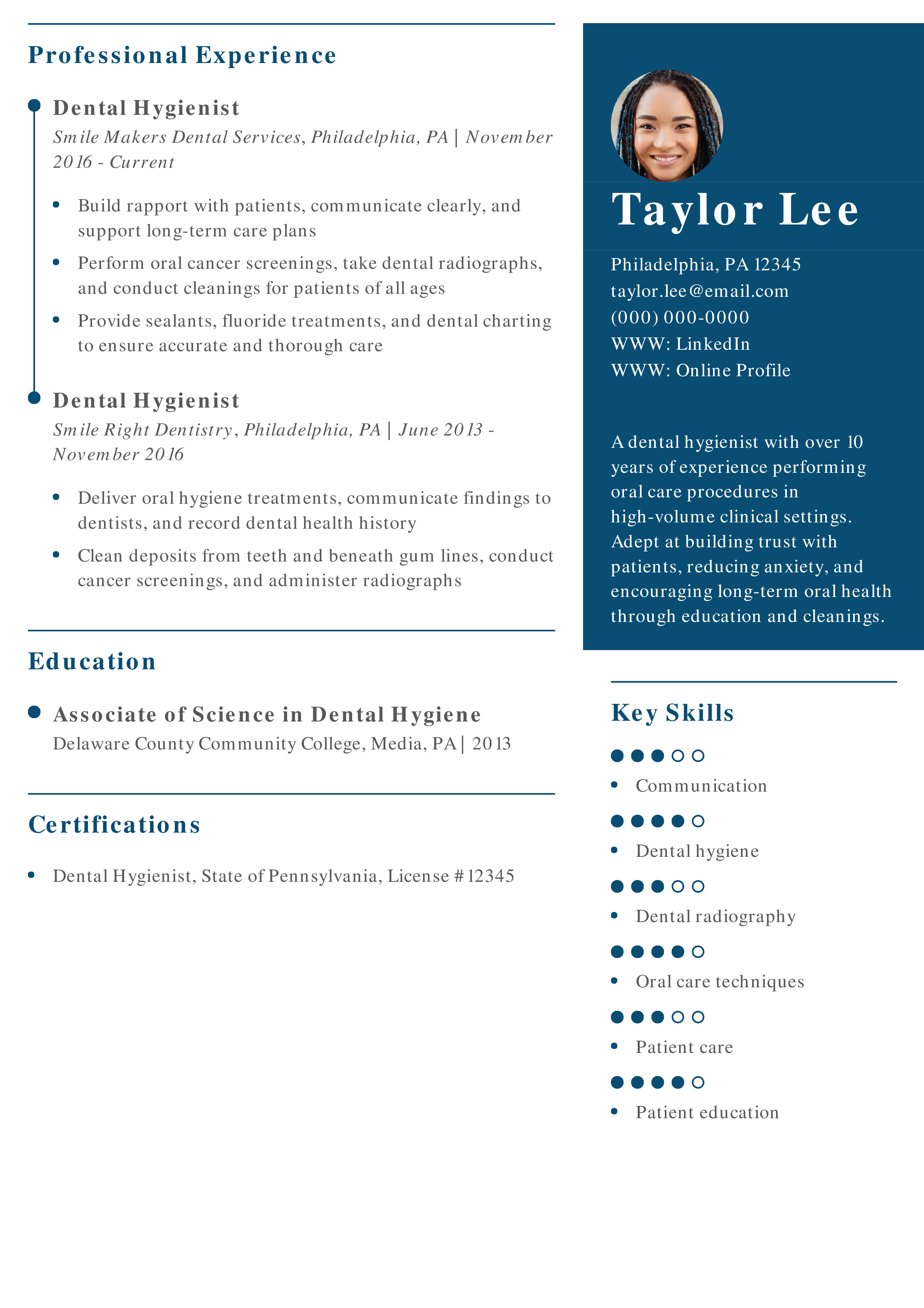A dental hygienist with over 10 years of experience performing oral care procedures in a high-volume clinical environment. A strong history of educating patients on oral care techniques to promote long-term health. Adept at communicating effectively with many patients to reduce anxiety and discomfort.