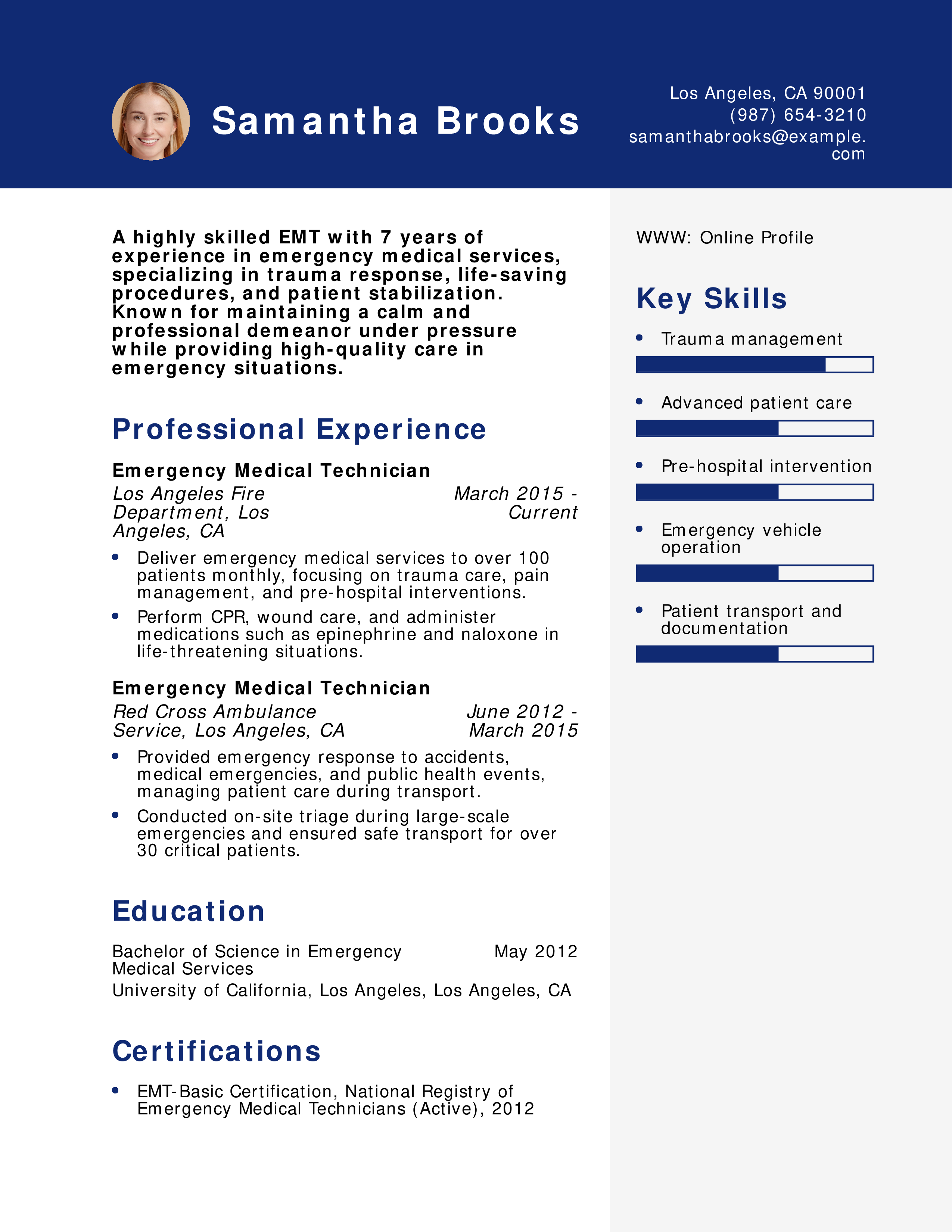 A certified EMT with entry-level experience specializing in patient transport, pre-hospital care, communication, and ambulance operations. Adept at coordinating with medical teams to deliver emergency treatment to patients in crisis situations.