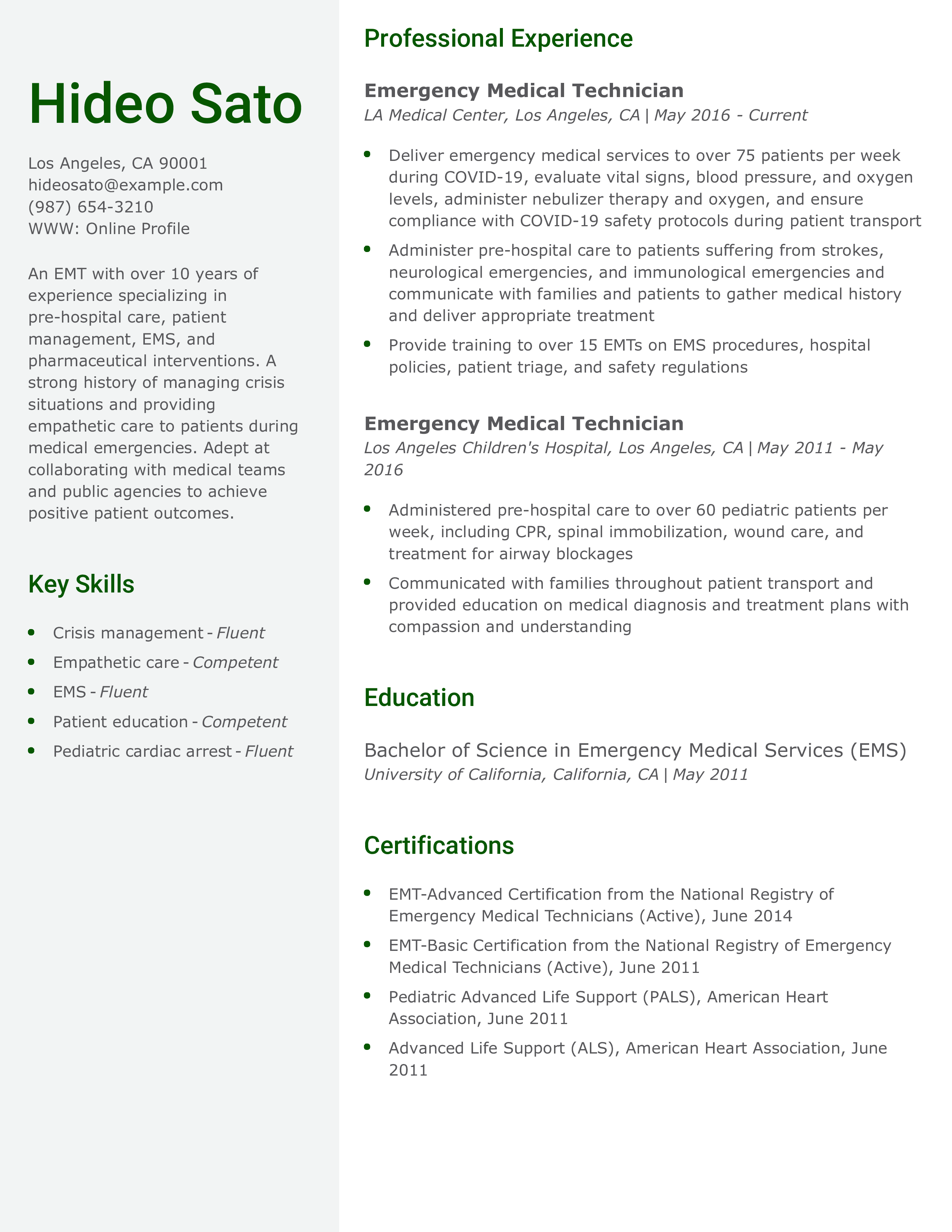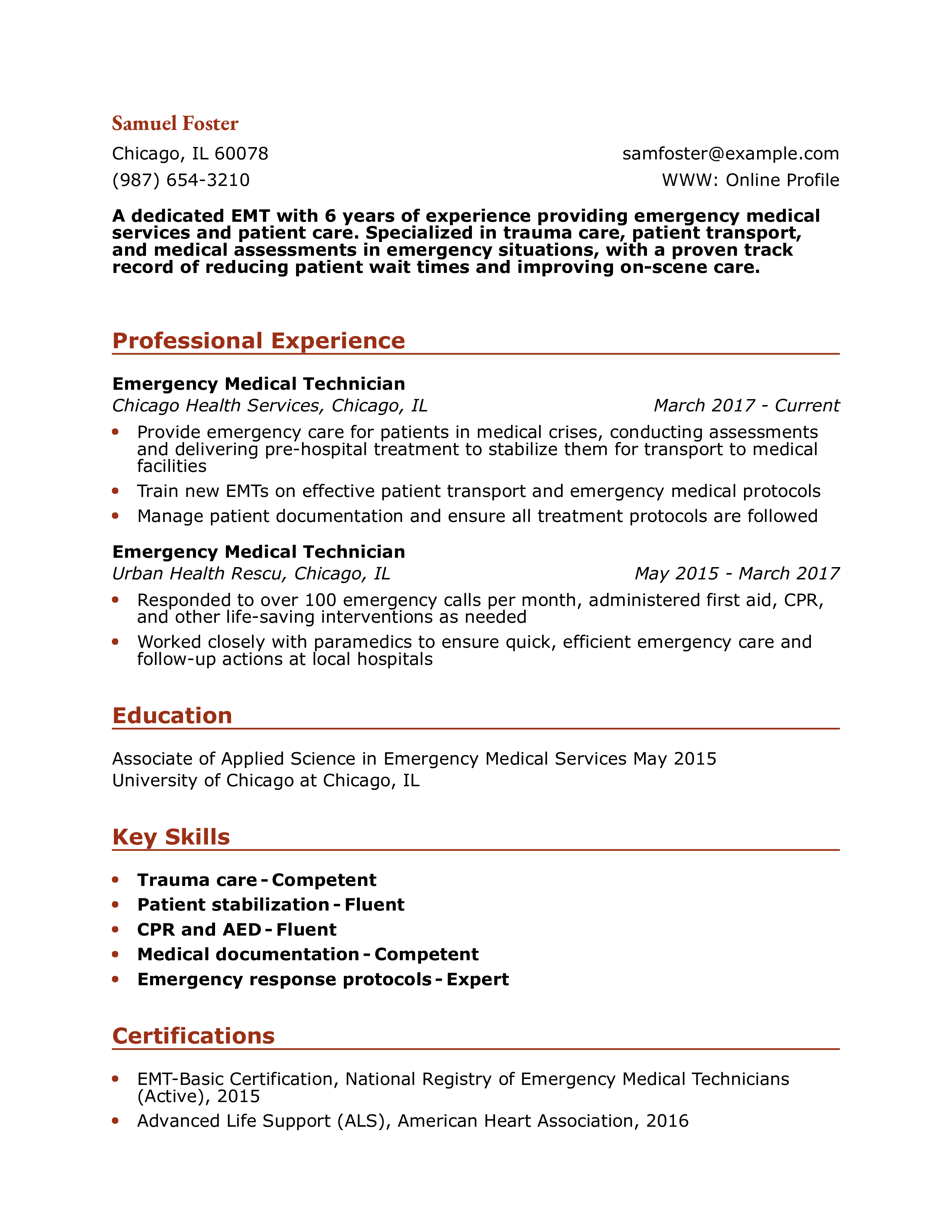 When selecting a resume format, it’s essential to consider the employer's preferences and the specific job posting. A chronological resume format (as seen in our examples above) is typically the most effective for EMTs, as it first displays your career progression and shows your most recent experience. Emphasizing your latest work is particularly important in the health care industry, where skills and technologies constantly evolve. This resume format demonstrates your commitment to the field and willingness to learn and grow professionally.