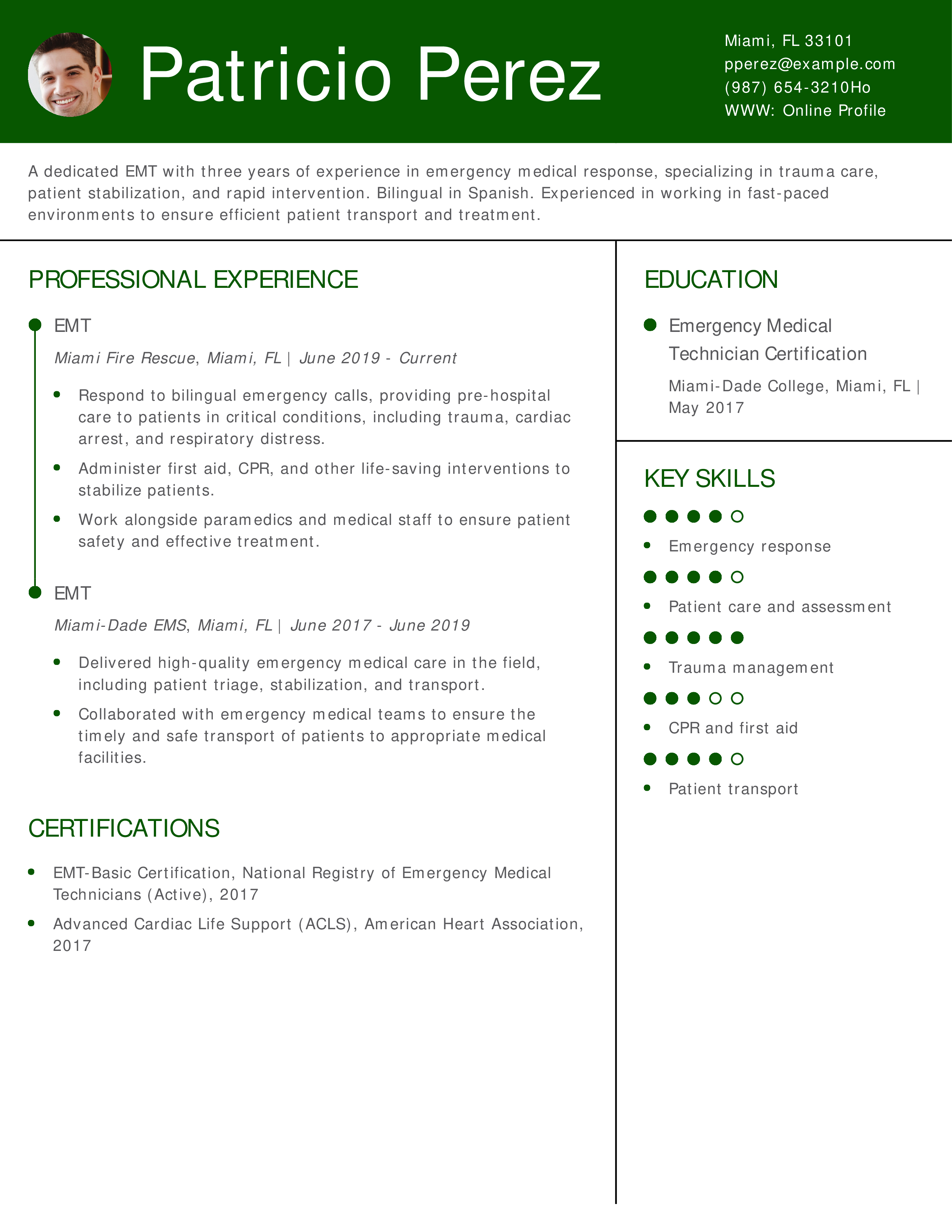 A strong emergency medical technician (EMT) resume that highlights your skills in trauma care, crisis management and patient stabilization can help you stand out in a competitive job market. Learn expert tips and advice on how to write an engaging resume. We’ll guide you through each section, highlighting best practices and providing EMT resume examples to help you create an impactful resume that showcases your medical and emergency qualifications and sets you apart from other candidates.