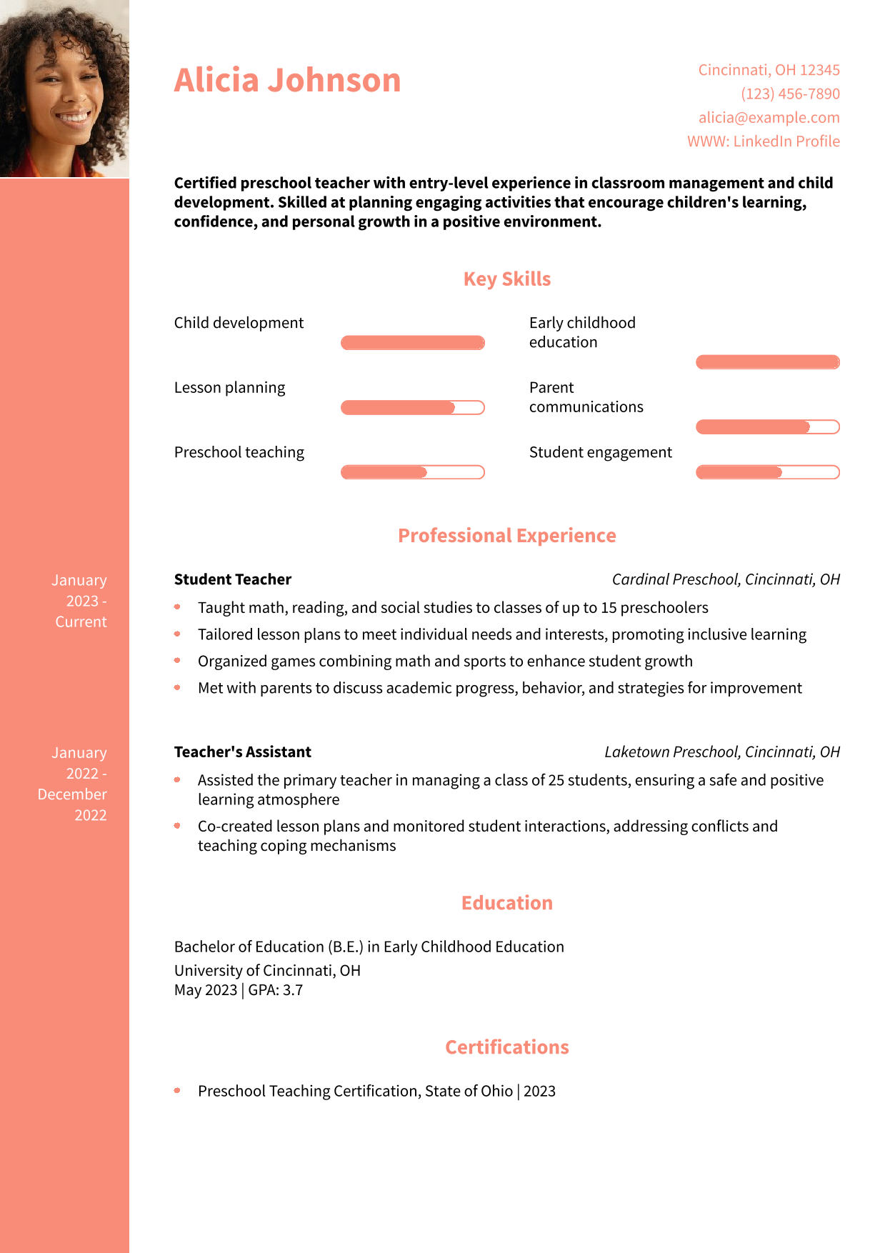 Certified preschool teacher with entry-level experience in early childhood education, classroom management, and child development. Plan engaging activities to facilitate children’s learning, confidence, and personal growth.