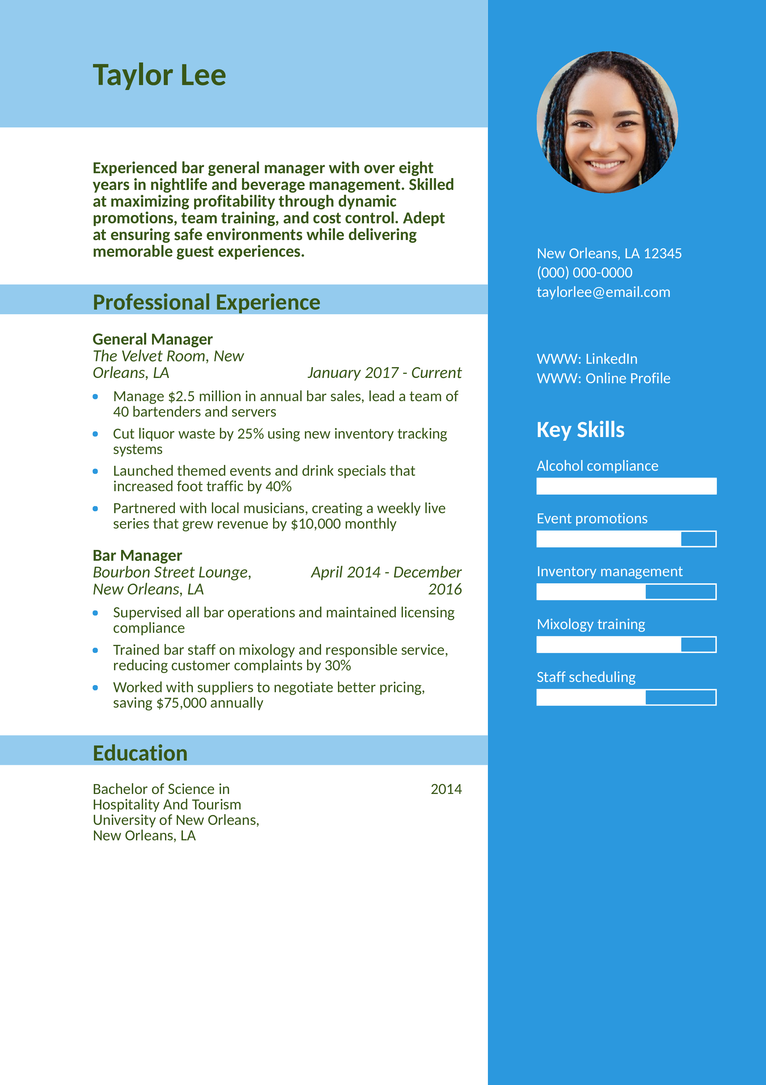 This resume effectively captures the fast-paced nature of bar management, highlighting specific revenue gains and improvements in service quality. Review how to highlight your accomplishments with metrics.