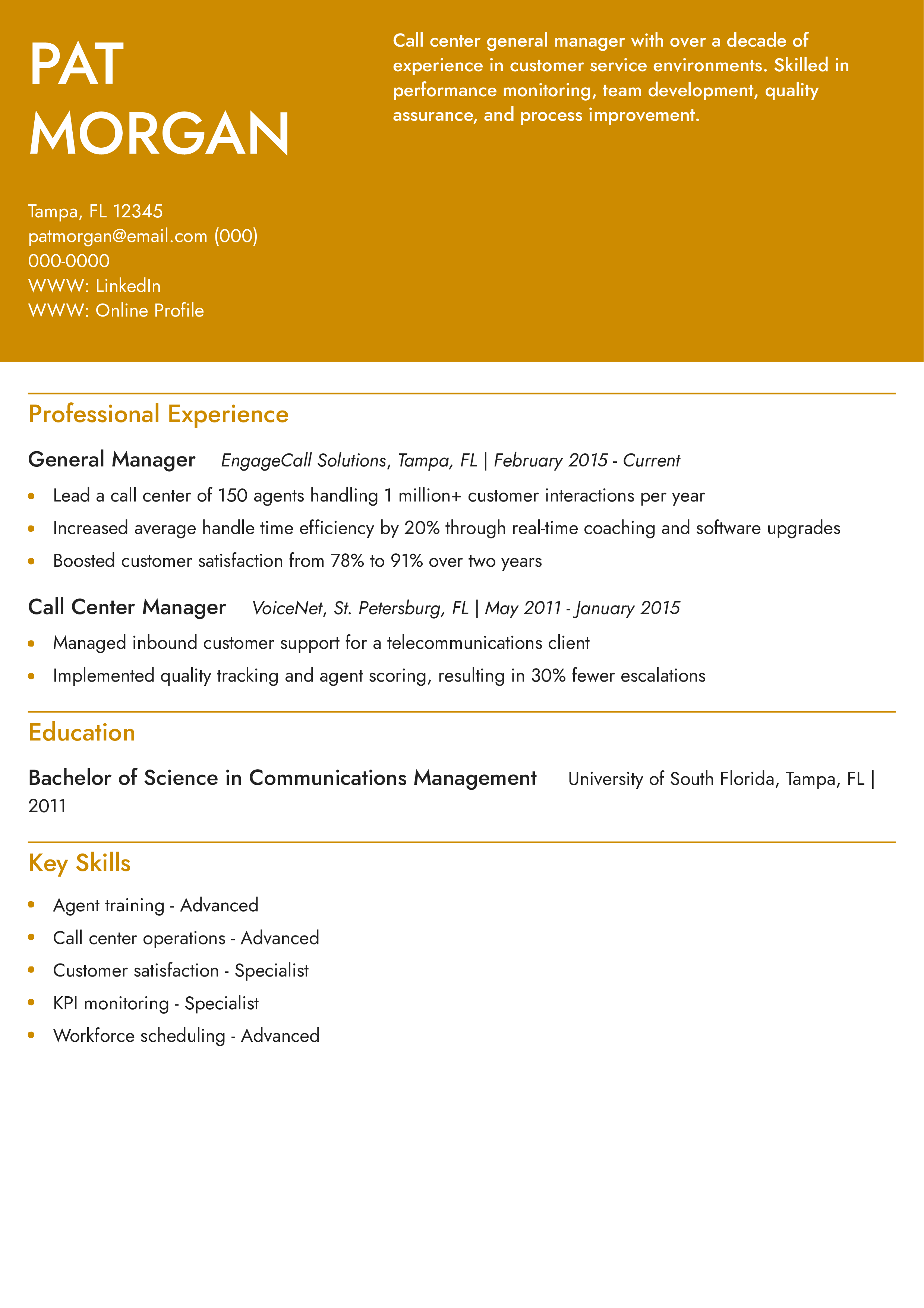 Call Center General Manager Resume