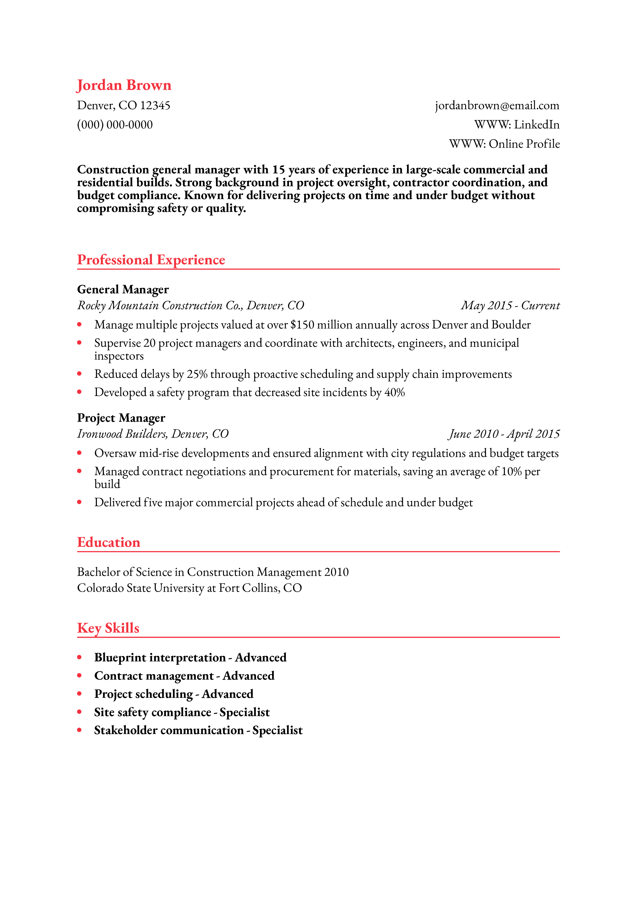Construction General Manager Resume