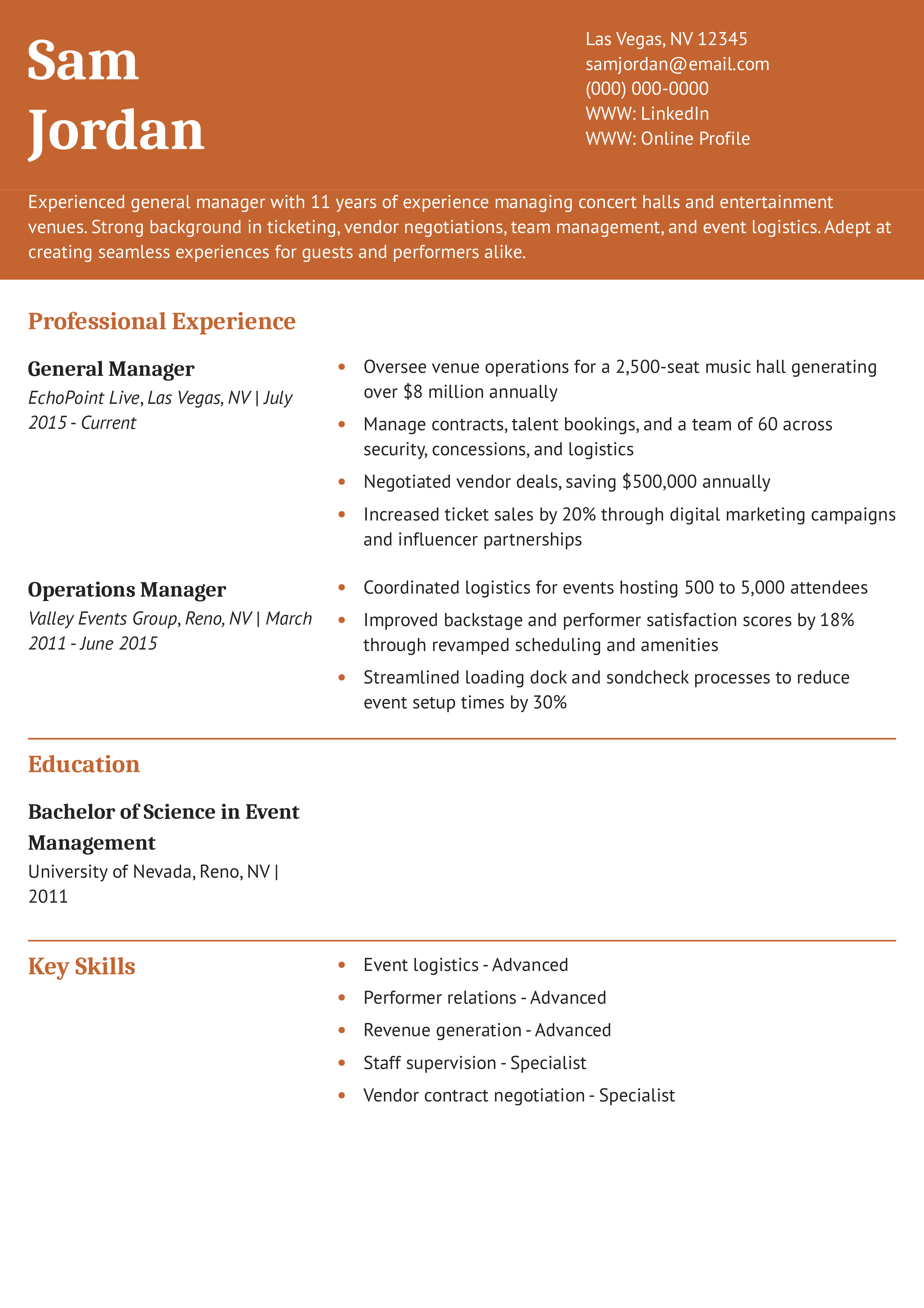 This resume emphasizes performance results like cost savings and increased attendance while showcasing a high level of responsibility in a large venue. Explore how to tailor your resume for entertainment roles.