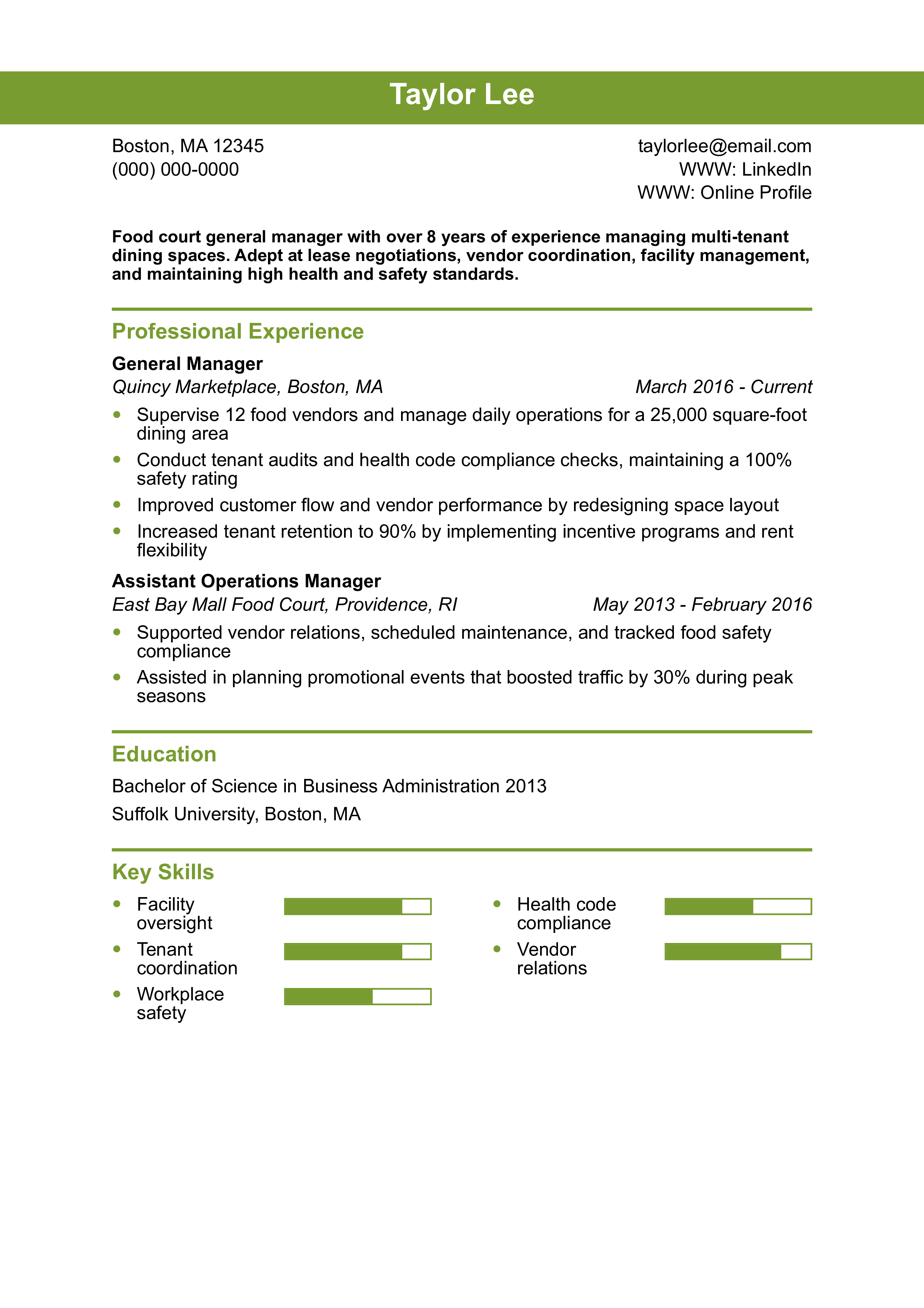 This resume effectively blends food service management with tenant relations and operations. Learn how to highlight multiple business responsibilities.