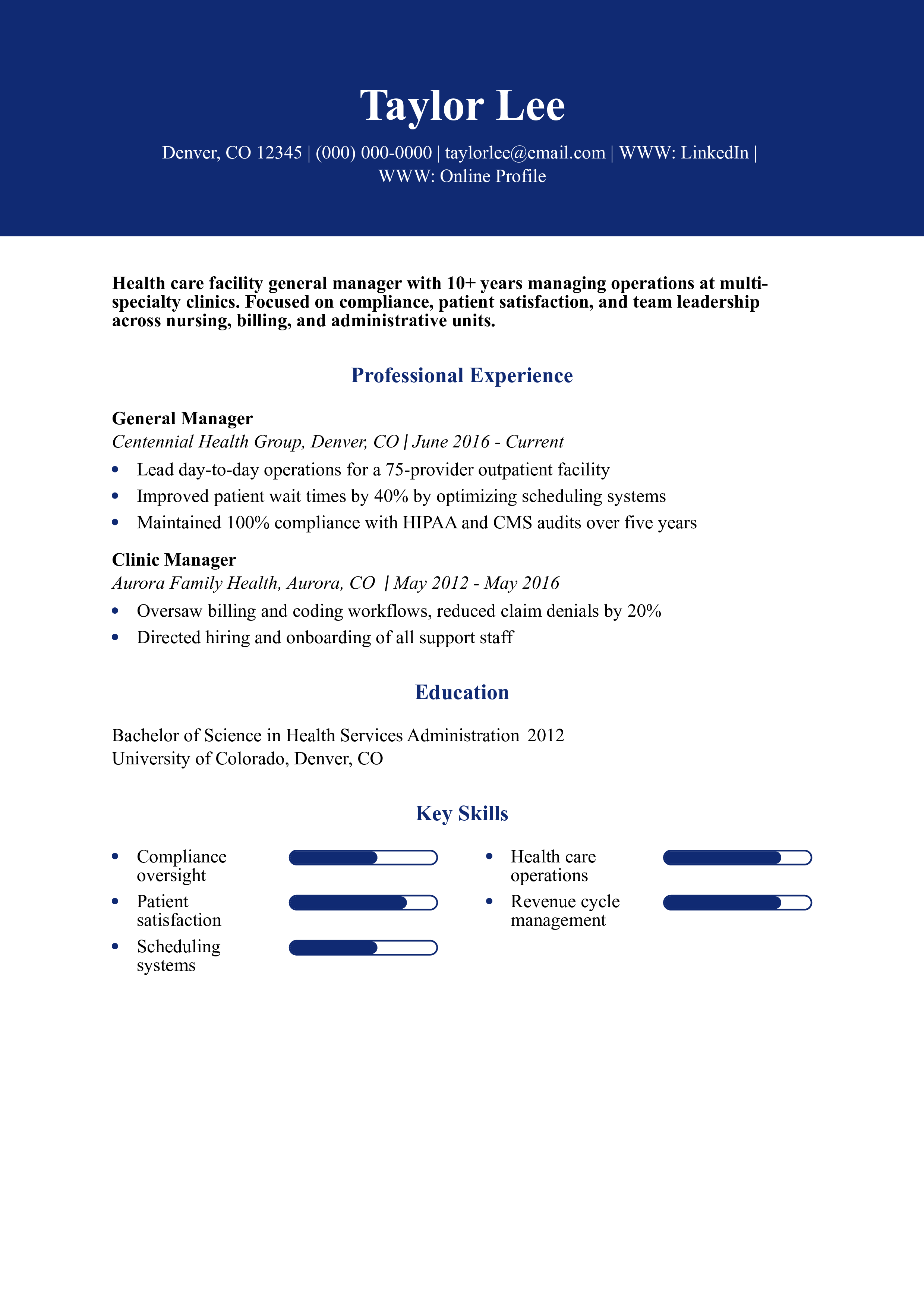 Health Care Facility General Manager Resume