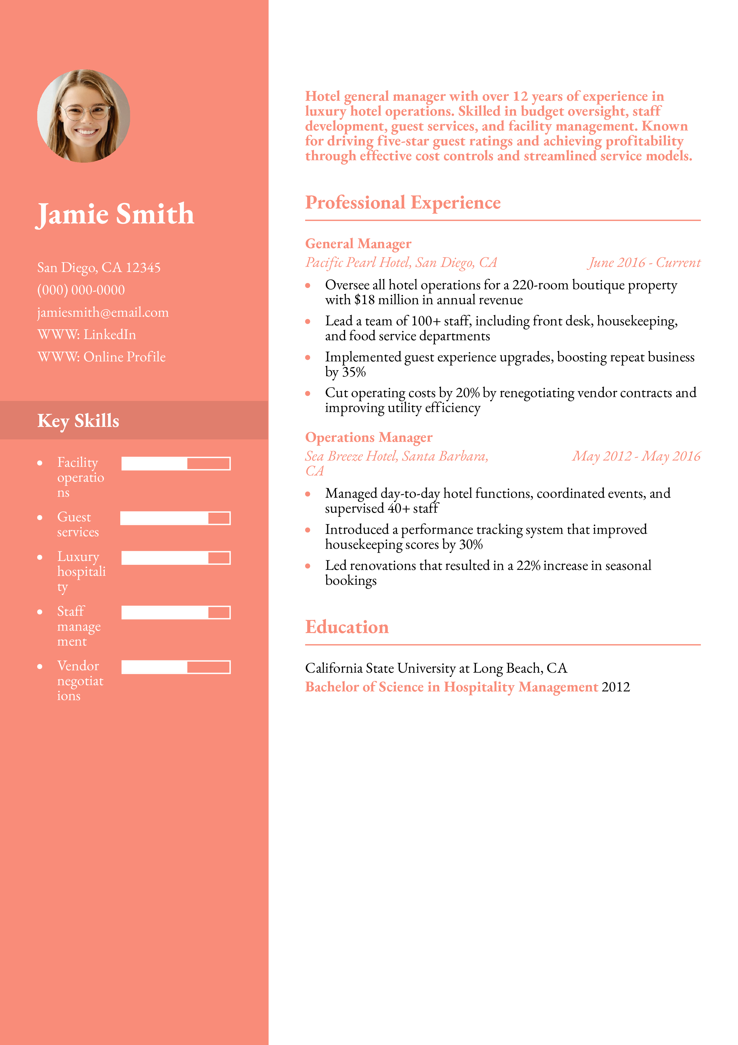 This resume showcases leadership in hotel operations, with quantifiable results including cost savings and improvements in guest satisfaction. A clear professional timeline supports the accomplishments. Read more about how to highlight leadership and results on your resume.