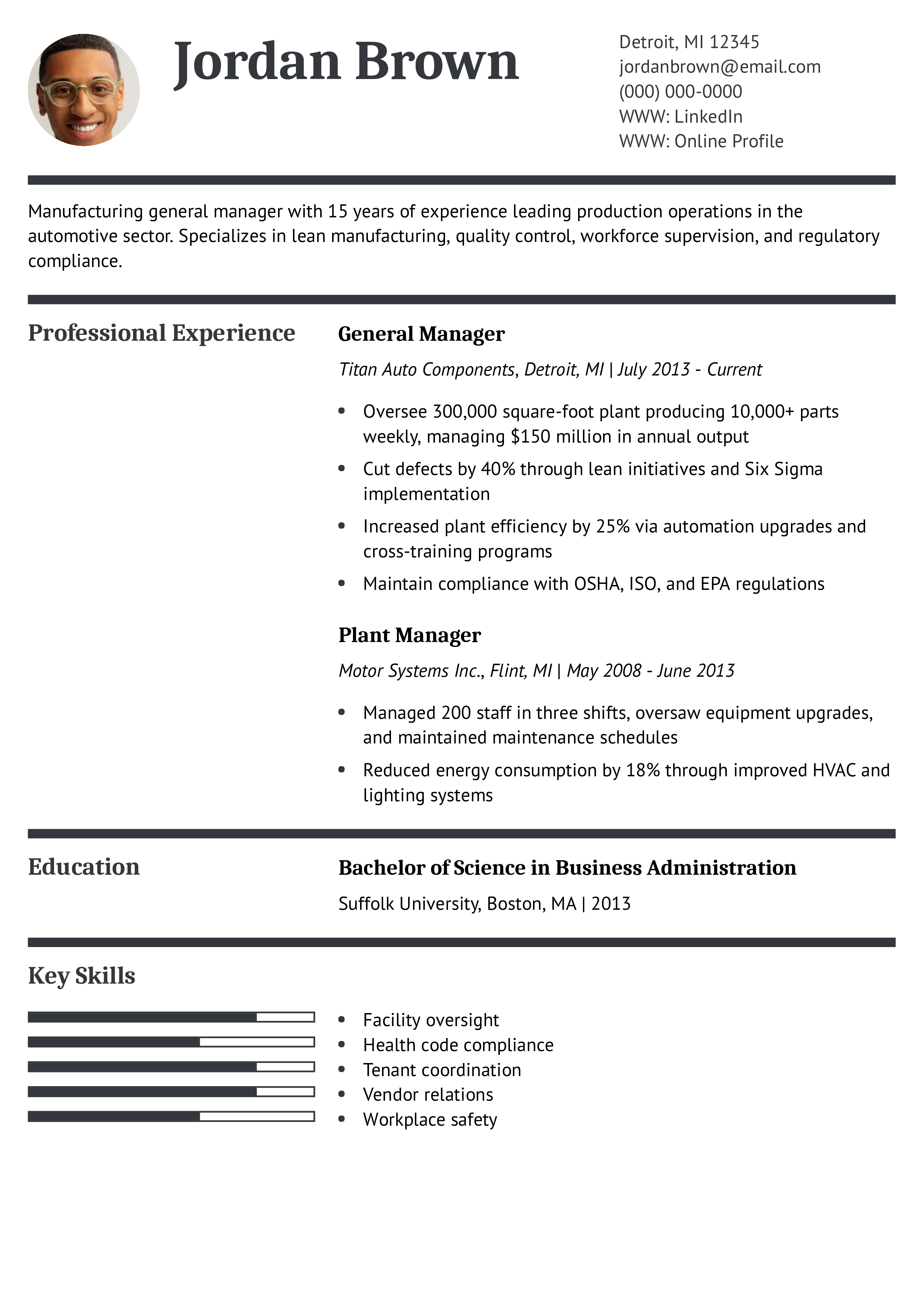 This resume provides measurable operational success and compliance strength, essential in manufacturing. See how to highlight technical and regulatory experience.