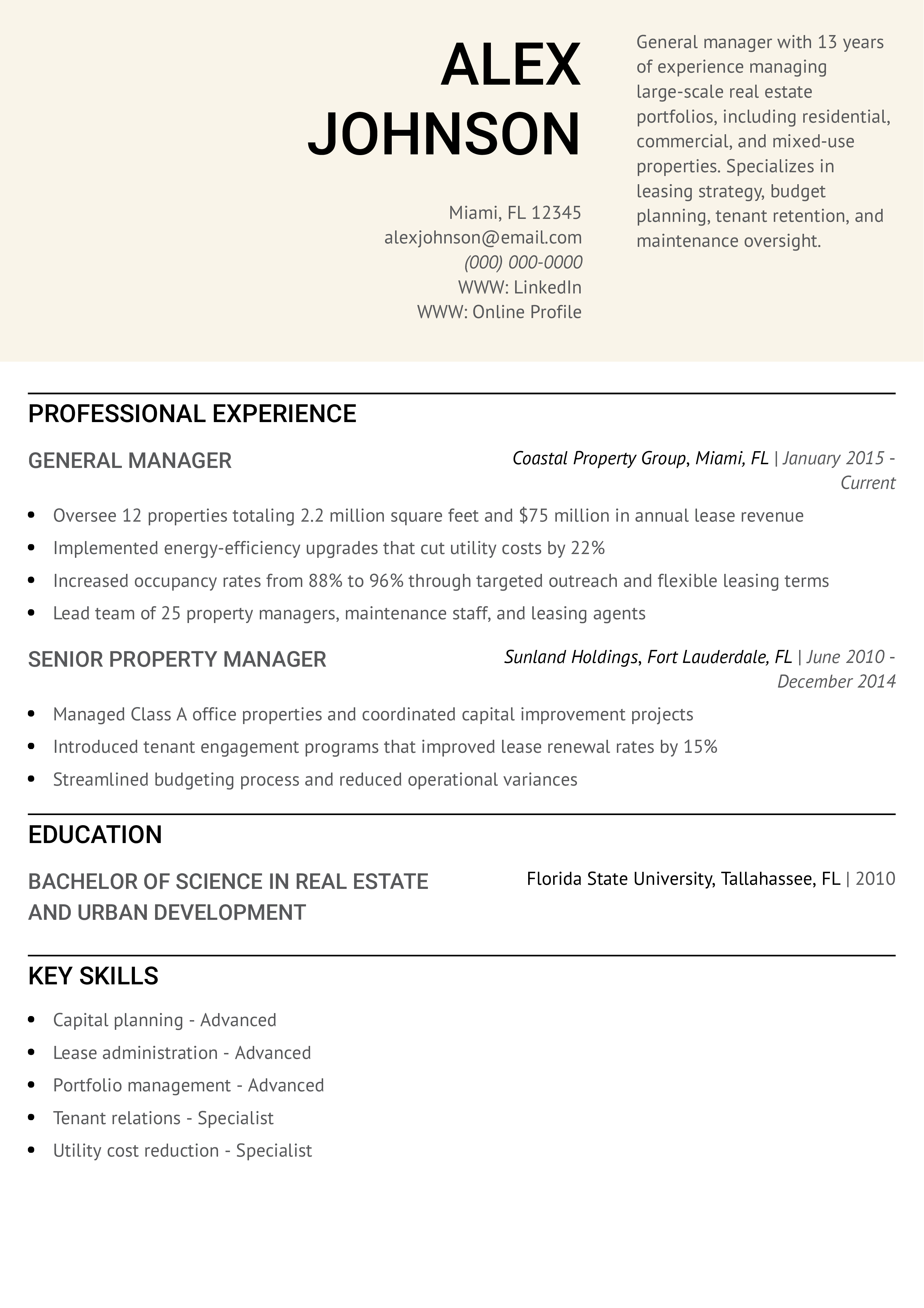 This resume stands out for its detail on large-scale management and tenant-focused improvements. Discover how to write a resume that reflects strategic leadership.